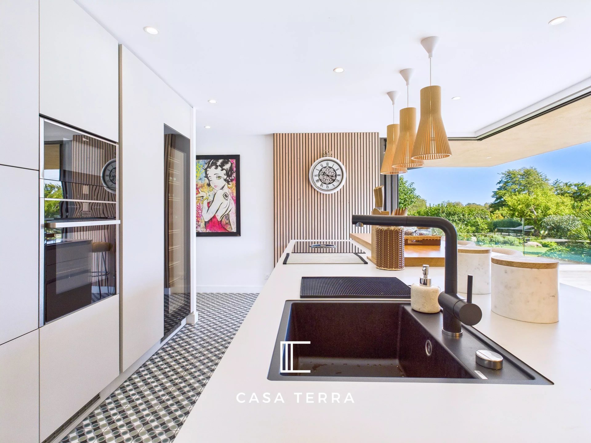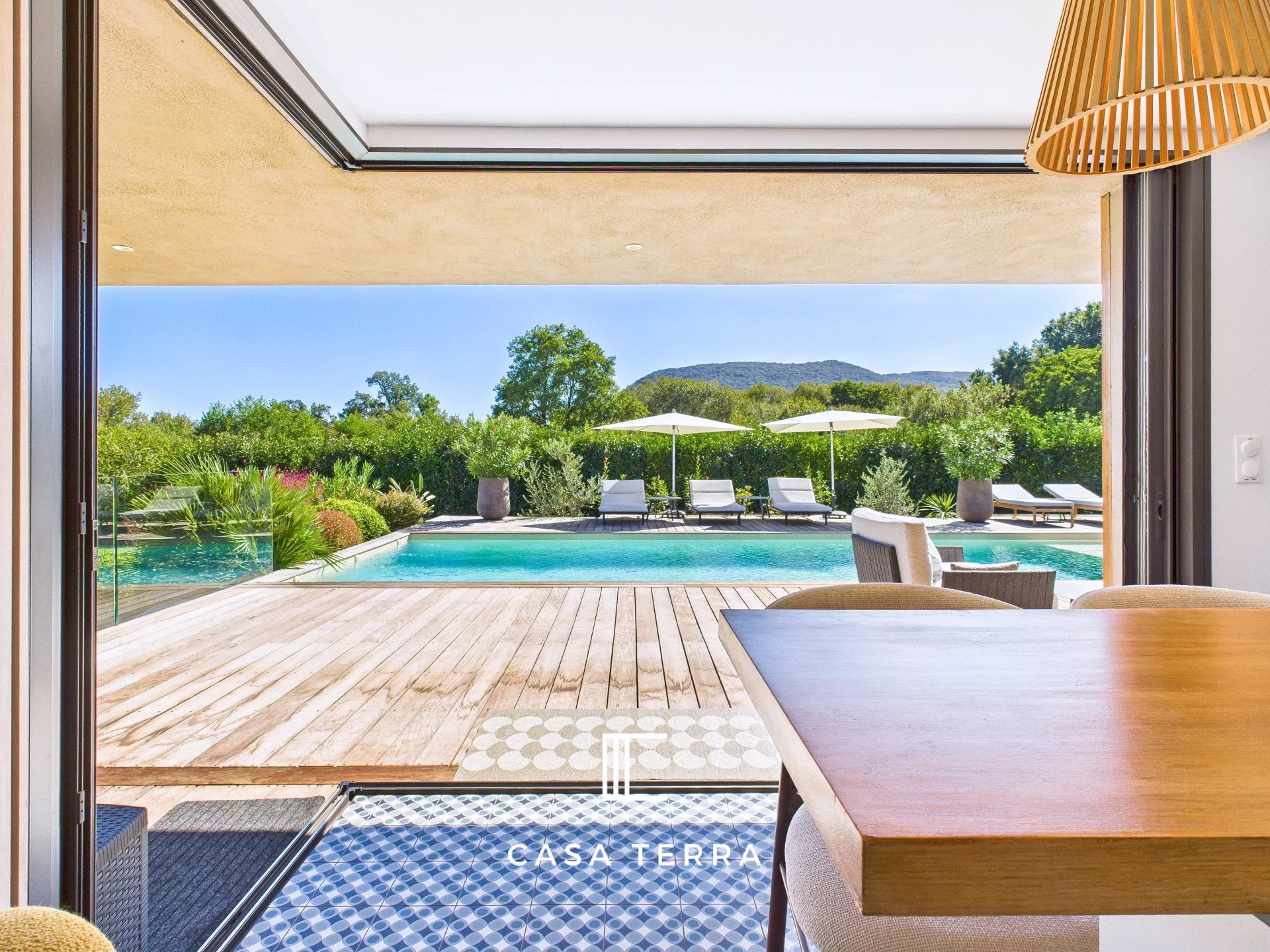 La décoration élégante et épurée de la villa 'Terra' ne vous laissera pas insensible. L'intérieur a été complétement redesigné avec un mobilier de goût et des aménagements en chêne sur mesure. La villa peut être vendue meublée, prête à vivre. La propriété offre des prestations et des matériaux de qualité : climatisation gainable, menuiseries minimalistes de grande hauteur, portail électrique,?
