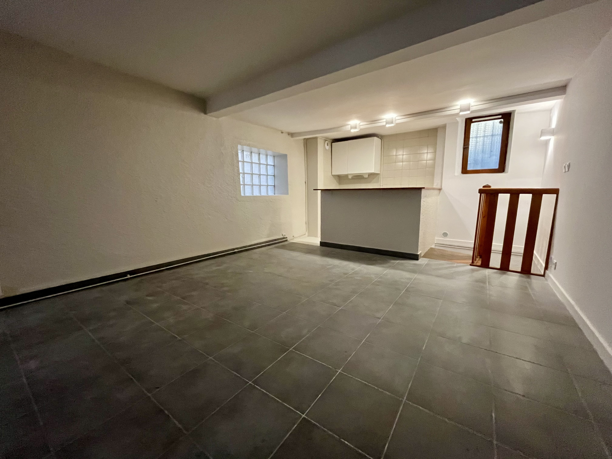 Au 1er étage, vous disposez d'un séjour de 24,3 m2 disposant de 2 fenêtres avec espace kitchenette. Un escalier permet d'accéder au Rez-de-chaussée avec une chambre de 15,7 m2 ( également 2 fenêtres), salle d'eau et WC.