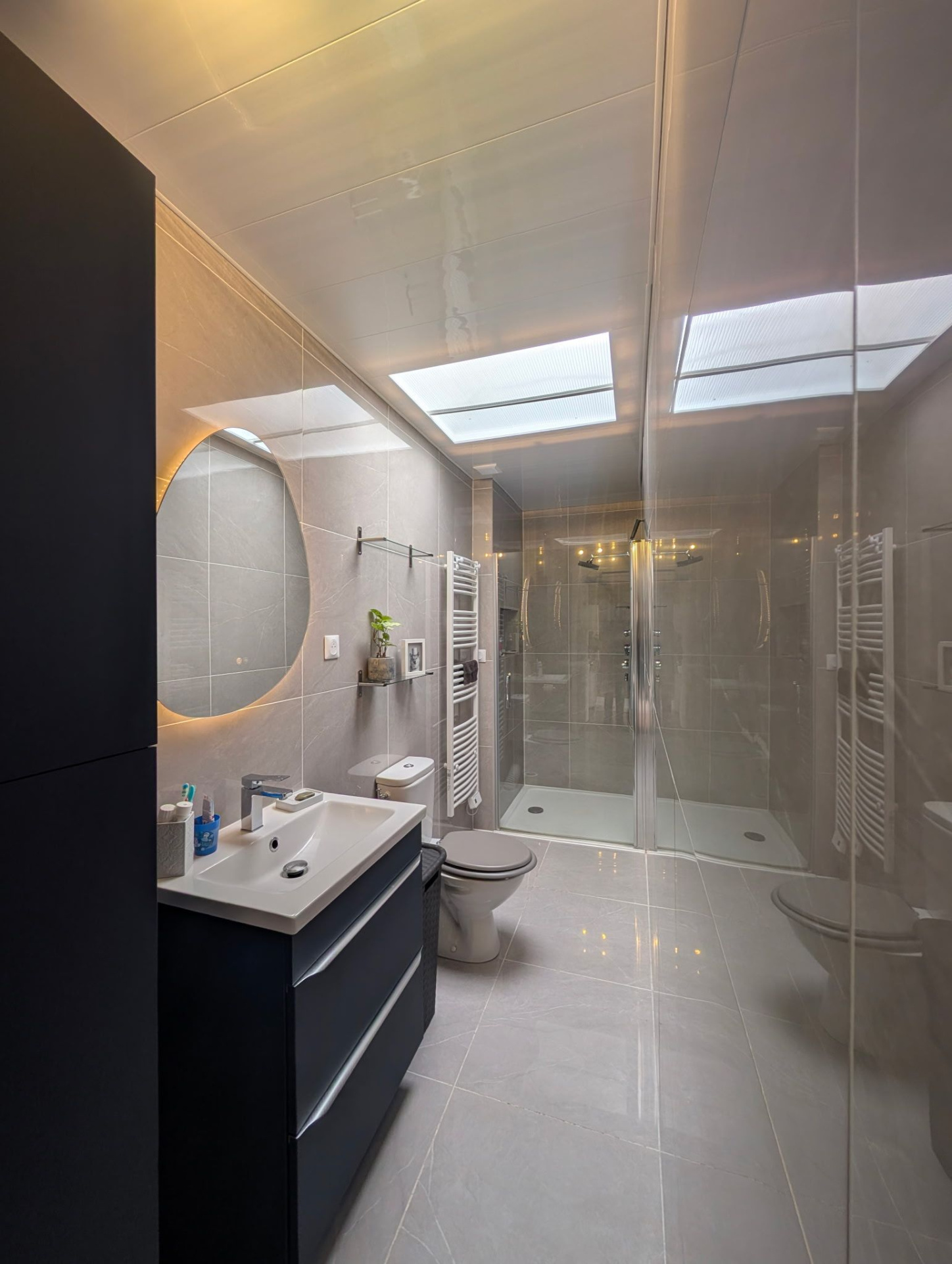 Vous serez accueilli par un sas d'entrée entièrement indépendant, offrant une véritable séparation avec l'extérieur. Celui-ci s'ouvre sur une magnifique cuisine aménagée et équipée, à la fois fonctionnelle et conviviale, qui mène ensuite à une belle pièce de vie de plus de 35m2. Cet espace est particulièrement lumineux grâce à ses puits de lumière et à sa baie vitrée donnant directement sur la terrasse. Le rez-de-chaussée dispose également d'une salle de douche avec WC.