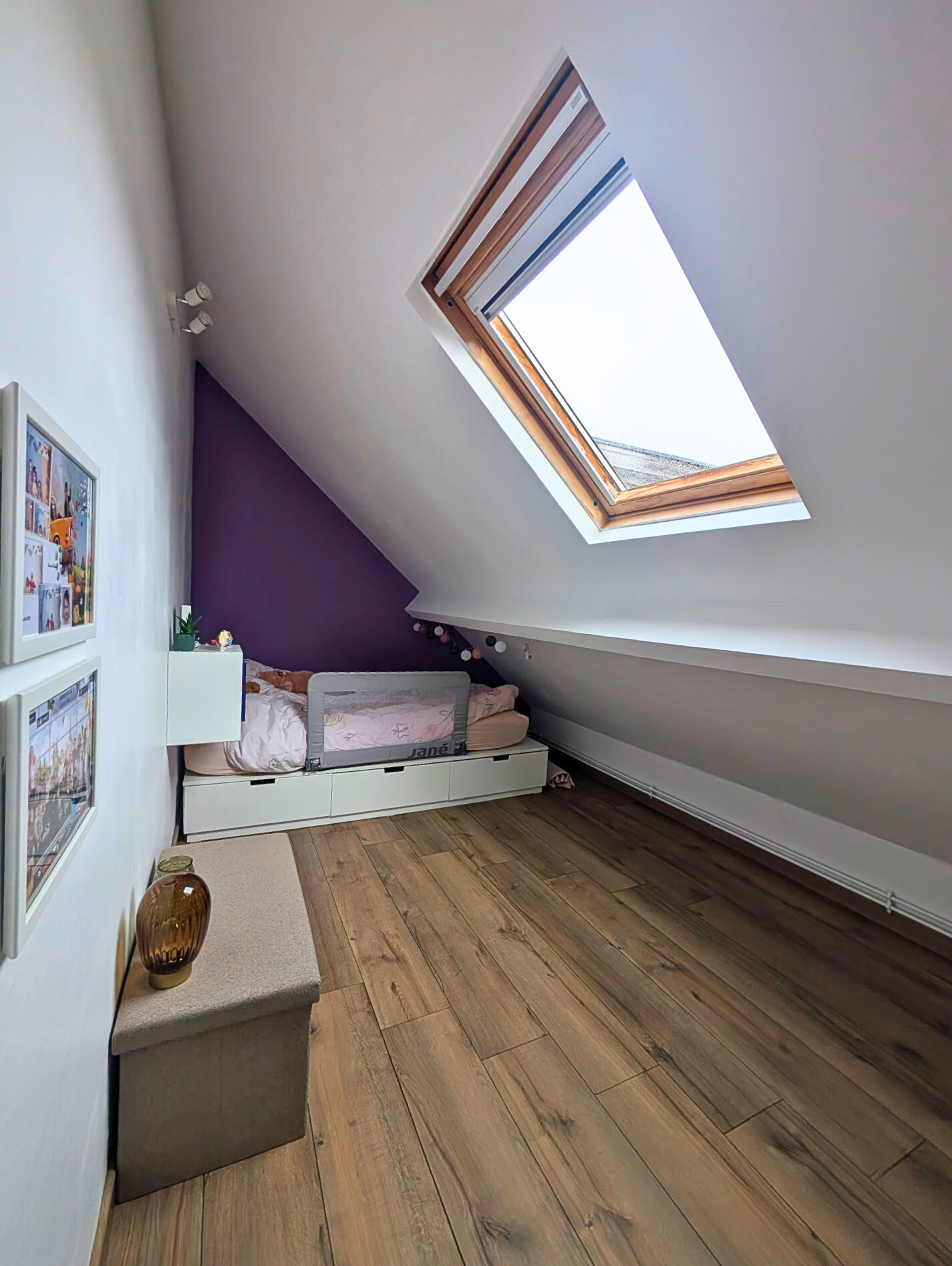 A l'étage, l'espace nuit se compose de deux chambres, dont une chambre enfant.
