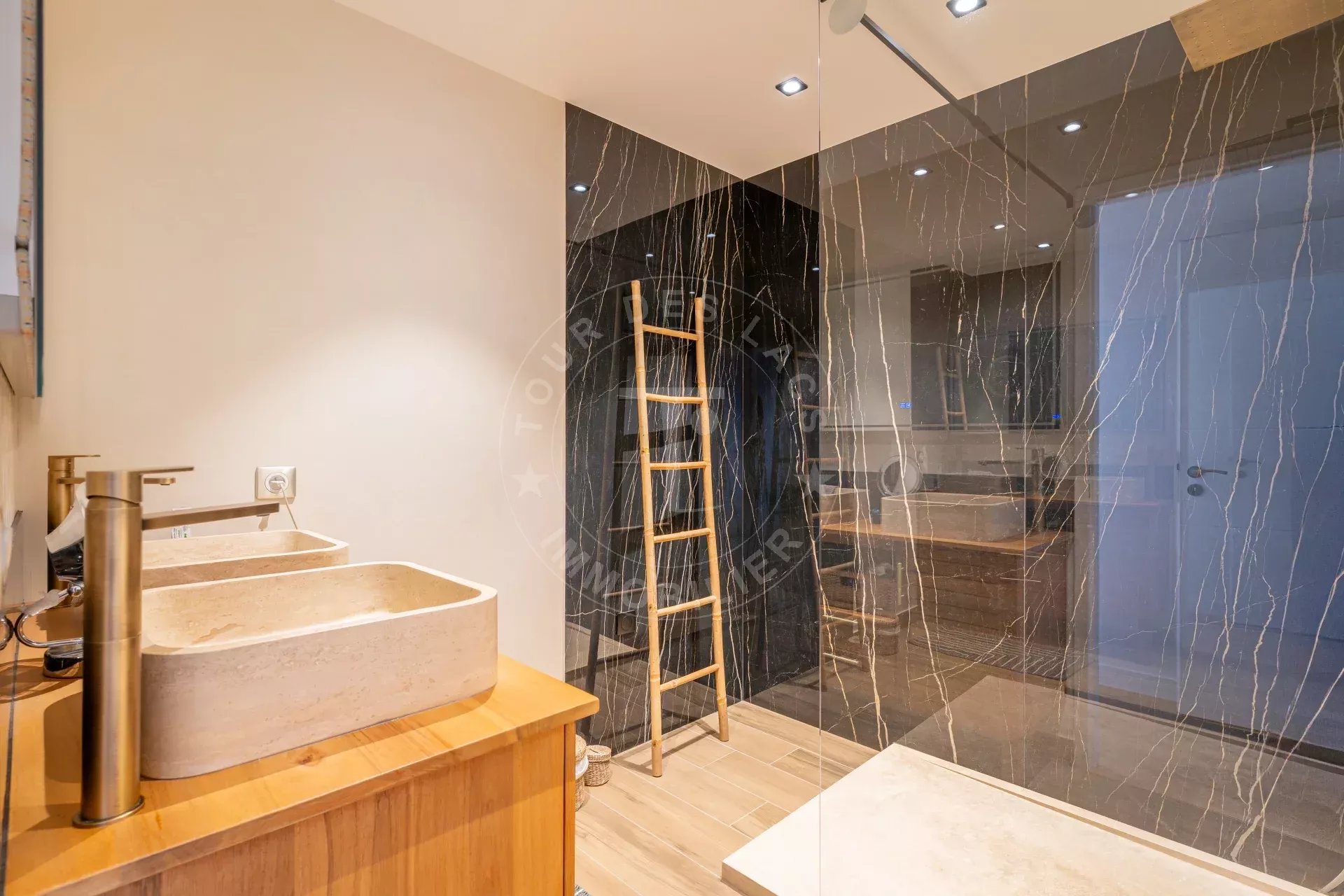 L’appartement bénéficie de prestations de qualité : cuisine haut de gamme, parquets en bois, salles de bains soignées.