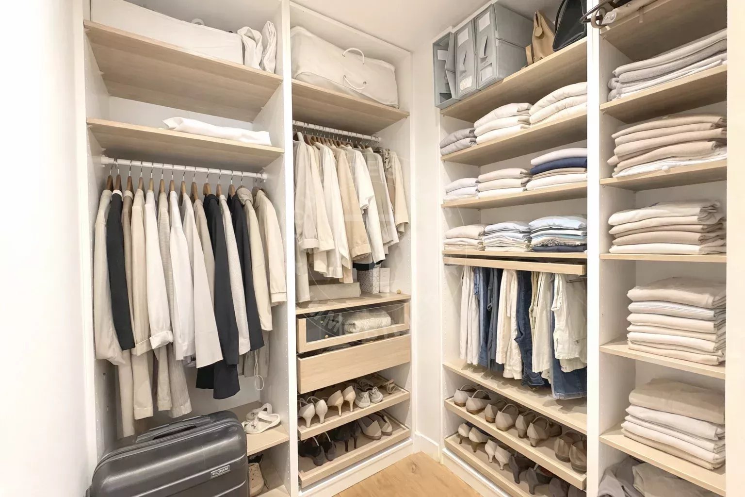 La cuisine réalisée sur mesure, les placards intégrés toute hauteur, les rangements présents dans chaque espace, ainsi que la buanderie indépendante et insonorisée, témoignent d’un projet pensé dans le détail pour un confort de vie optimal au quotidien.