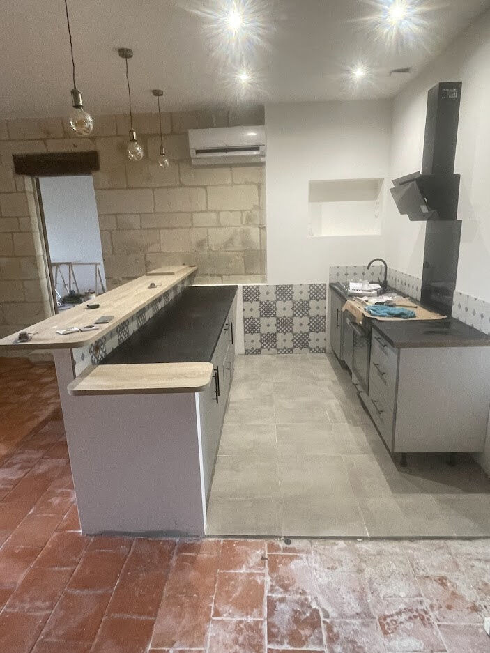 Une grande pièce de vie lumineuse, ouverte sur une cuisine aménagée et entièrement équipée (four, micro-ondes, plaque électrique refrigerateur vaisselles. )