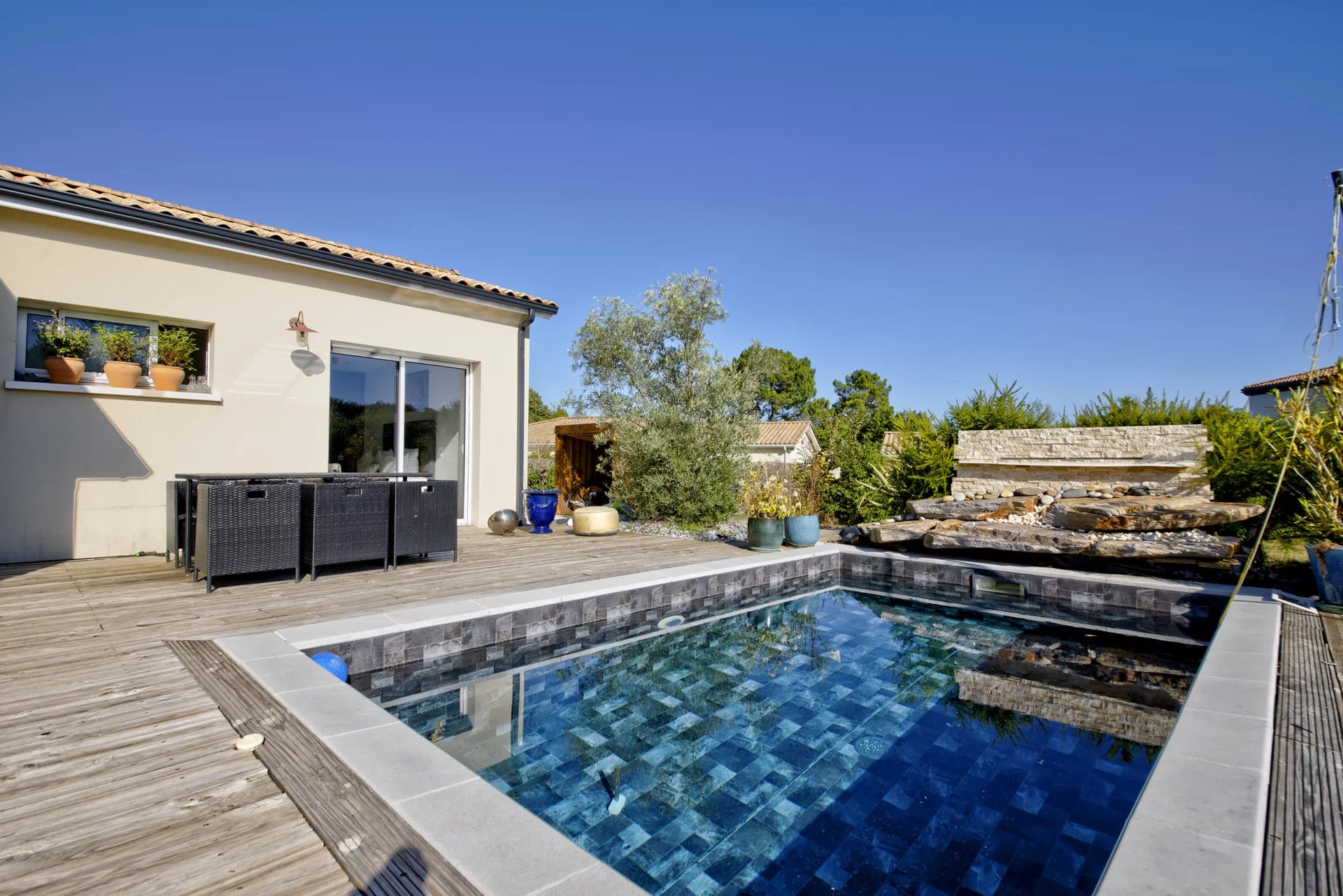 LA BRÈDE Dans un cadre naturel privilégié, loin de toutes nuisances, venez découvrir cette maison contemporaine de 2018, reposant sur une parcelle de 1542 m². Lumineuse et fonctionnelle, elle se compose d'une grande pièce de vie avec cuisine ouverte, de trois chambres dont une suite parentale avec dressing, salle d'eau et WC, d'une salle de bains, d'une buanderie et d'un garage. Un studio attenant à la maison vous permettra de créer une quatrième chambre ou de bénéficier d'un potentiel locatif. Une grande terrasse et une piscine de 5x3 viennent agrémenter le tout. Propriété entièrement clôturée et arborée.