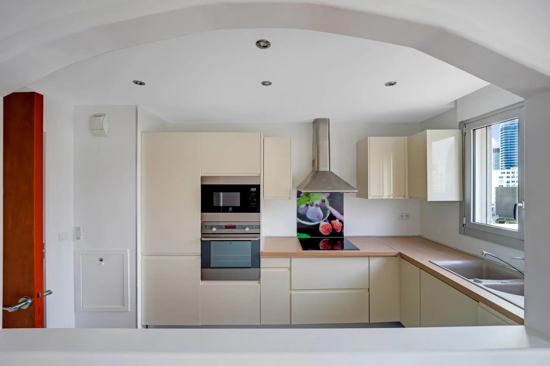 semi ouverte, 2 chambres avec placards intégrés, une salle d'eau avec fenêtres, un toilette séparé. des placards dans le dégagement, Une cave et un parking (valeur 15 000€) compris dans le prix de vente de l'appartement.