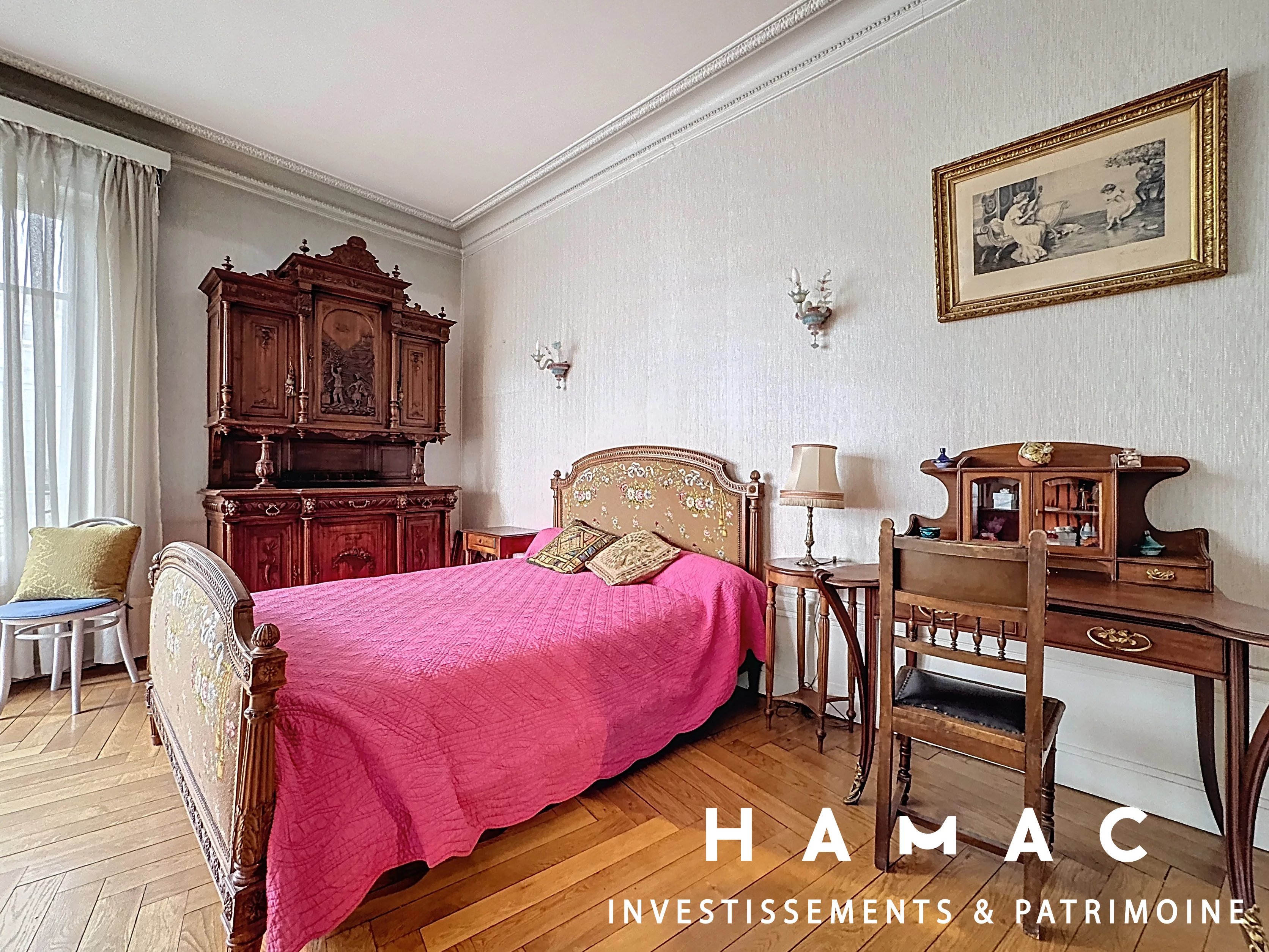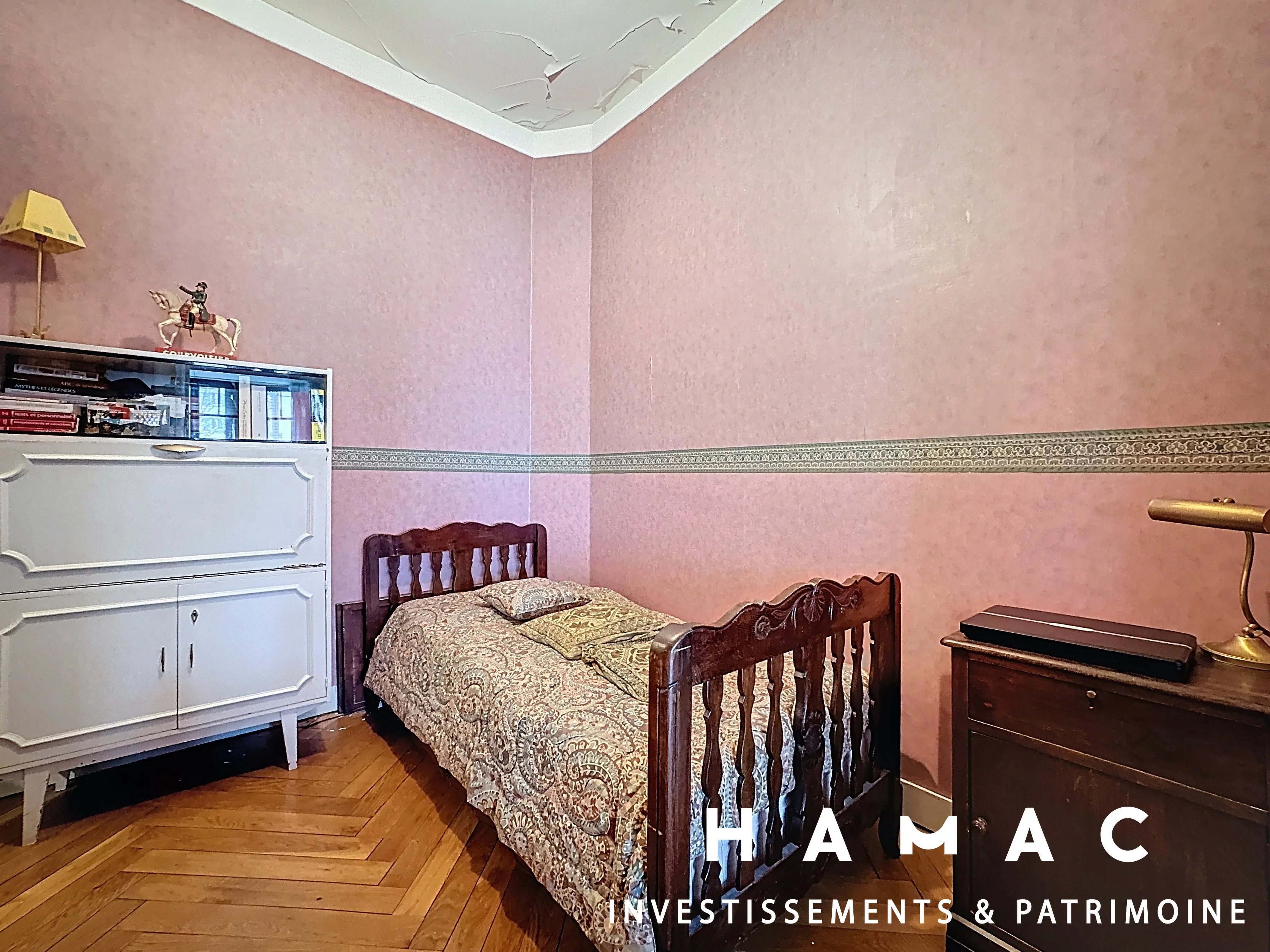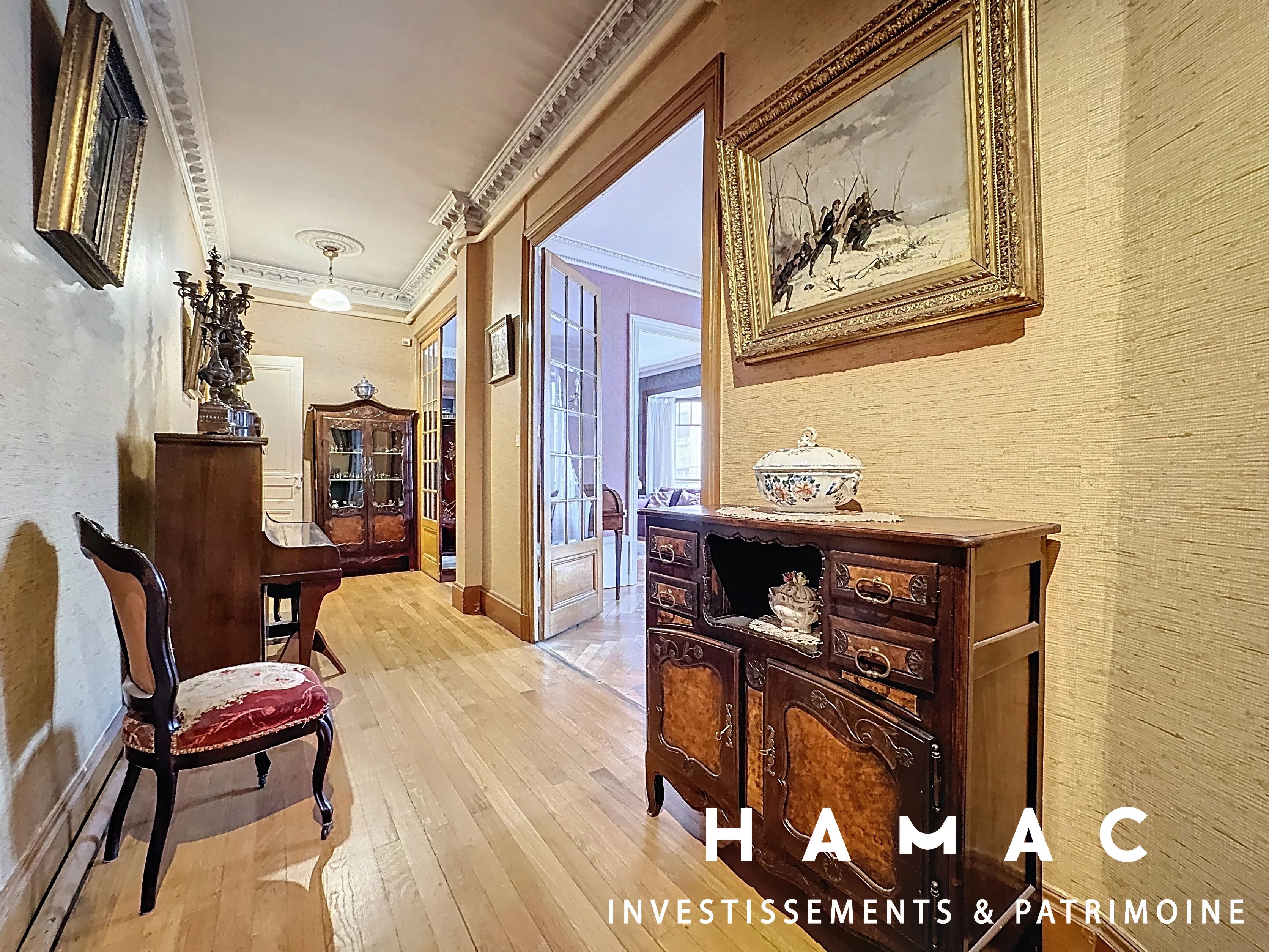 Installé dans un immeuble Art Déco de belle facture, ce bien séduit par la qualité de ses volumes et par l’authenticité de ses éléments anciens. Les parquets en chevron, les moulures, les cheminées décoratives et la hauteur sous plafond apportent une atmosphère chaleureuse et raffinée.
