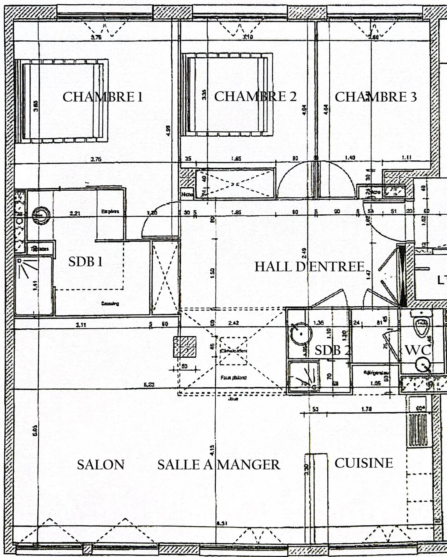 L'appartement est traversant Nord/Sud et bénéficie d'une hauteur sous plafond confortable de 2.70 mètres.