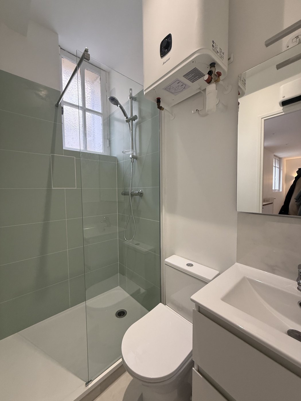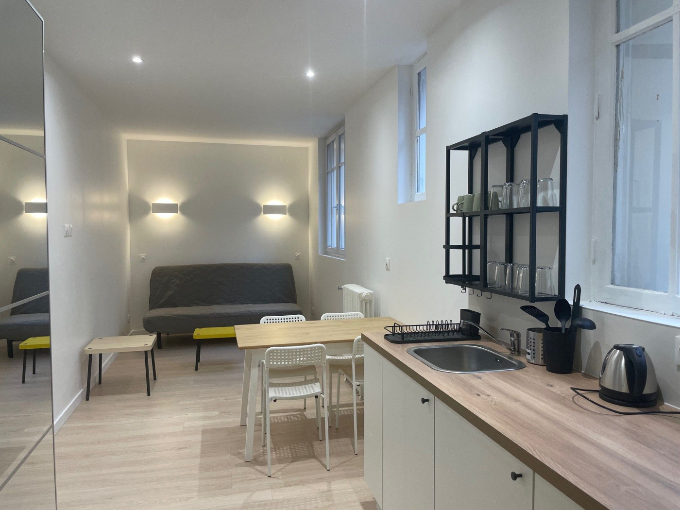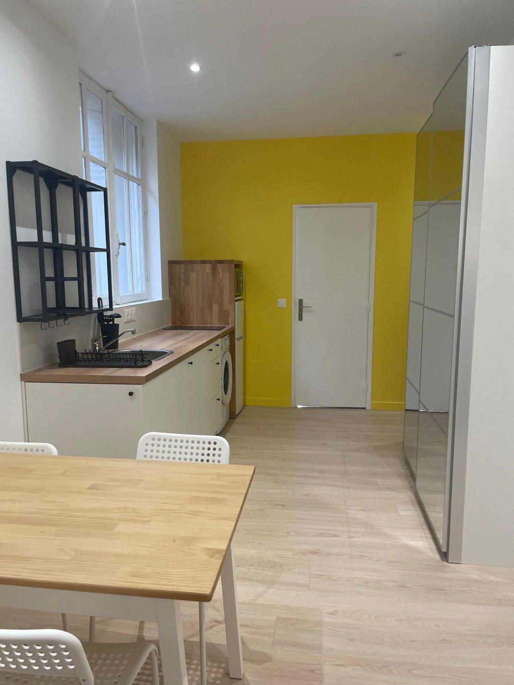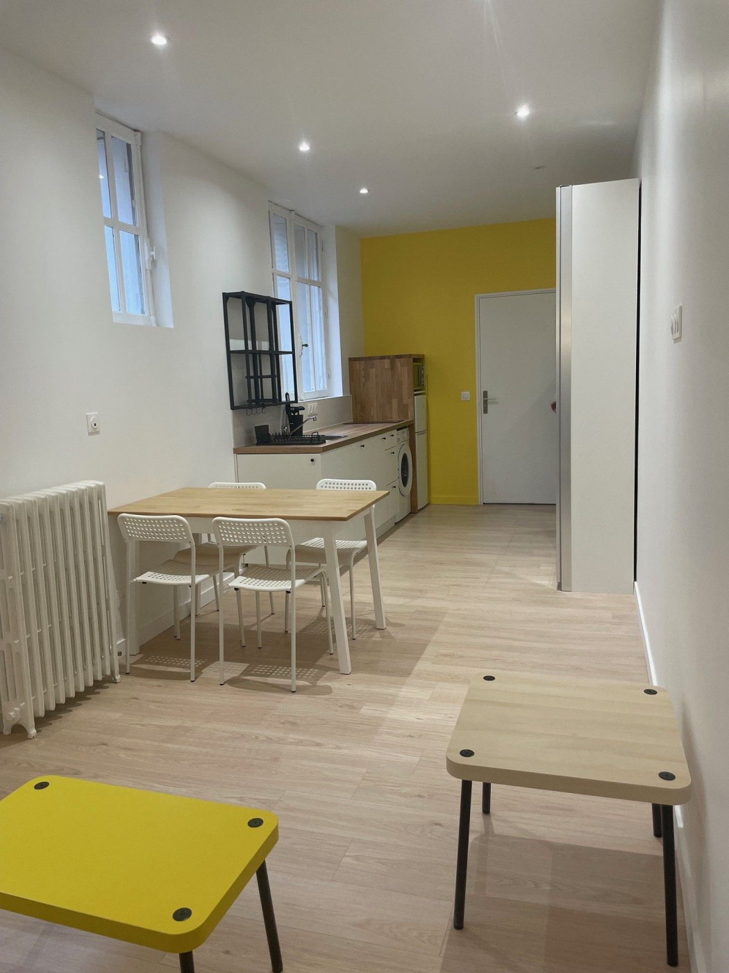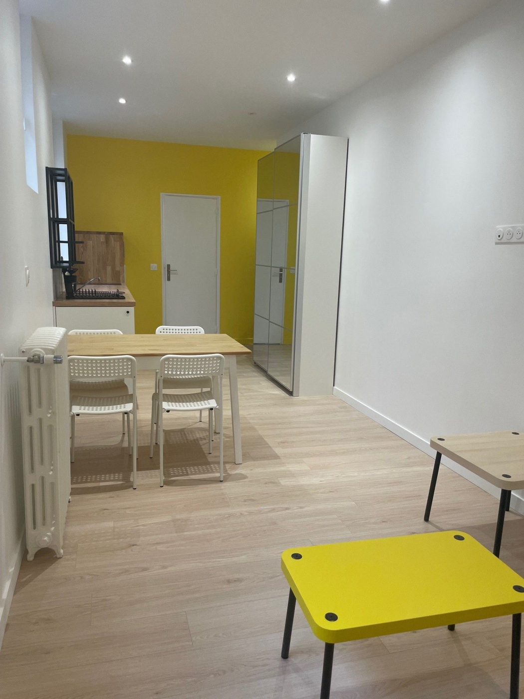 Grand studio totalement refait à neuf, il se situe au Rdc sans vis à vis ,calme, lumineux avec ses grandes fenêtres double vitrages, comprenant une belle pièce de vie ,une cuisine ouverte toute équipée(réfrigérateur ,plaque, lave linge, micro onde, une salle d'eau et de nombreux rangements. CHAUFFAGE ET EAU CHAUDE INCLUS DANS LE LOYER.