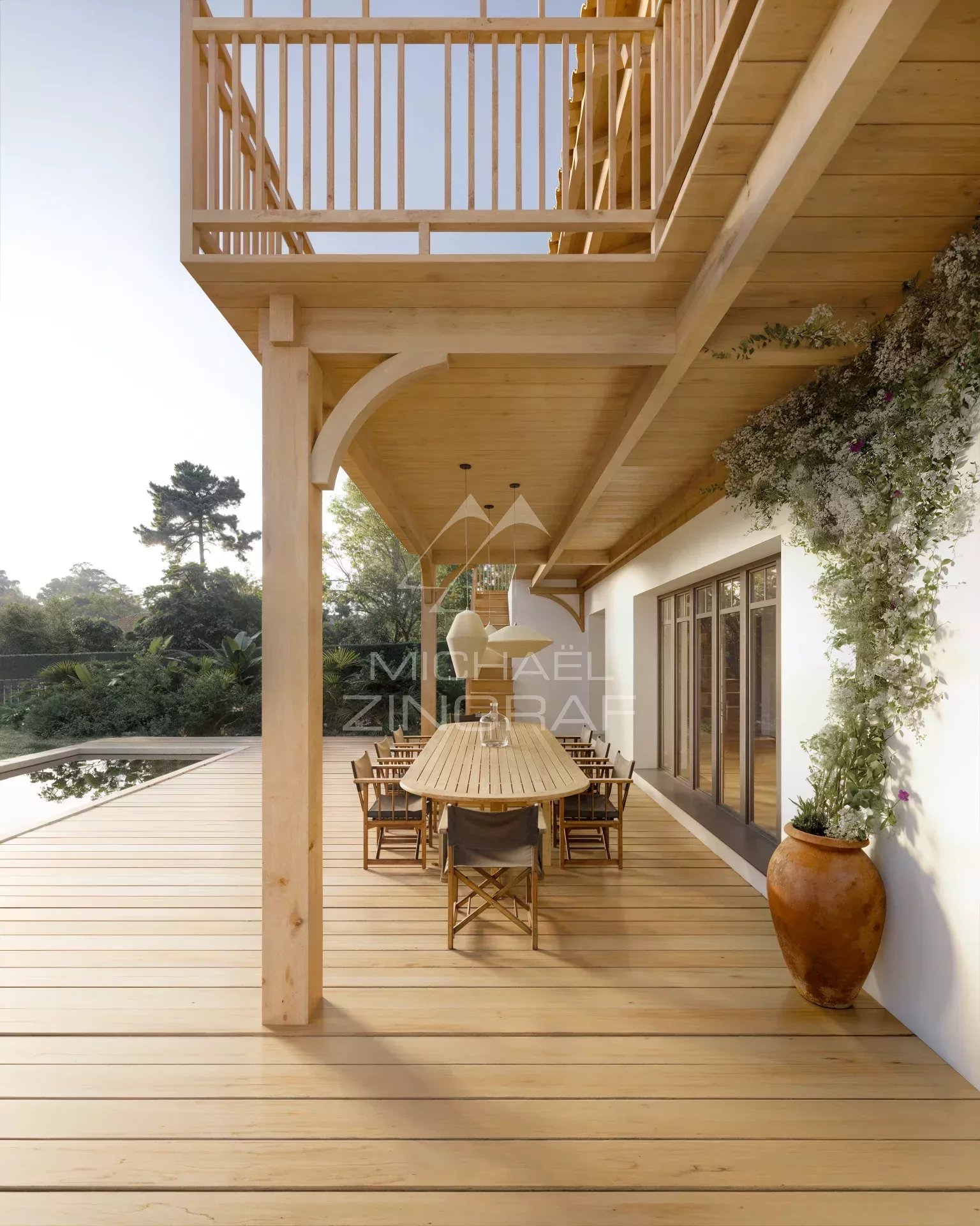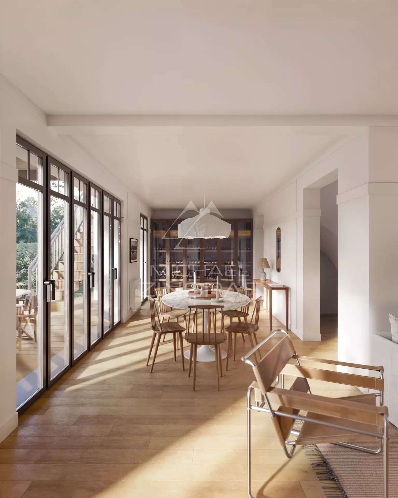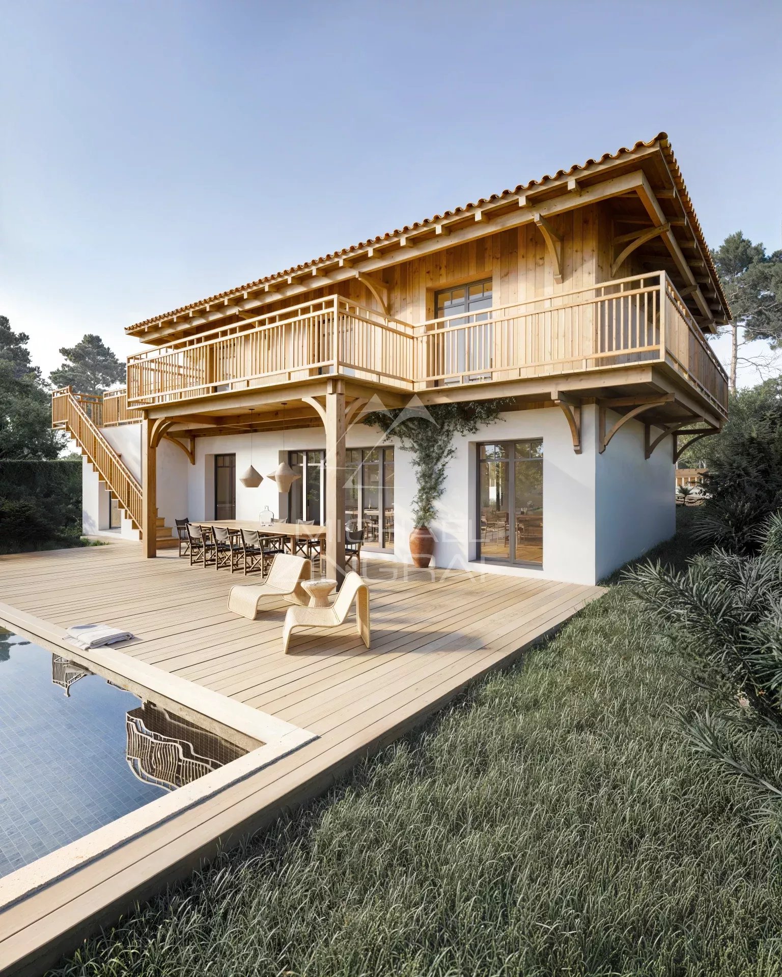 Située sur les hauteurs du Pyla, dans un environnement résidentiel préservé, cette maison rénovée bénéficie d’une vue dégagée sur le Bassin d’Arcachon. La propriété développe environ 176 m² habitables et fait l’objet d’une rénovation, réalisée avec des matériaux de qualité. L’agencement a été conçu pour privilégier la lumière, les perspectives et la relation avec les espaces extérieurs. L’espace de vie, orienté vers la piscine et la vue, intègre une cheminée et s’ouvre largement sur l’extérieur. La cuisine, indépendante, est aménagée et entièrement équipée. La partie nuit comprend quatre chambres, chacune disposant de sa salle d’eau avec toilettes. Plusieurs d’entre elles bénéficient d’une ouverture directe ou d’une orientation vers la piscine et la vue sur le Bassin. Des toilettes indépendantes complètent l’ensemble. Un ascenseur dessert le coin nuit du premier étage et apporte un confort supplémentaire. Implantée sur une parcelle close et paysagée de 855 m², la maison dispose d’une piscine d’environ ainsi que d’un garage.