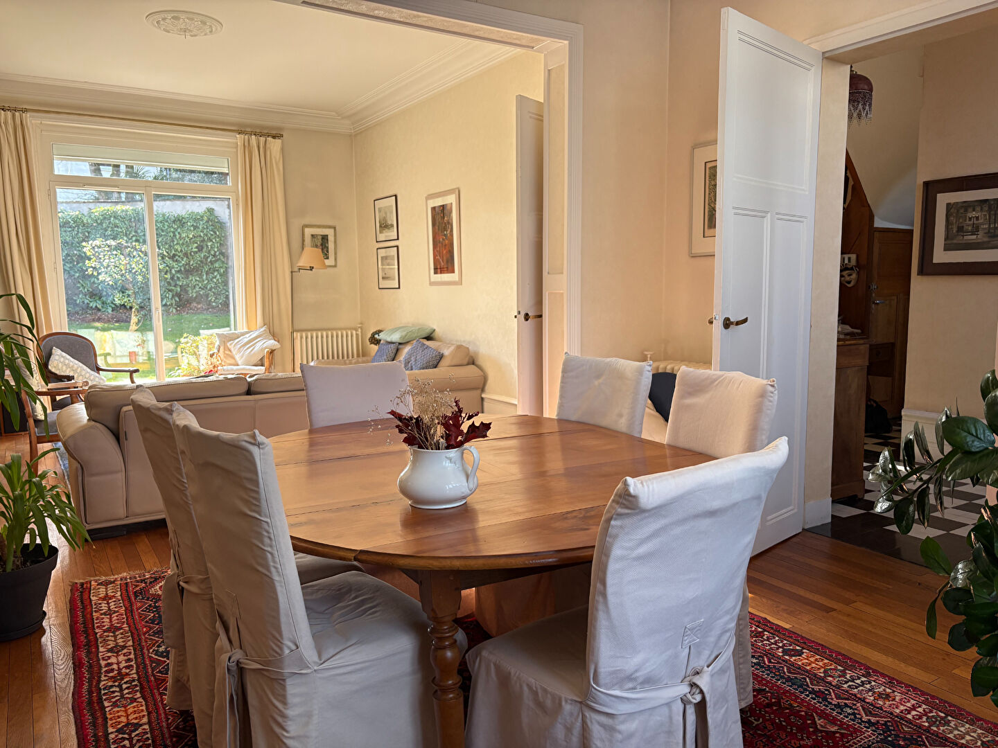 Nantes Canclaux Mellinet, maison de caractère dans une rue calme avec garage et jardin exposé Sud-Ouest Entrée, séjour salon traversant de plain pied sur la terrasse et le jardin Sud-Ouest, cuisine dinatoire aménagée équipée donnant sur la terrasse, à l'étage trois belles chambres, une salle de bain, au deuxième étage, deux chambres spacieuses, une salle de douche, un grenier, 3 wc. Un garage, une buanderie/chaufferie. Un jardin sans vis à vis. Caractère authentique, éléments de décor préservés, proximité écoles et transports (3.47 % honoraires TTC à la charge de l'acquéreur.)