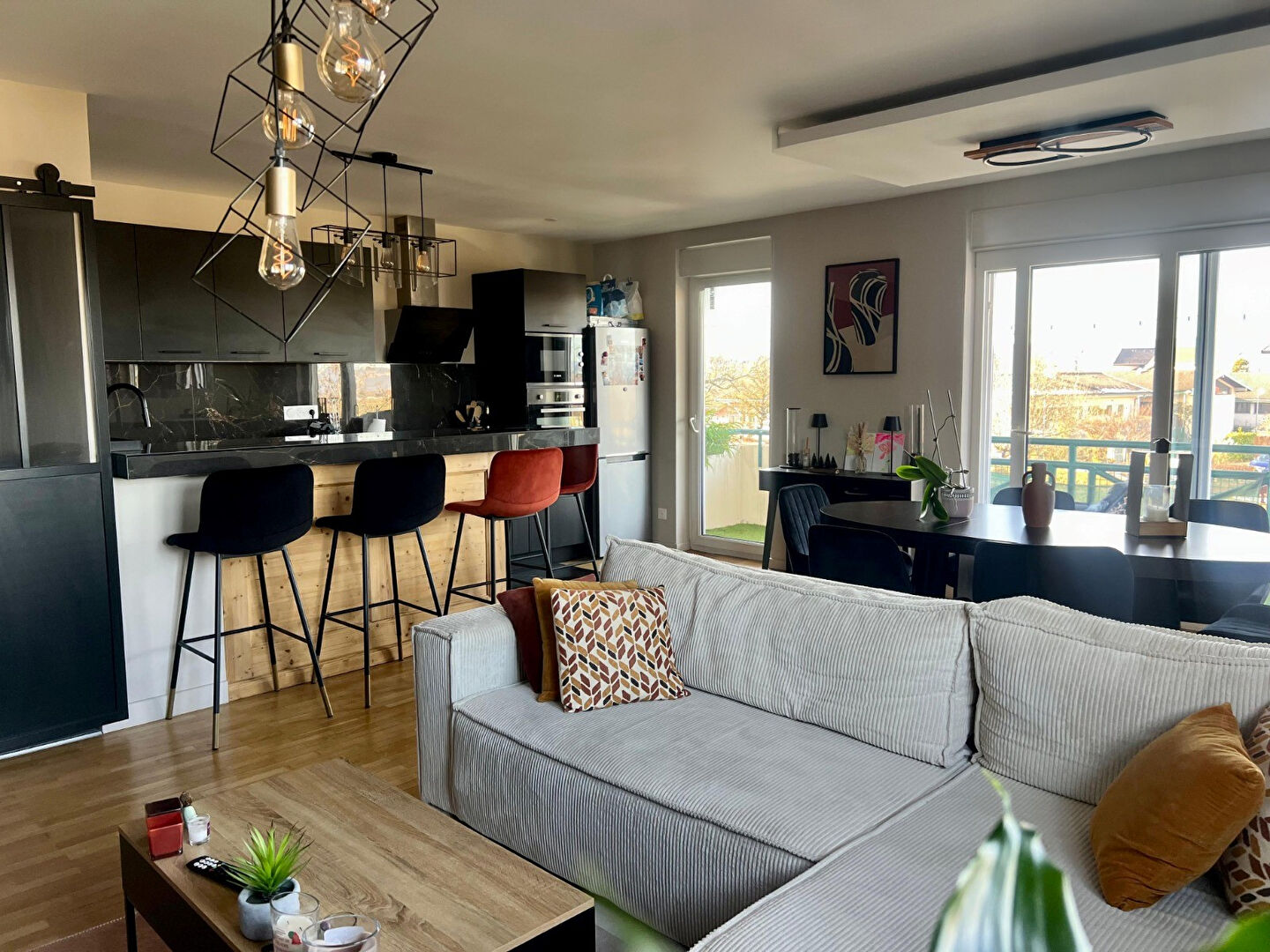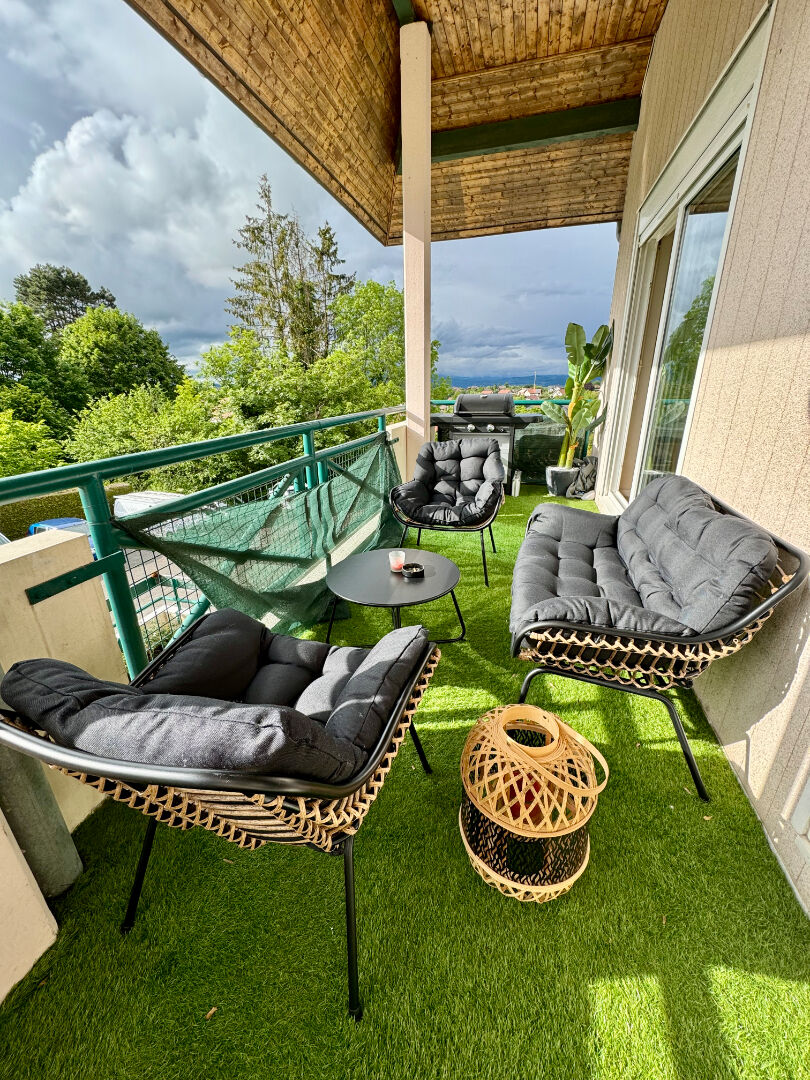 Situé à Vieugy, à seulement 10 minutes d'Annecy, au coeur d'un village paisible et proche des commerces, ce superbe appartement meublé de 54,46 m², entièrement rénové en 2023, allie confort, calme et prestations haut de gamme. Il offre un bel espace de vie avec salon lumineux, salle à manger et cuisine aménagée et équipée avec bar central, idéal pour recevoir. L'appartement comprend également une chambre avec dressing et placards, un dressing verrière pour manteaux et chaussures, une salle d'eau moderne avec douche à l'italienne, et un WC indépendant. Vous profiterez d'une belle terrasse de 12m² avec gazon synthétique et vue sur le clocher de Vieugy. Une cave complète ce bien. Parking collectif Prestations soignées, rénovation de qualité, calme absolu et proximité d'Annecy : un bien rare, prêt à vivre. Copropriété de 21 lots ().
