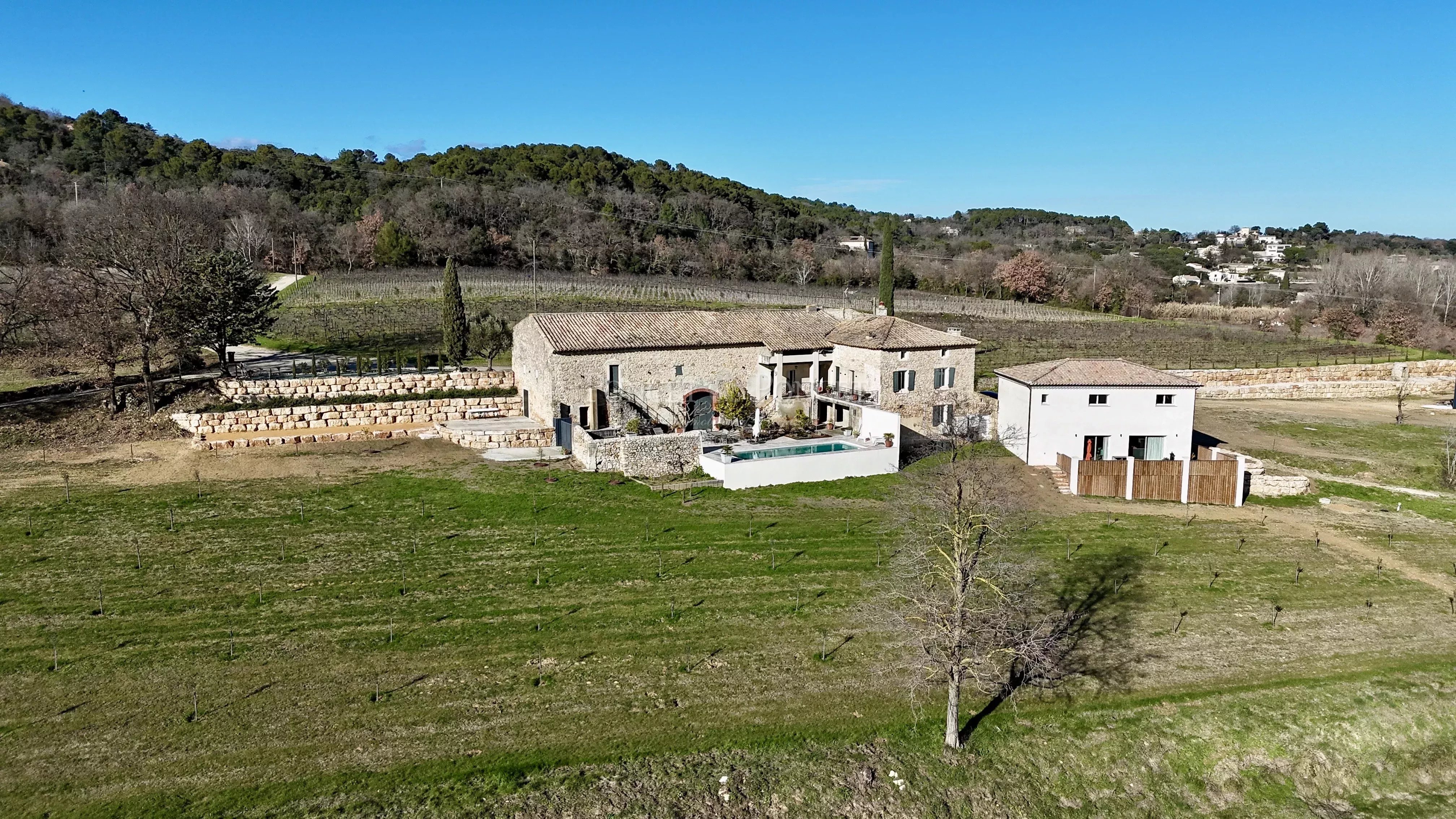 Implantée sur les coteaux, au cœur de la "Petite Rome de Provence... ses 7 collines" et d’un environnement naturel préservé, cette propriété bénéficie d’un emplacement privilégié alliant calme absolu et excellente accessibilité. Les premiers commerces et services sont accessibles en quelques minutes, tandis que l’autoroute se rejoint très rapidement. La gare TGV d’Avignon à 55 minutes, permettant de relier Paris en moins de 3 heures et l'aéroport de Nîmes à 55min et Marseilles à 1h20 de trajet. Depuis les hauteurs du domaine, la vue panoramique s’étire à perte depuis les champs, les vignes, les forêts et les collines environnantes jusqu’au Mont Ventoux et les pré-Alpes du Sud. DESCRIPTION: Véritable propriété de caractère, ce domaine viticole en biodynamie d’environ 10 hectares, dont 5,25 hectares de vignes certifiées, séduit par son authenticité, ses volumes et son potentiel rare. Deux sources sont présentes et un ruisseau borde la partie basse du domaine. Il s’articule autour de trois bâtiments principaux : • Le Mas provençal, datant du début du XIXᵉ siècle, entièrement en pierre et déclaré en habitation. Il développe environ 700 m², dont près de 500 m² à aménager, correspondant à l’ancienne cave en rez-de-chaussée et aux espaces de stockage à l’étage, accessibles de plain-pied par l’arrière. La partie déjà rénovée, répartie sur deux niveaux, propose quatre chambres et bénéficie d’un chauffage par pompe à chaleur air/eau. Deux caves voûtées, deux ateliers, une superbe terrasse, une piscine coque au sel, ainsi qu’un terrain de boules complètent cet ensemble, tous parfaitement exposés plein Sud. À terme, après travaux, il est possible de créer un mas principal d’environ 700 m² habitables. • Une maison indépendante neuve d’environ 140 m², aux prestations contemporaines. Récemment édifiée, elle répond aux normes PMR en rez-de-chaussée, dispose de trois chambres dont une de plain-pied, d’une cuisine haut de gamme entièrement équipée ouverte sur le séjour, avec accès direct à une grande terrasse en bois. Domotique intégrée et climatisation réversible viennent parfaire le confort. • Une cave viticole neuve, d’environ 497 m² au sol, et conforme aux dernières normes. Elle comprend une vaste cave de vinification offrant un fort potentiel de développement, un espace garage accueillant le matériel viticole et agricole (pouvant faire partie de l’acquisition), un local phytosanitaire, ainsi qu’un logement indépendant de type deux pièces de 55 m², entièrement équipé. Une mezzanine de stockage surplombe cet espace et est directement accessible depuis la cave. Le domaine est complété par une plantation remarquable d’arbres fruitiers : Environ 250 oliviers, 75 amandiers, 38 abricotiers, 40 pistachiers, ainsi que 40 pommiers issus d’une variété créée par les propriétaires actuels. Plusieurs hectares de vignes peuvent être achetées à proximité direct et dans les environs proche afin d'augmenter la production. CE QUE NOUS EN PENSONS: Il s’agit d’une propriété rare et inspirante, conjuguant le charme d’un mas provençal authentique, un outil viticole récent et performant, et un cadre naturel exceptionnel. Les vues panoramiques, la diversité des bâtiments, la certification biodynamique des vignes et le potentiel d’aménagement font de ce domaine un bien à part, idéal pour un projet viticole ambitieux, une résidence de prestige, ou une activité d’accueil haut de gamme. Un lieu où l’on ressent immédiatement l’espace, la sérénité et une véritable qualité de vie provençale. Contact : Thierry Lallemand +33(0)6 62 51 94 07 Les informations relatives aux risques auxquels ce bien est exposé sont disponibles sur le site Géorisques : www.georisques.gouv.fr