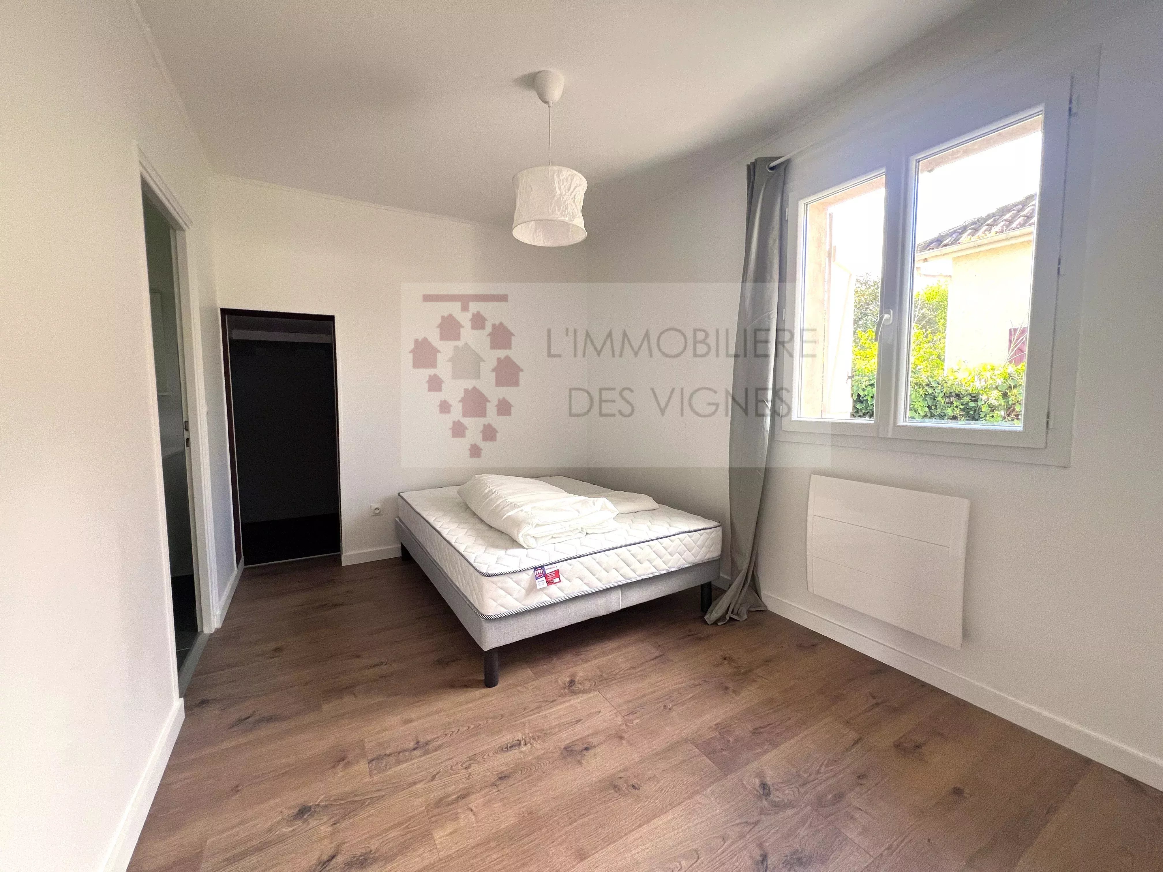 Votre agence L'IMMOBILIERE DES VIGNES vous présente au centre ville de La Brède, au calme, cette charmante maison, meublée de plain pied, comprenant, cuisine équipée avec plaques, four et réfrigérateur, une chambre, un bureau, une salle d'eau avec wc et un salon donnant sur un agréable extérieur. Terrain clôturé à usage privatif d'environ 100 m2. Possibilité de garer plusieurs véhicules sur le terrain. LOYER : 900 € par mois. Disponible fin février.