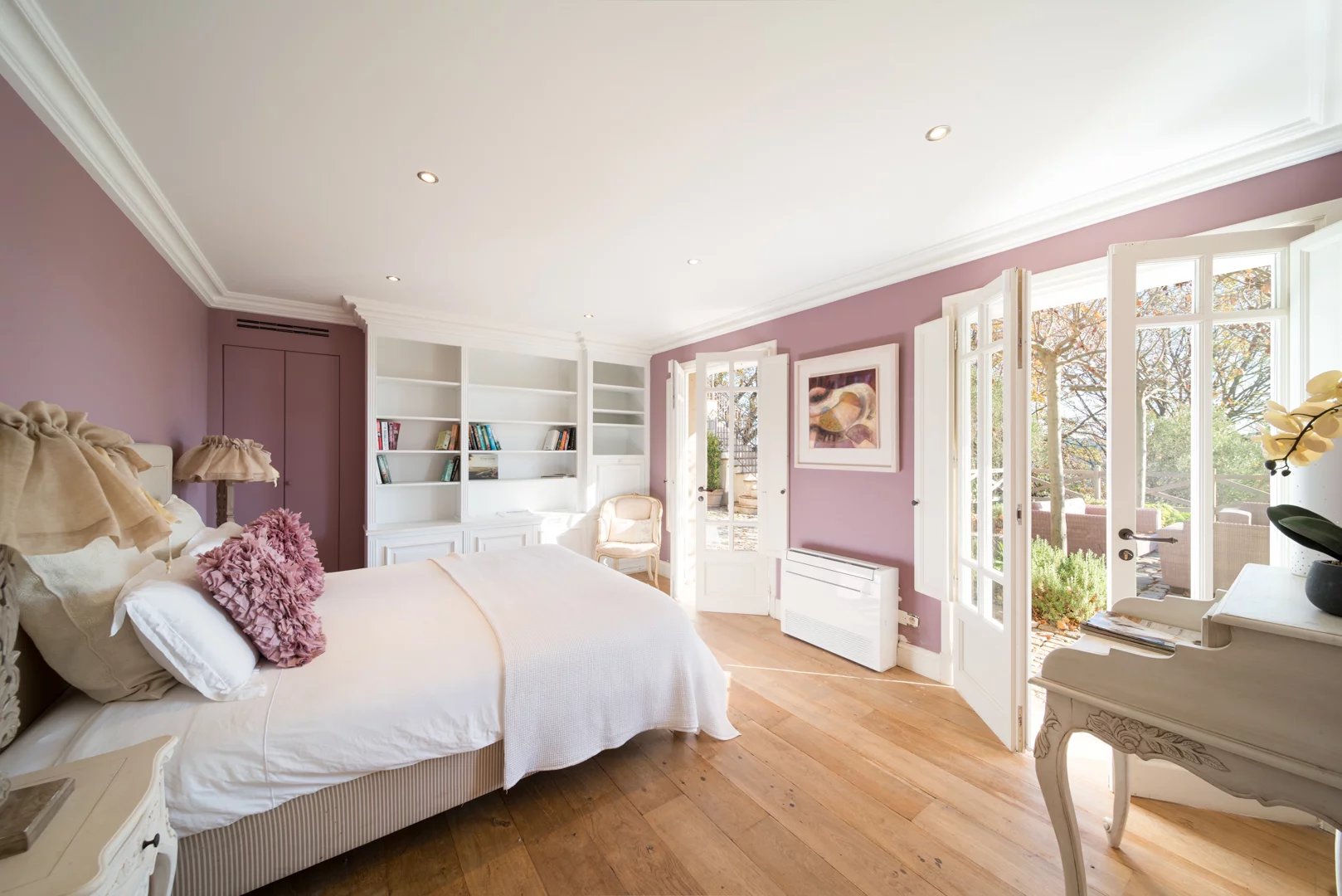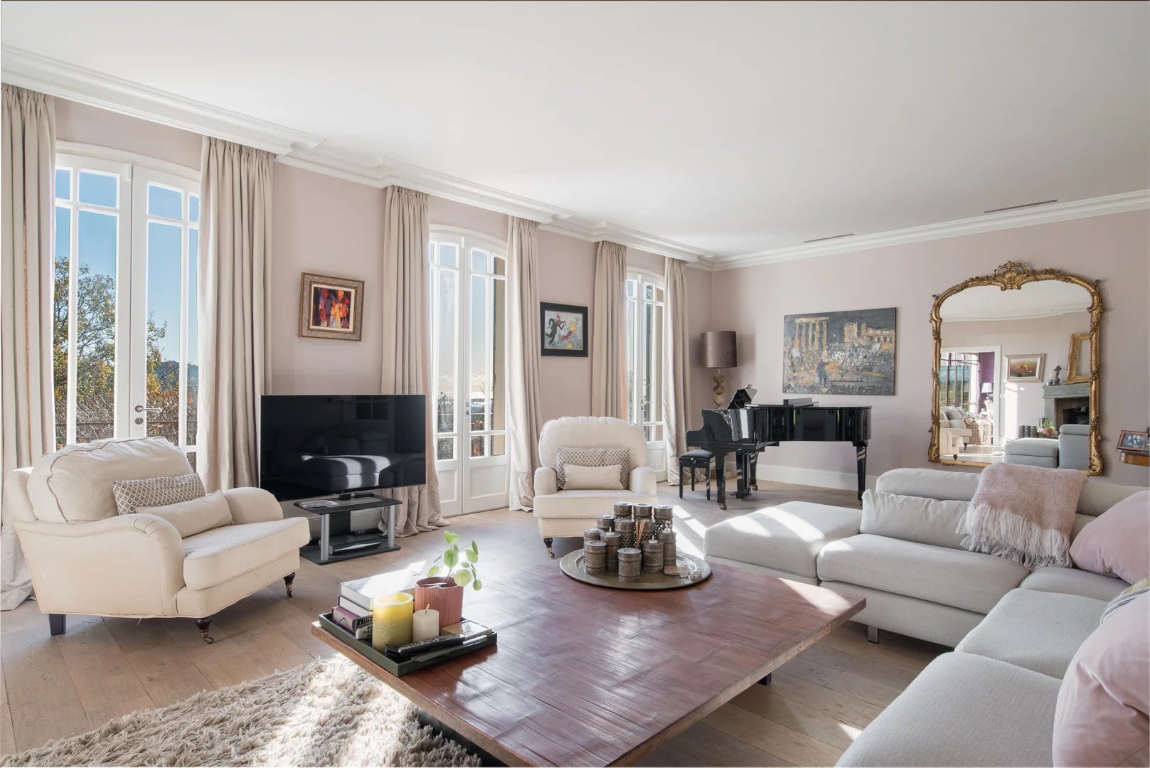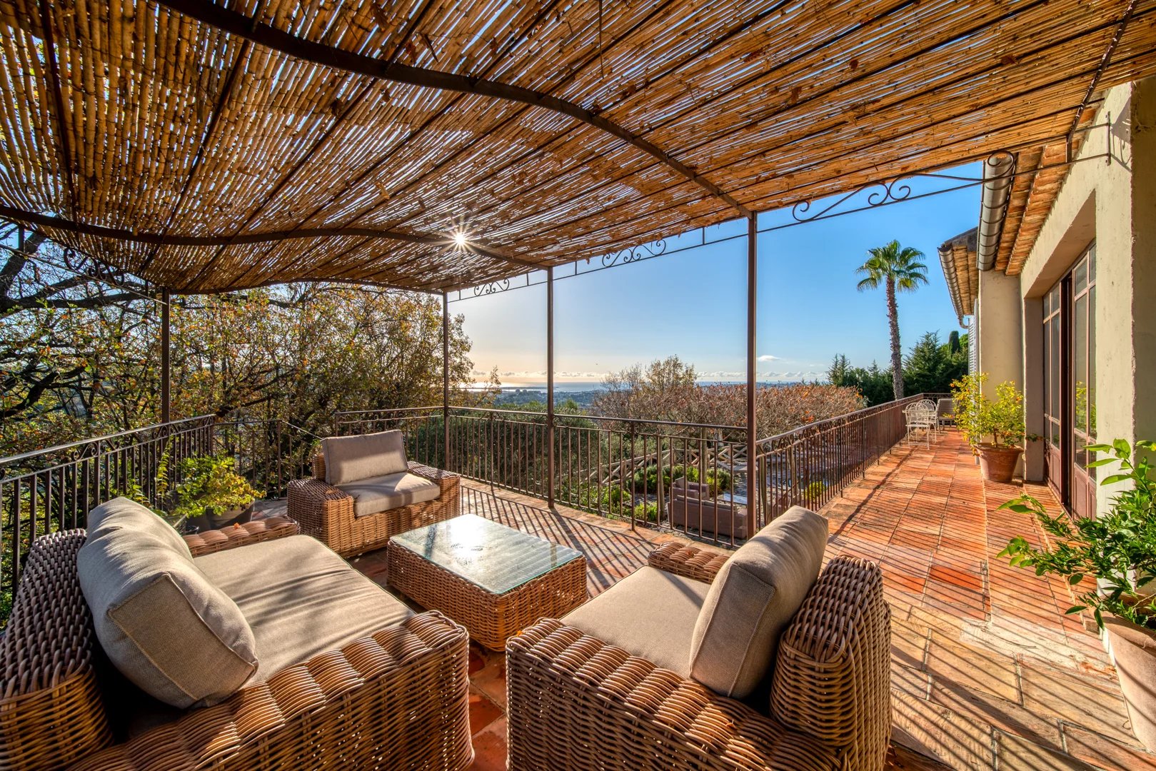 Mougins – Une propriété unique au coeur du village Imaginez-vous vivre dans le vieux village de Mougins dans une magnifique villa d’environ 360 m², édifiée sur deux niveaux, offre un cadre de vie privilégié alliant volumes généreux, confort et vues exceptionnelles sur la baie de Cannes, les Alpes et le clocher du vieux village. Au rez-de-chaussée, la maison s’ouvre sur une élégante entrée avec toilette invité, menant à une cuisine avec sa buanderie, une salle à manger et un vaste salon. Un bureau ainsi qu’une suite parentale avec dressing et salle de bains complètent ce niveau. L’ensemble bénéficie d’un accès direct sur terrasses avec espace salle à manger et espaces salons, idéal pour recevoir. Au rez-de-jardin, un corridor dessert trois chambres en suite, chacune avec dressing et salle de bains, ainsi qu’un studio indépendant, parfait pour accueillir des invités ou du personnel. Un local technique complète ce niveau. Implantée sur un terrain paysager de 2 403 m², la propriété dispose d’une piscine au sel chauffée avec larges terrasses, d’une cuisine d’été, de deux espaces salons extérieurs, ainsi que de stationnements extérieurs et intérieurs. Une propriété rare, alliant une vie de village et bénéficiant d’un panoramas remarquables, idéale en résidence principale comme en maison de villégiature. Un bien rare à Mougins, réunissant emplacement privilégié, volumes généreux et vues exceptionnelles, à découvrir lors d’une visite sur rendez-vous.
