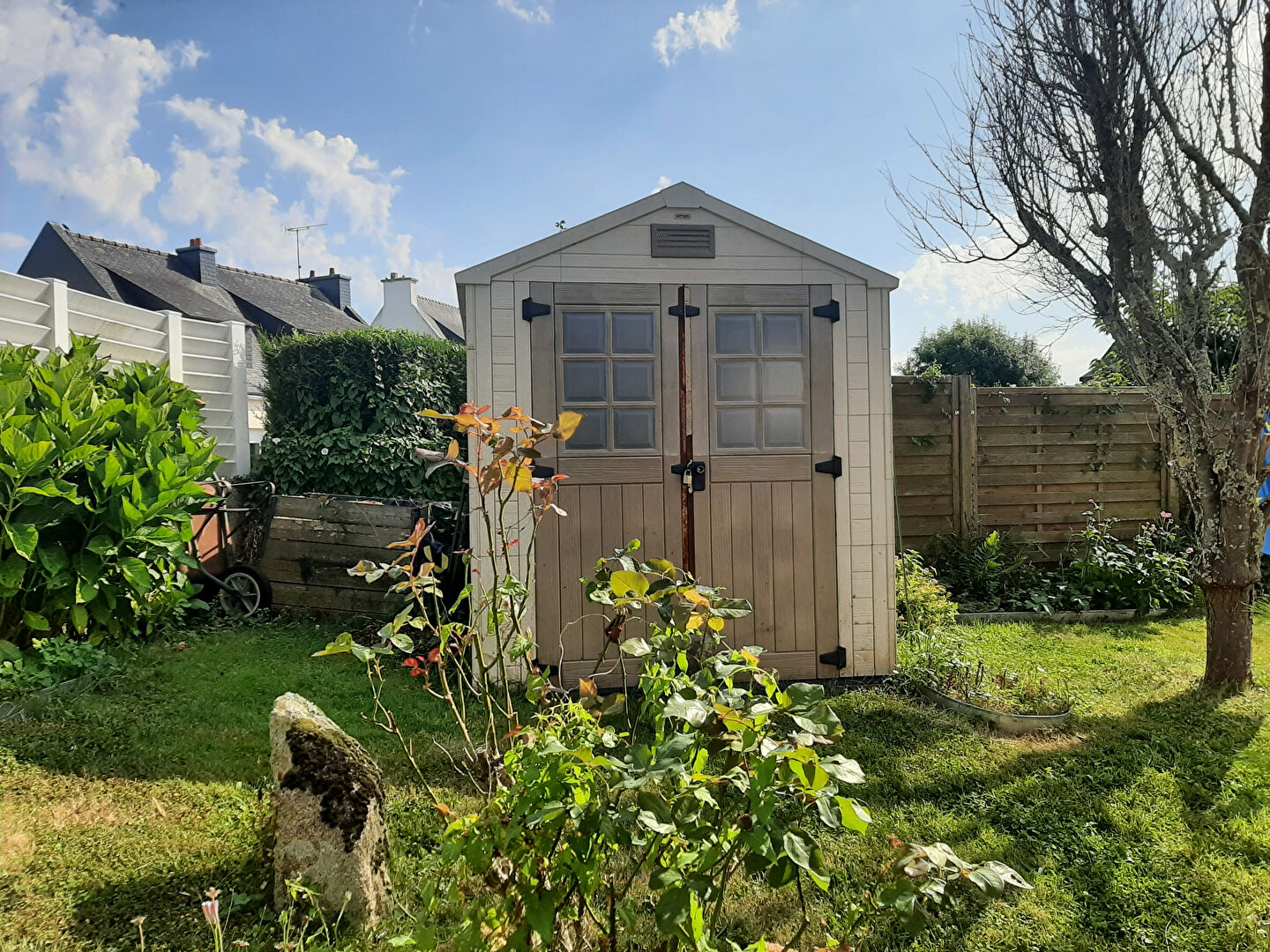 Trégunc - Commodités à pied, à 3,9 km des plages, à 5mn en voiture de Concarneau. Maison de plain-pied mitoyenne par le garage composée d'une entrée avec vestiaire, une cuisine aménagée et équipée de 15.91m2, un salon/séjour, 3 chambres, cellier, salle de douche, WC indépendant. Un garage de 28.46m2 avec une grande pièce aménagée en chambre au grenier. Jardin clos avec un cabanon et une grande terrasse carrelée avec store ban . Travaux réalisés: Electricité avec VMC, volets électriques, isolation, parquets, chaudière, menuiseries. Tout à l'égout - DPE D - Chaudière 2025 Pour tout complément d'information merci de contacter l'agence au 02.29.20.22.12 (4.80 % honoraires TTC à la charge de l'acquéreur.)
