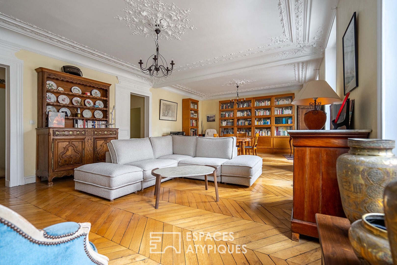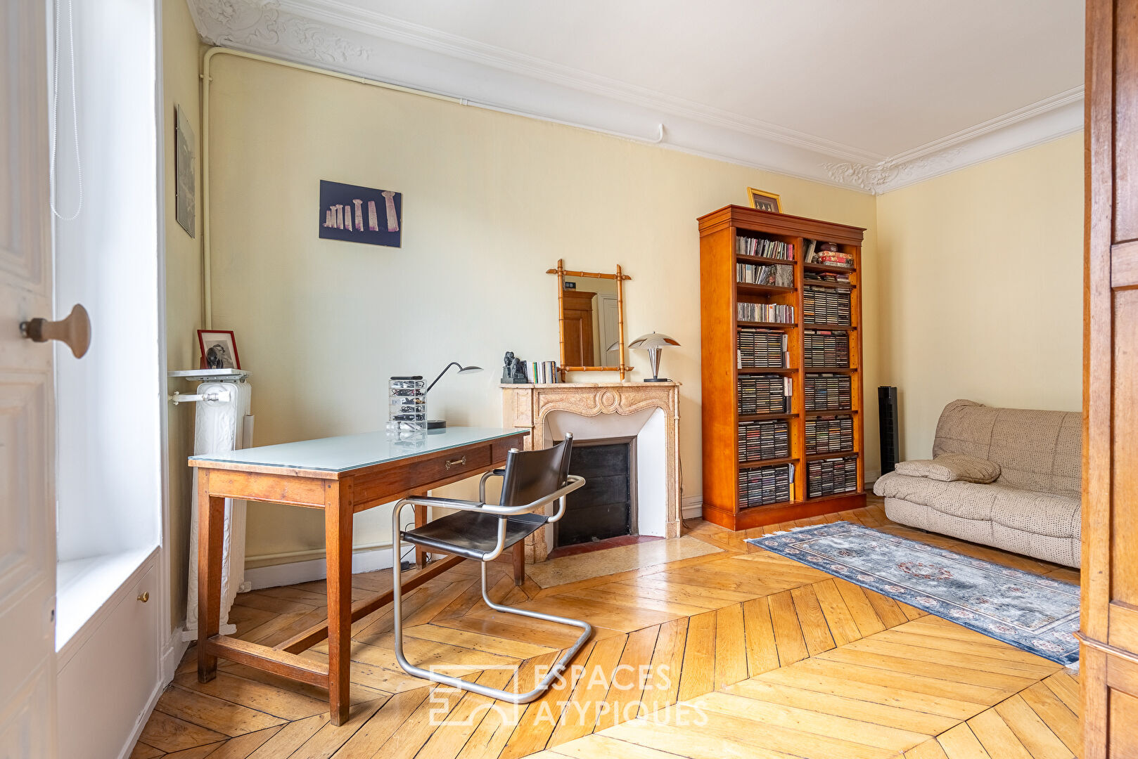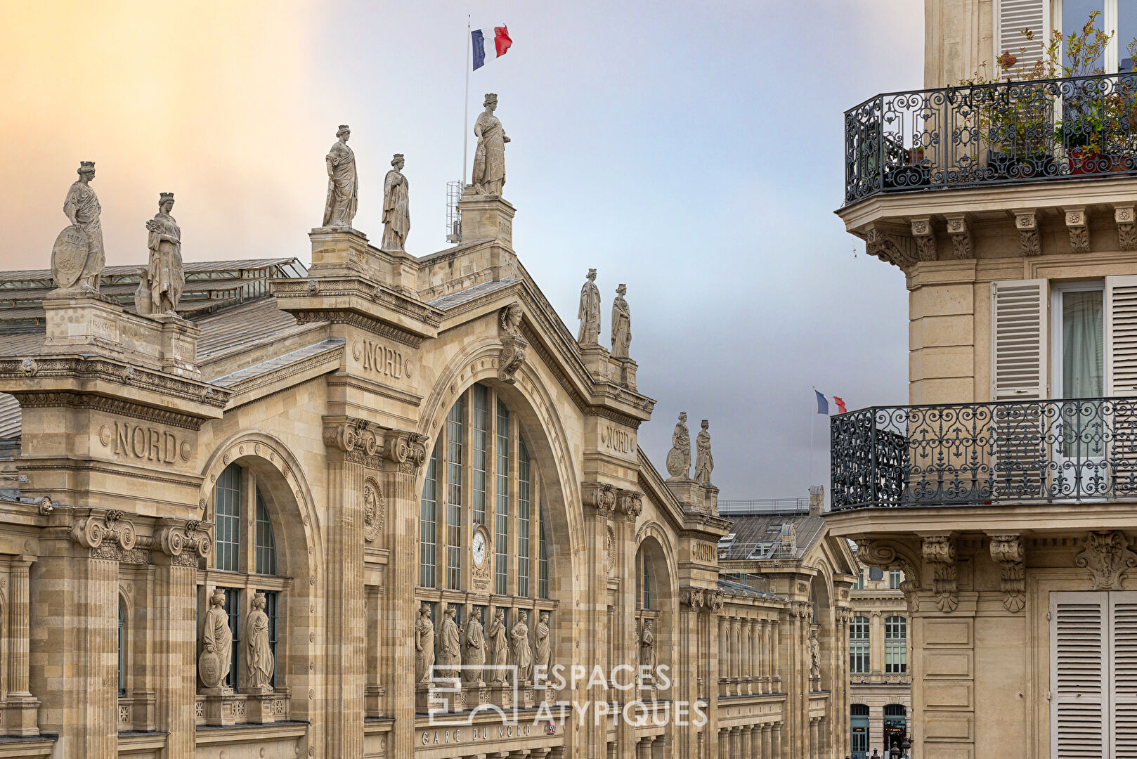 Cet appartement bourgeois de caractère de 102,65m2 au sol (100,60 m2 Carrez) se situe au 3ème étage avec ascenseur d'un très bel immeuble érigé vers 1865 et conçu par le baron de Rothschild, alors concessionnaire de la ligne du Nord. Il jouit d'une très belle vue sur la façade de la Gare du Nord, chef-d'oeuvre architectural signé Jacques Hittorff, et prend place dans un immeuble aux parties communes élégantes : colonnes, mosaïques au sol et ferronneries ouvragées. L'appartement traversant s'ouvre sur une entrée qui mène à une vaste pièce de réception de 45m2 baignée de lumière grâce à ses quatre ouvrants. Ici, tout concourt au charme haussmannien : parquet à chevrons, moulures délicates, cheminée en marbre et hauteur sous plafond généreuse. La cuisine séparée et équipée complète l'espace de vie. La partie nuit se compose de deux chambres lumineuses, séparées par une salle de douche et un wc indépendant. Entre l'élégance bourgeoise du XIXème siècle et le dynamisme d'un quartier en pleine effervescence, ce bien rare conjugue charme de l'ancien et potentiel d'aménagement contemporain. La jolie cour arborée de l'immeuble accueille des emplacements pour les vélos et une cave de 4,7m2 complète ce bien soumis au statut de la copropriété. Métro : Gare du Nord CLASSE ENERGIE :D/ CLASSE CLIMAT : D. Montant moyen estimé des dépenses annuelles d'énergie pour un usage standard, indexées aux années 2021, 2022, 2023 : entre 1 290 euros et 1 800 euros (abonnement compris). Les informations sur les risques auxquels ce bien est exposé sont disponibles sur le site Géorisques : https://www.georisques.gouv.fr. Contact : Ludovic 06 52 62 47 54 RSAC : 888 282 241 PARIS Copropriété de 40 lots - dont 31 lots habitation. (Pas de procédure en cours). Charges annuelles : 4742.48 euros. Ludovic Mahé (EI) Agent Commercial - Numéro RSAC : - .