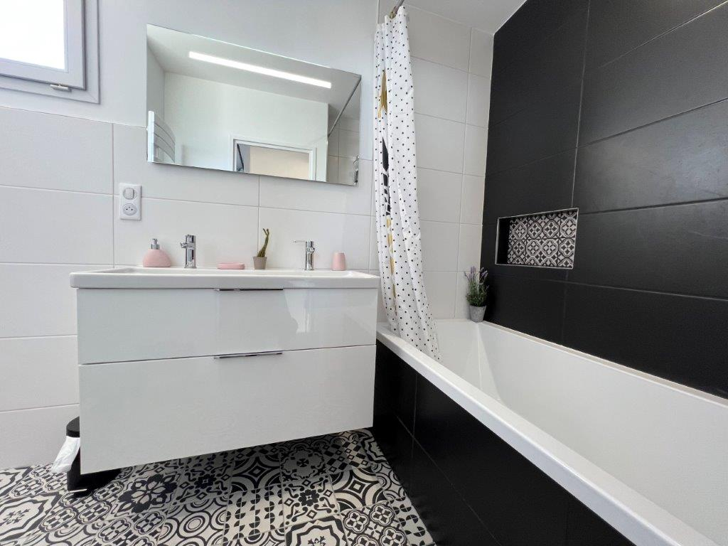 A seulement 450m du Marché Central et 1100m de la plage, belle maison récente de type 3 comprenant : - Au rez-de-chaussée : Entrée avec placard, séjour-salon ouvrant sur terrasse et jardin, cuisine ouverte et aménagée, une chambre avec salle d'eau et wc, un second wc. - A l'étage : Palier avec coin bureau, une chambre avec dressing, salle de bains avec wc. Garage - Chauffage au sol par une pompe à chaleur.