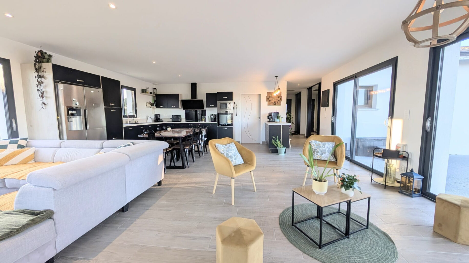 COUP DE COEUR !!!! Située dans un charmant village au Sud de Hagetmau, venez découvrir cette magnifique maison (2020) de standing basse consommation. Elle se compose d'une entrée, d'une grand salon/séjour de + de 50 m², d'une cuisine ouverte aménagée et équipée, de 5 chambres dont une avec dressing, d'une salle d'eau, d'un cellier, d'une grande terrasse avec vue sur les Pyrénées, d'une piscine 4x8 et d'un garage double séparé. Vous profiterez d'une climatisation réversible gainable sur l'ensemble de la maison, de la domotique, le reste étant à découvrir en visite. Pour tous renseignements complémentaires, n'hésitez pas à contacter l'agence. Les honoraires sont à la charge du vendeur ! Montant estimé des dépenses annuelles d'énergie pour un usage standard : entre 503 euros et 681 euros par an. Prix moyens des énergies indexés sur les années de référence 2021, 2022, 2023 (abonnements compris)