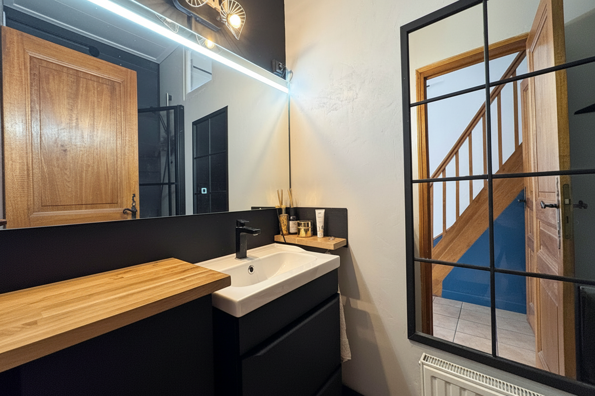 Au 1er étage, vous découvrirez une pièce de vie lumineuse de 42 m² avec coin cuisine équipée, offrant un espace convivial et fonctionnel. Celle-ci s'ouvre sur une véranda avec un espace buanderie. Une salle de bains ainsi que des toilettes séparées complètent ce niveau.