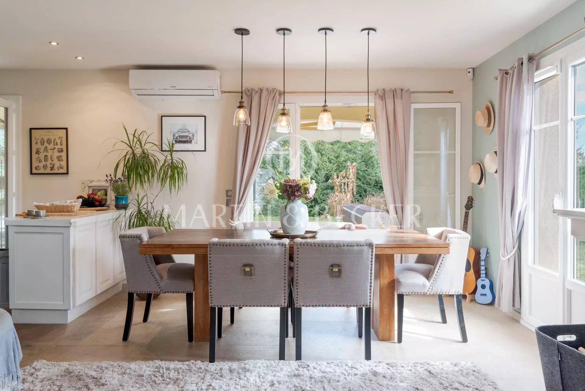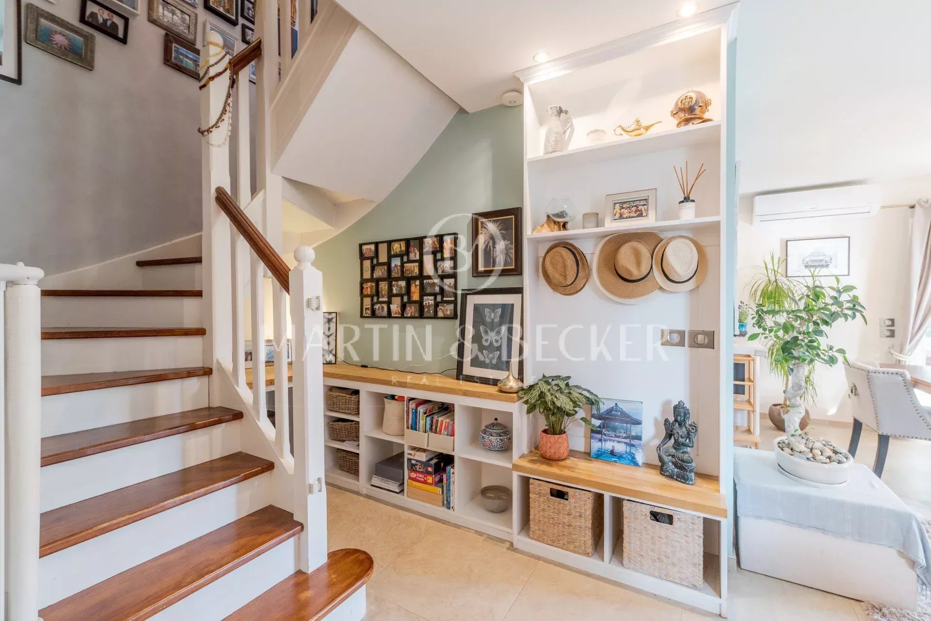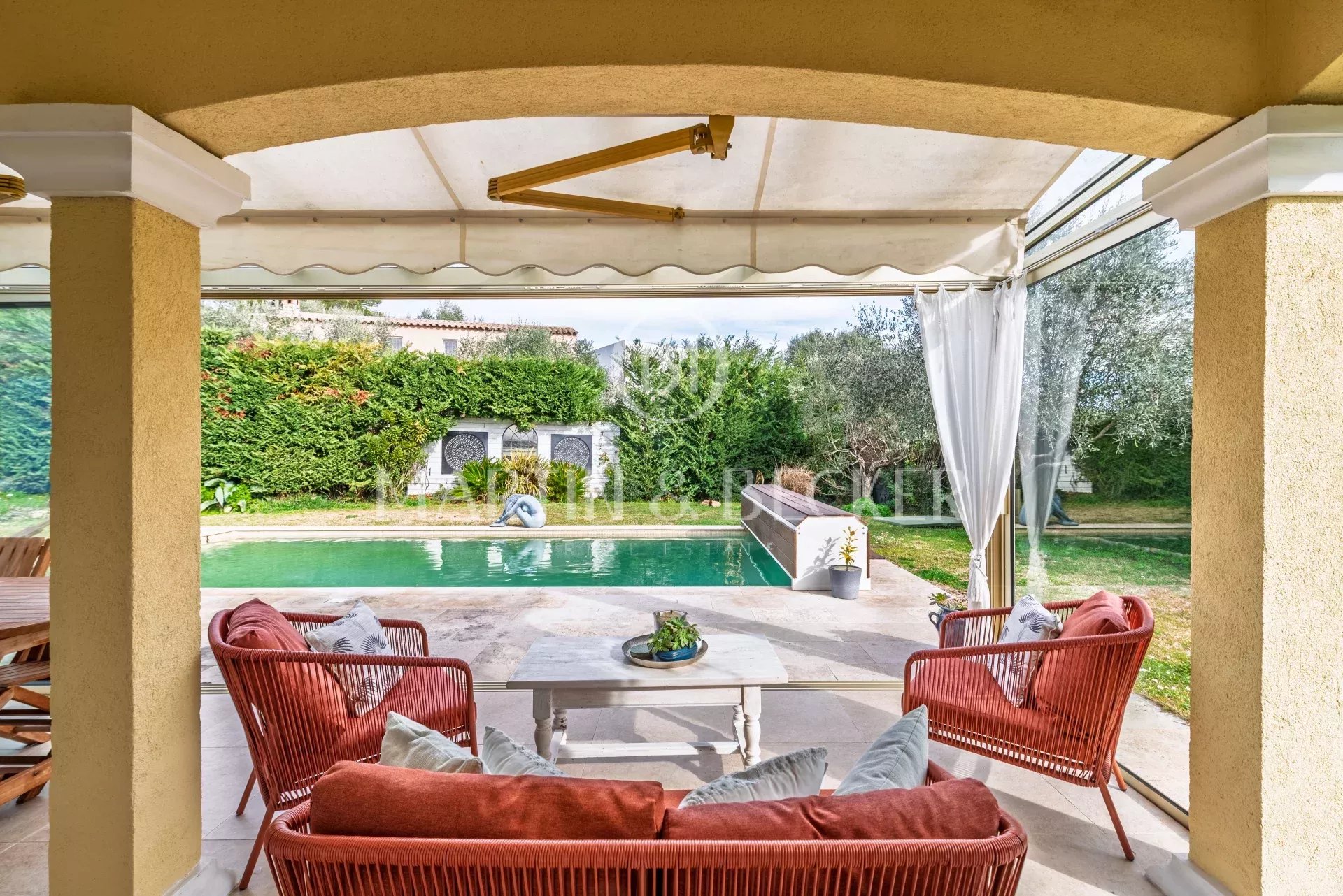 Charmante villa rénovée avec goût, située dans un petit domaine fermé sur les hauteurs de Biot proche Valbonne. La maison de 125 m2 habitables, complétée par une véranda, est composée de : - en rez de chaussée: séjour avec une triple exposition, cuisine ouverte, véranda, chambre avec coin bureau, salle de douche, buanderie et WC. - A l'étage: 3 chambres, 2 salles de douche et WC indépendant. La villa jouit d'un beau terrain plat, d'une piscine, d'un chalet et d'un abris voiture. Climatisation dans toute la maison. Arrets de bus pour tous les établissements scolaires (primaire, collège Niki de saint Phalle, Lycées Simone Veil et CIV) à 3 minutes à pied.