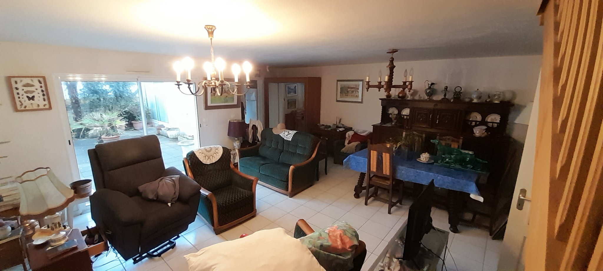 - Au rez de chaussée une entrée, une chambre, un séjour-salon avec une baie vitrée donnant accès à la terrasse, une kitchenette avec en prolongement une véranda, une salle d'eau, un wc.