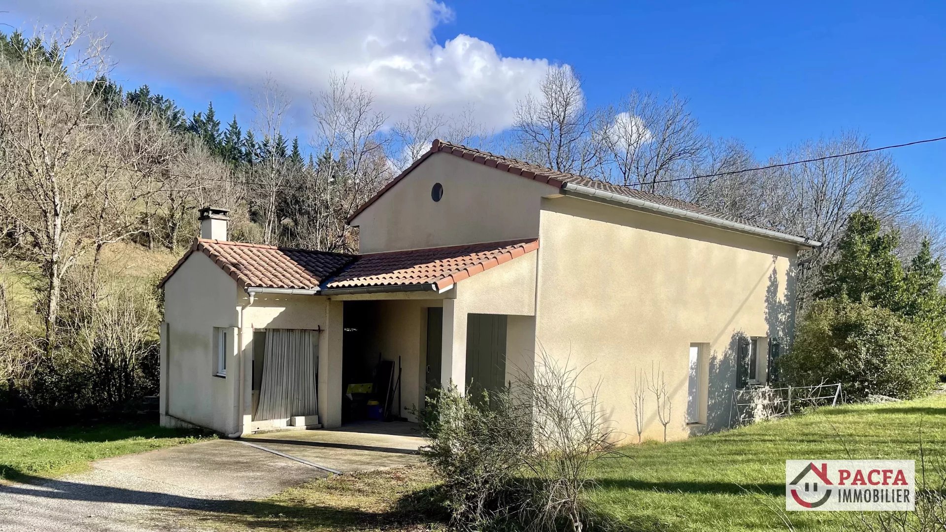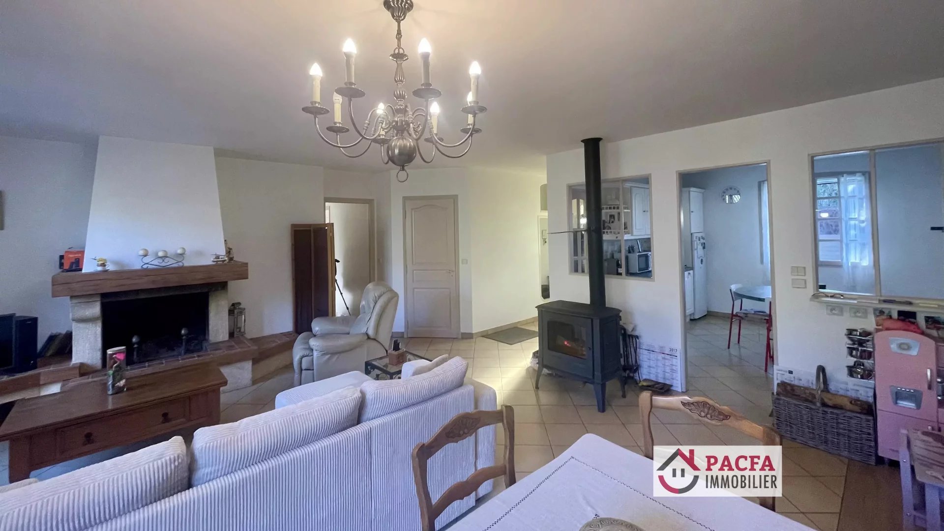 La maison principale, construite en 1989 et parfaitement entretenue, développe environ 125 m² habitables. L'étage de vie de plain-pied est composé d’une cuisine, d’un séjour lumineux agrémenté d'une cheminée et d'un poêle à bois, ainsi que de trois chambres.