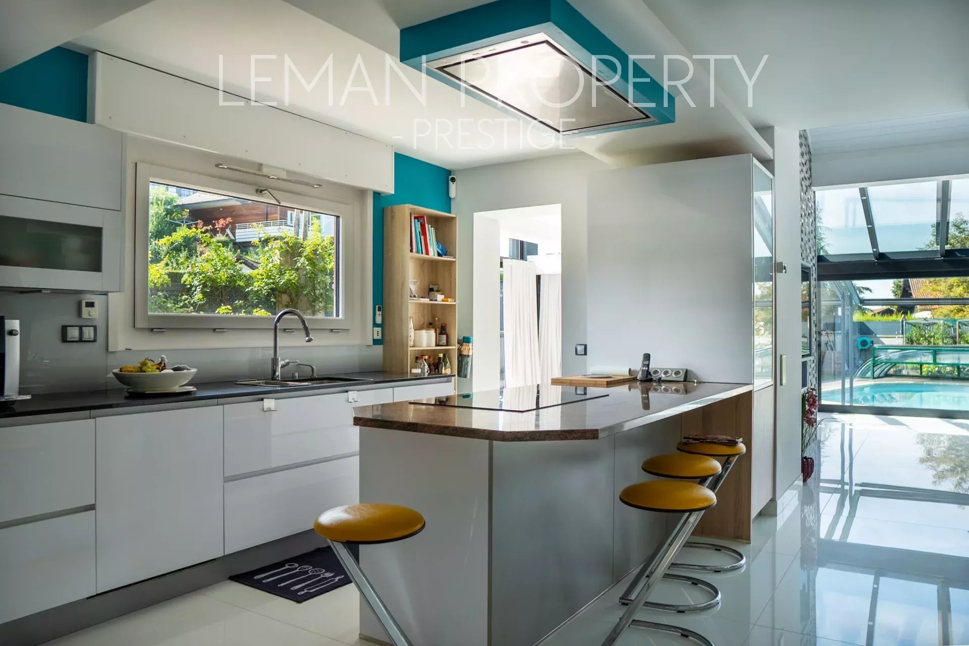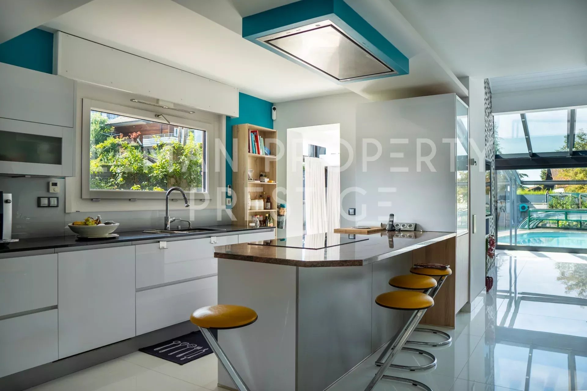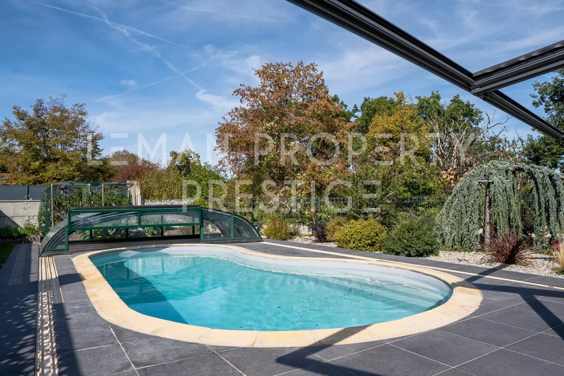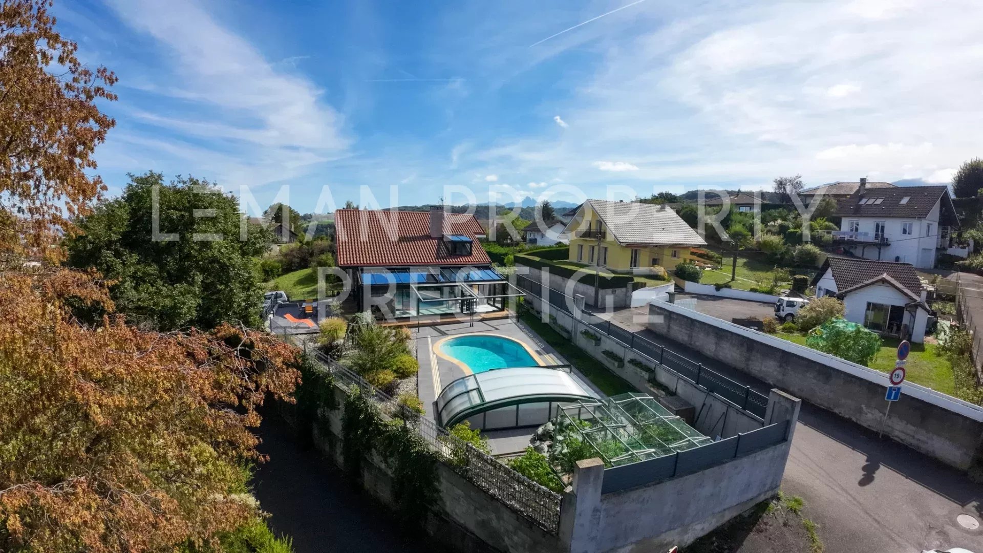 Découvrez cette magnifique propriété entièrement rénovée avec goût et belles prestations. Nichée dans un quartier pavillonnaire paisible avec une vue sur le Lac. Cette villa offre de beaux volumes et est très lumineuse. Le vaste séjour cathédrale baigné de lumière grâce à ses larges baies vitrées ouvre sur un extérieur agréable, idéal pour se détendre au bord de la piscine avec abri. La cuisine moderne équipée et son arrière-cuisine fonctionnelle complètent parfaitement cet espace de vie convivial. Trois chambres confortables dont deux au rez-de-chaussée avec salle de douches, rangements et WC. A l'étage mezzanine / bureau avec extérieur, une belle suite parentale avec salle de bains, dressing, balcon. Un sous-sol total complète le bien avec sauna. Cette demeure allie parfaitement confort, luminosité et cadre privilégié pour une qualité de vie exceptionnelle. DPE C GES B Honoraires à la charge du vendeur. Les informations sur les risques auxquels ce bien est exposé sont disponibles sur le site Géorisques : georisques.gouv.fr
