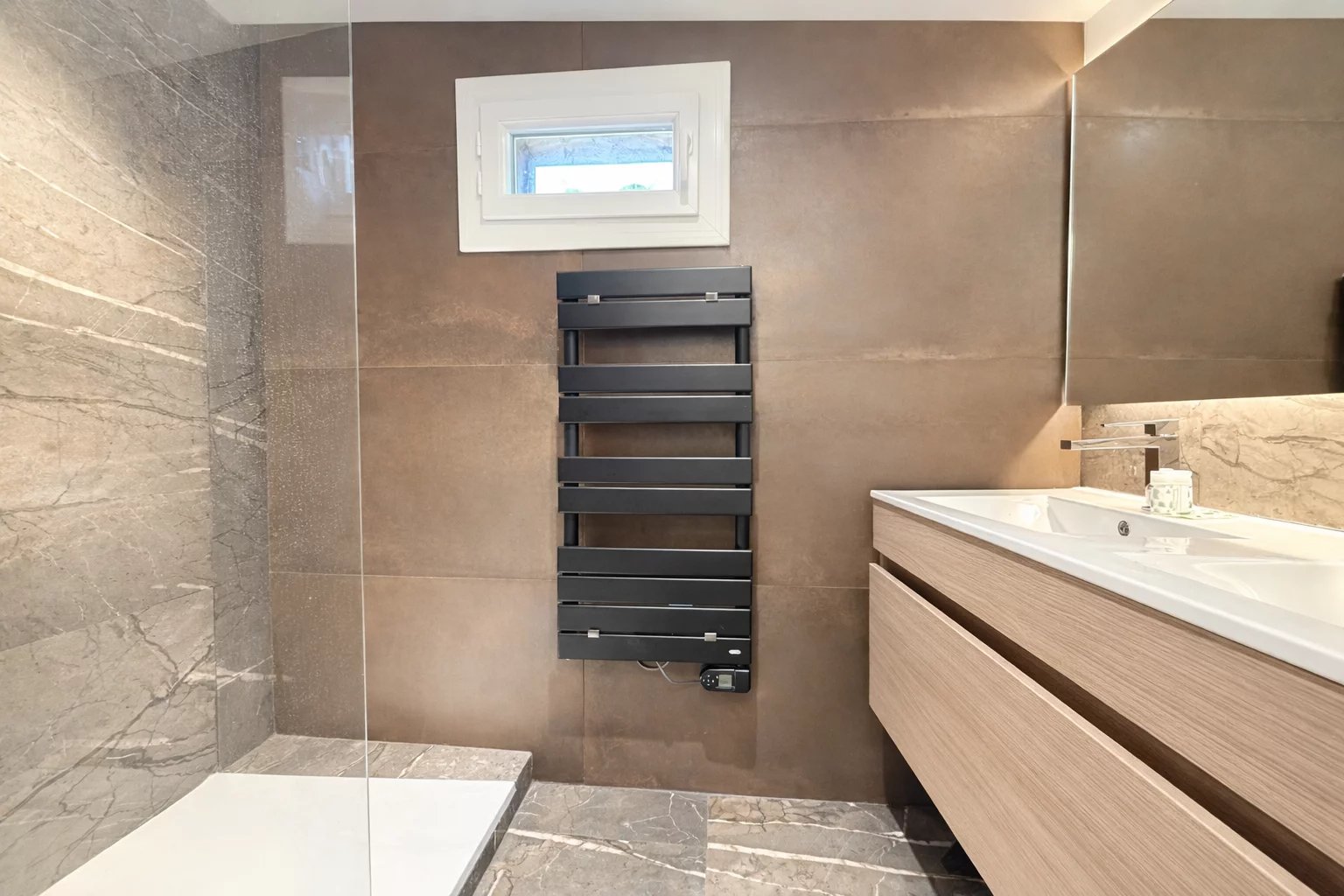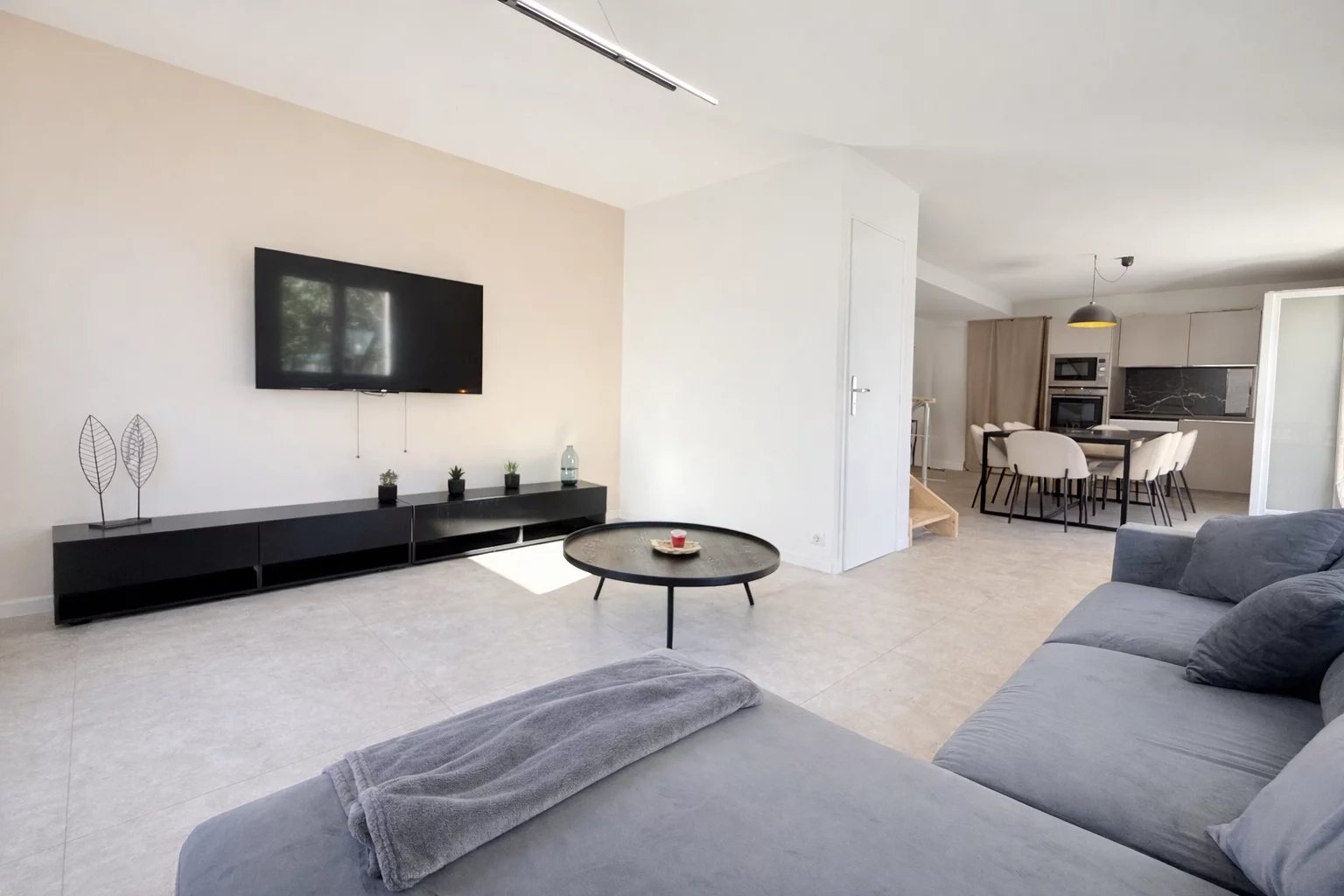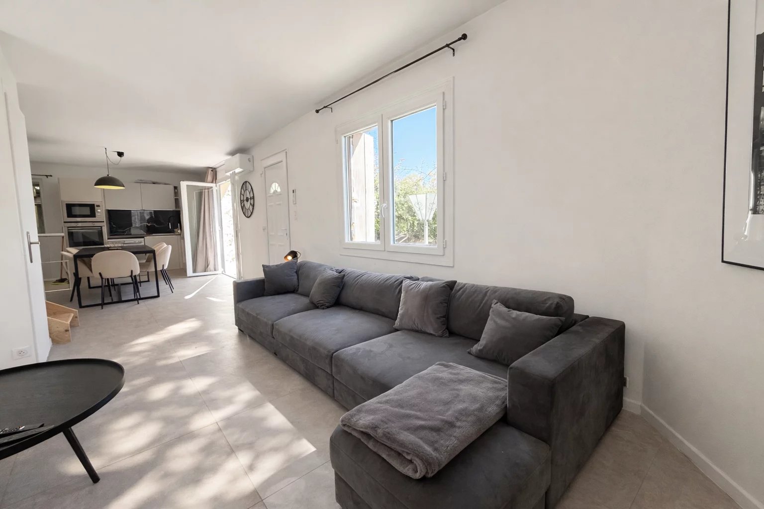 Située dans le quartier recherché du Petit Juas, à proximité des commerces, des transports, des écoles et à quelques minutes de la Croisette, cette élégante maison de ville séduit par son style contemporain et son agencement optimisé sur trois niveaux. D’une surface Loi Carrez de 90,07 m² et d’une surface habitable totale de 103,40 m², elle offre des prestations modernes et un confort de vie idéal, que ce soit pour une résidence principale, un pied-à-terre ou un investissement locatif à fort rendement. Dès l’entrée, vous découvrez une belle pièce de vie avec cuisine entièrement équipée, ouverte sur un espace salon-salle à manger lumineux. Cet espace convivial s’ouvre directement sur un petit jardin, apportant une touche de verdure et un agréable prolongement extérieur. Le rez-de-chaussée accueille deux chambres en suite, chacune avec salle de bain, dressing et WC, offrant confort et indépendance. À l’étage, la suite principale dispose de sa propre salle de douche, d’un dressing et d’un WC indépendant. L’accès à la maison se fait par un passage commun au sein d’un petit immeuble de ville, menant à la maison qui est entièrement individuelle. Charges d’environ 550 € par an correspondant au droit de passage pour l’accès à la maison. Un bien rare à Cannes, alliant élégance, confort et fort potentiel locatif.