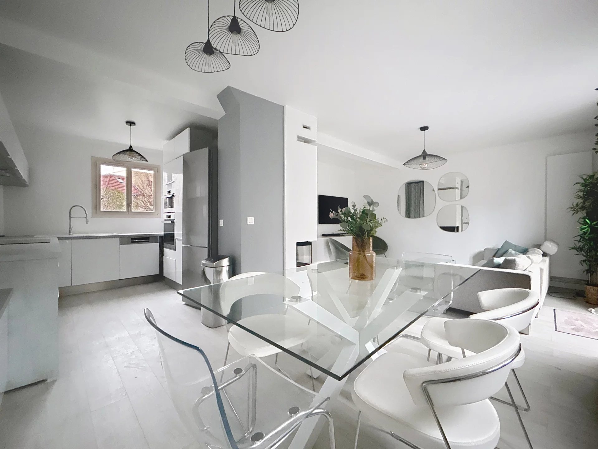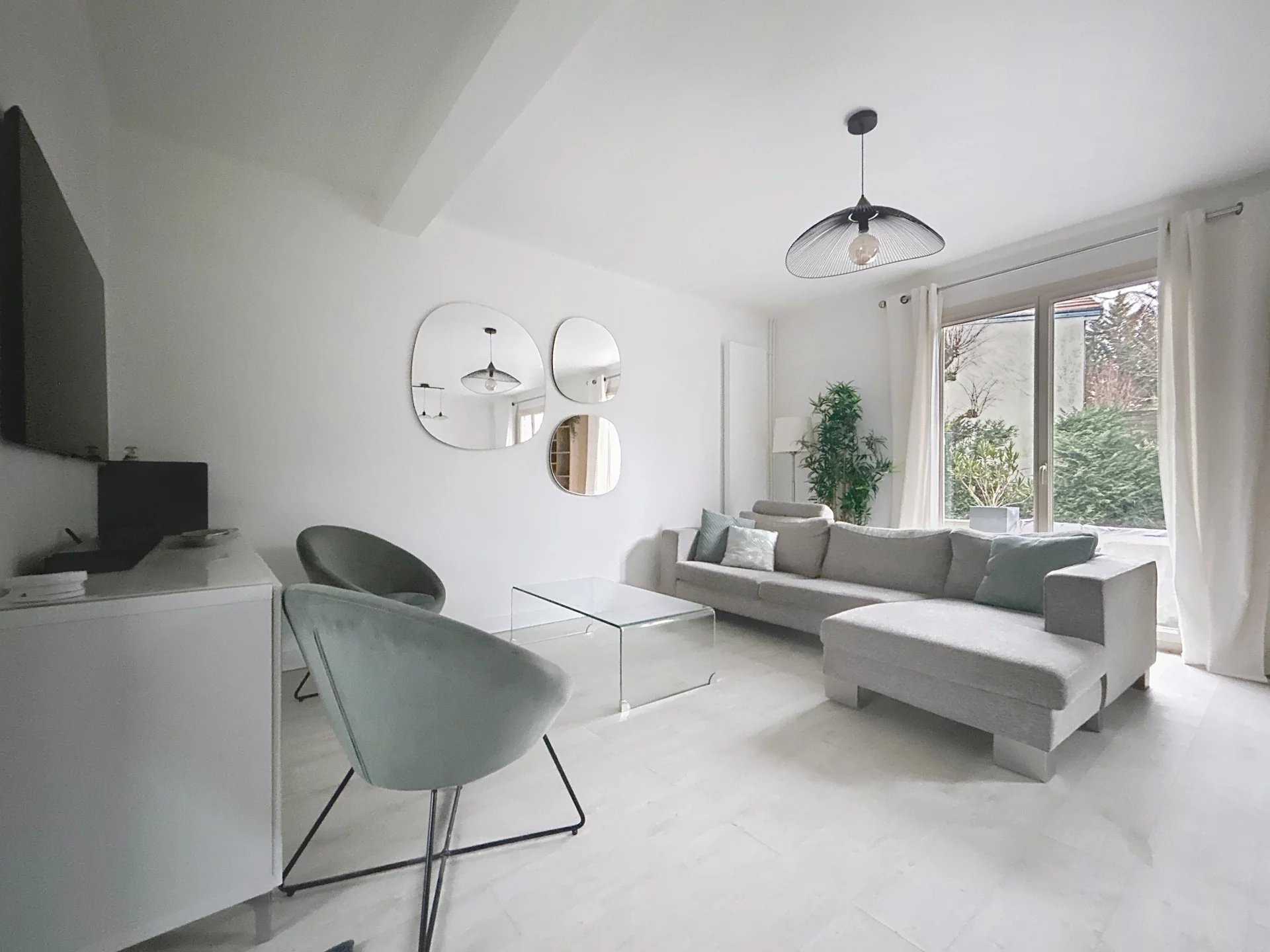 A Louer en meublé : Maison de ville rénovée entre 2021 et 2025 située dans résidence verdoyante. Lumineuse, calme et jolie vue sur la verdure. Aucun vis-à-vis. Vous trouverez au RDC : un espace de vie de plus de 35m2 traversant EST-OUEST avec cuisine ouverte équipée (frigo, plaques induction, lave vaisselle, four, micro-ondes, lave linge) et cheminée à foyer fermé pour les soirées d'hiver, terrasse de 20m2, salle d'eau avec WC. Au 1er étage : 3 chambres entre 9 et 11m2, 1 salle d'eau avec WC. Au 2e étage : 1 grande pièce idéale pour un bureau ou un espace pour enfants (1,70m de hauteur au plus haut). Sous-sol de 17m2, avec fenêtre, pour stockage, buanderie...). Parking devant la maison. A 5 min à pied du centre ville, de la gare SNCF (ligne L- la défense en 15min - St Lazare 23min) et du Haras de Jardy. surface : 130m2 au sol, 75m2 carrez. Ecole primaire : 600m Collège : 500m. Accès A13 et A86 facile. loyer : 2460€ / mois, dont charges : 100€/ mois : charges de la résidence (sécurisée), dont espaces verts et eau froide.