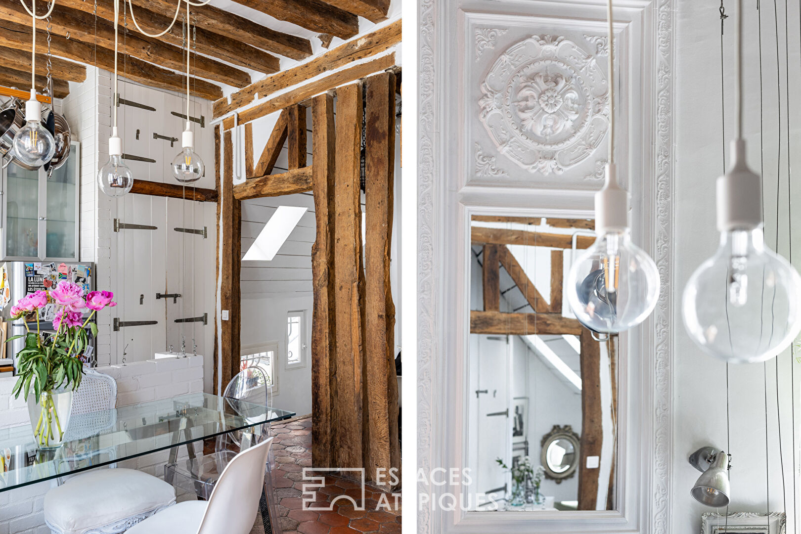 A deux pas de la rue de Bretagne et de la mythique Place des Vosges, se cache un appartement en duplex à l'atmosphère unique. Niché au dernier étage d'un immeuble aux parties communes soigneusement entretenues, ce bien de 60,66 m² au sol (47,64 m² Carrez) est un lieu de vie de caractère, chaleureux et inspirant. Dès l'entrée, le charme opère : volumes généreux, lumière naturelle traversante grâce à sa double exposition Sud-Est et jeu de perspectives qui participe à l'identité des lieux, Ici, tout invite à la douceur de vivre. La vue dégagée sur les toits de Paris renforce l'impression d'habiter un endroit à part, comme une petite maison perchée sous les toits. Le premier niveau ouvre sur une pièce de vie baignée de lumière dont la hauteur sous plafond de plus de 3 mètres vient sublimer l'espace. Celle-ci se compose d'une cuisine aménagée et d'un salon où chaque détail raconte une histoire. Les poutres apparentes, les tomettes, la cheminée et les radiateurs d'époque créent une atmosphère à la fois élégante et typiquement Parisienne. Un coin bureau vient compléter l'ensemble. A l'étage inférieur, se dévoile un espace plus intimiste avec une chambre mansardée et sa baignoire en fonte, une salle d'eau avec dressing, ainsi que des WC séparés. Chaque détail a été pensé avec soin jusqu'aux rangements sur mesure. Plus qu'un simple appartement, c'est un bien rare situé dans l'un des quartiers les plus recherchés de la capitale, où se mêlent vie culturelle, art de vivre, gastronomie, mode et patrimoine historique. Métro : Saint-Sébastien-Froissart, Arts et Métiers, Saint-Paul Ce bien est soumis au statut de la copropriété. CLASSE ENERGIE : E / CLASSE CLIMAT : E. Montant moyen estimé des dépenses annuelles d'énergie pour un usage standard, indexées aux années 2021, 2022, 2023 : entre 1290 euros et 1800 euros (abonnement compris). Les informations sur les risques auxquels ce bien est exposé sont disponibles sur le site Géorisques : https://www.georisques.gouv.fr. Contact : Sandra Mascio 06 27 52 75 81 - RSAC : 510 809 171 Paris Copropriété de 17 lots - dont 17 lots habitation. (Pas de procédure en cours). Charges annuelles : 2040 euros. Sandra Mascio (EI) Agent Commercial - Numéro RSAC : 510 809 171 - PARIS.