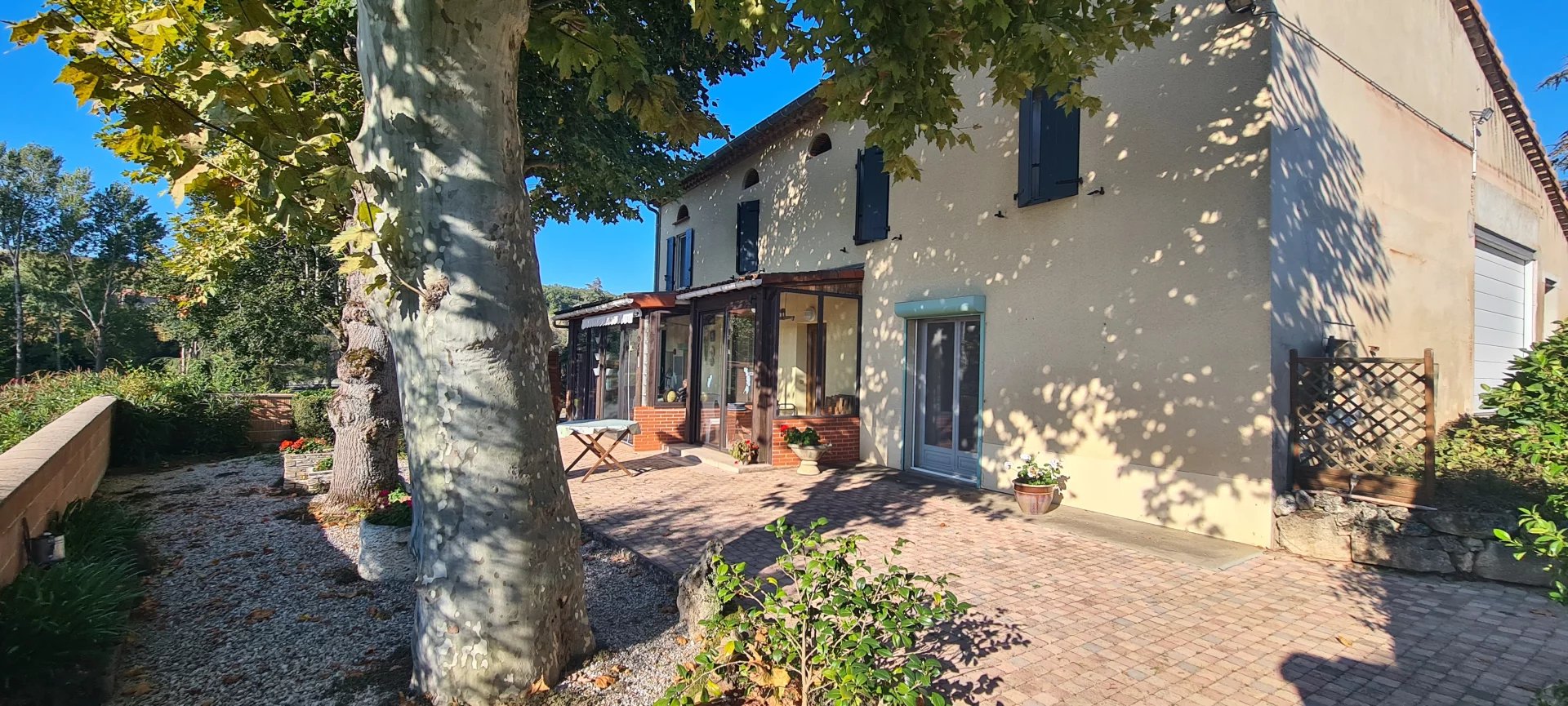 A 3 km de Réalmont, belle maison en pierre rénovée de 150m² habitable, comprenant en rez-de-chaussée une cuisine équipée, salon-séjour avec cheminée insert et distributeur de chaleur, grand cellier, veranda de 25m², toilette.