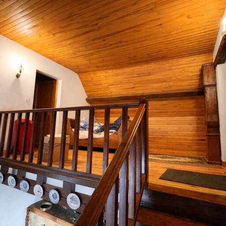 À l'étage, une mezzanine ouverte sur la salle à manger peut accueillir un lit. De chaque côté, deux chambres disposent de placards et d'un dressing.