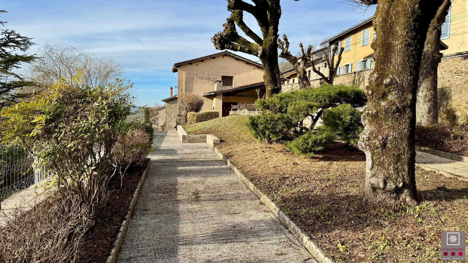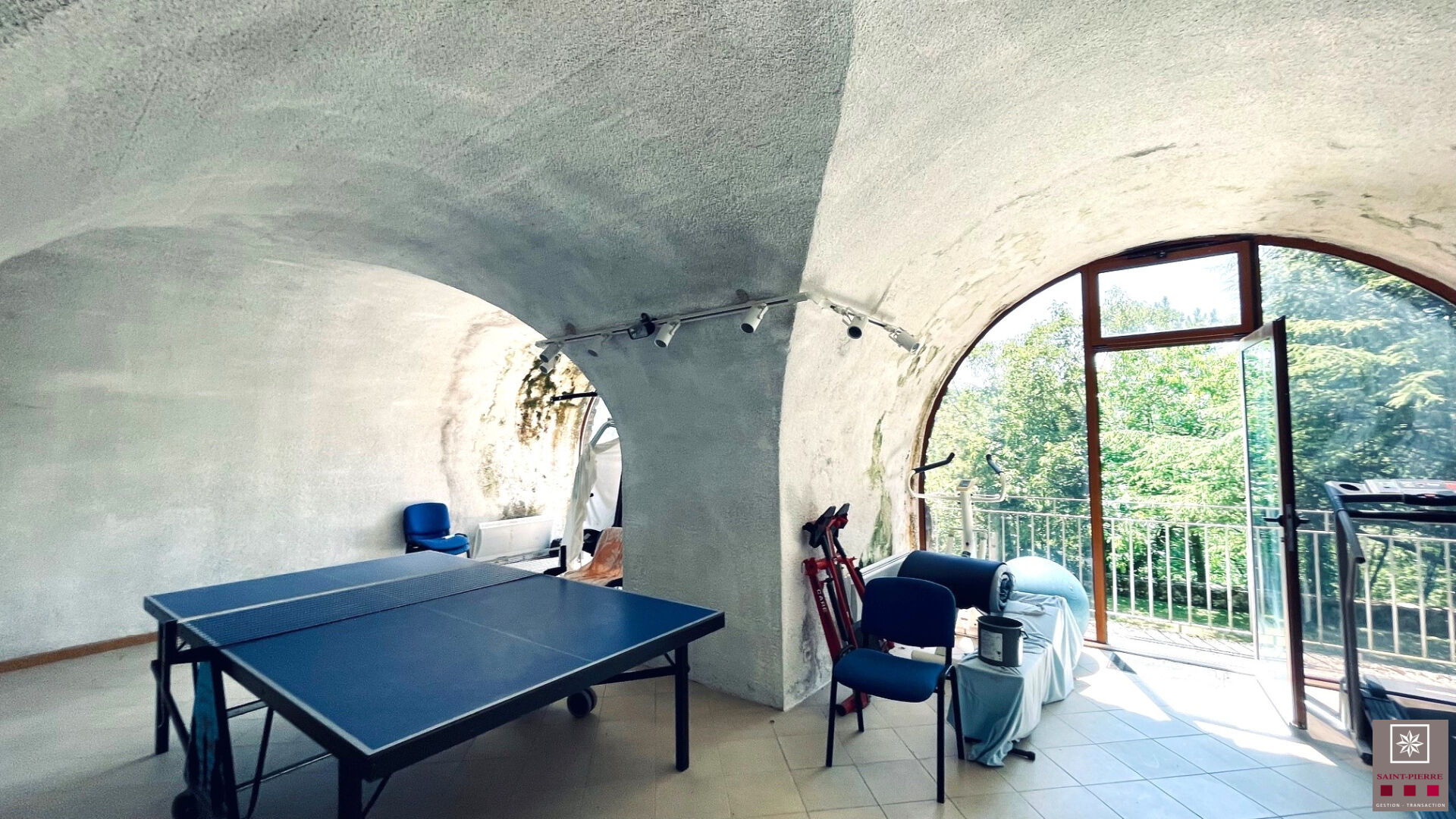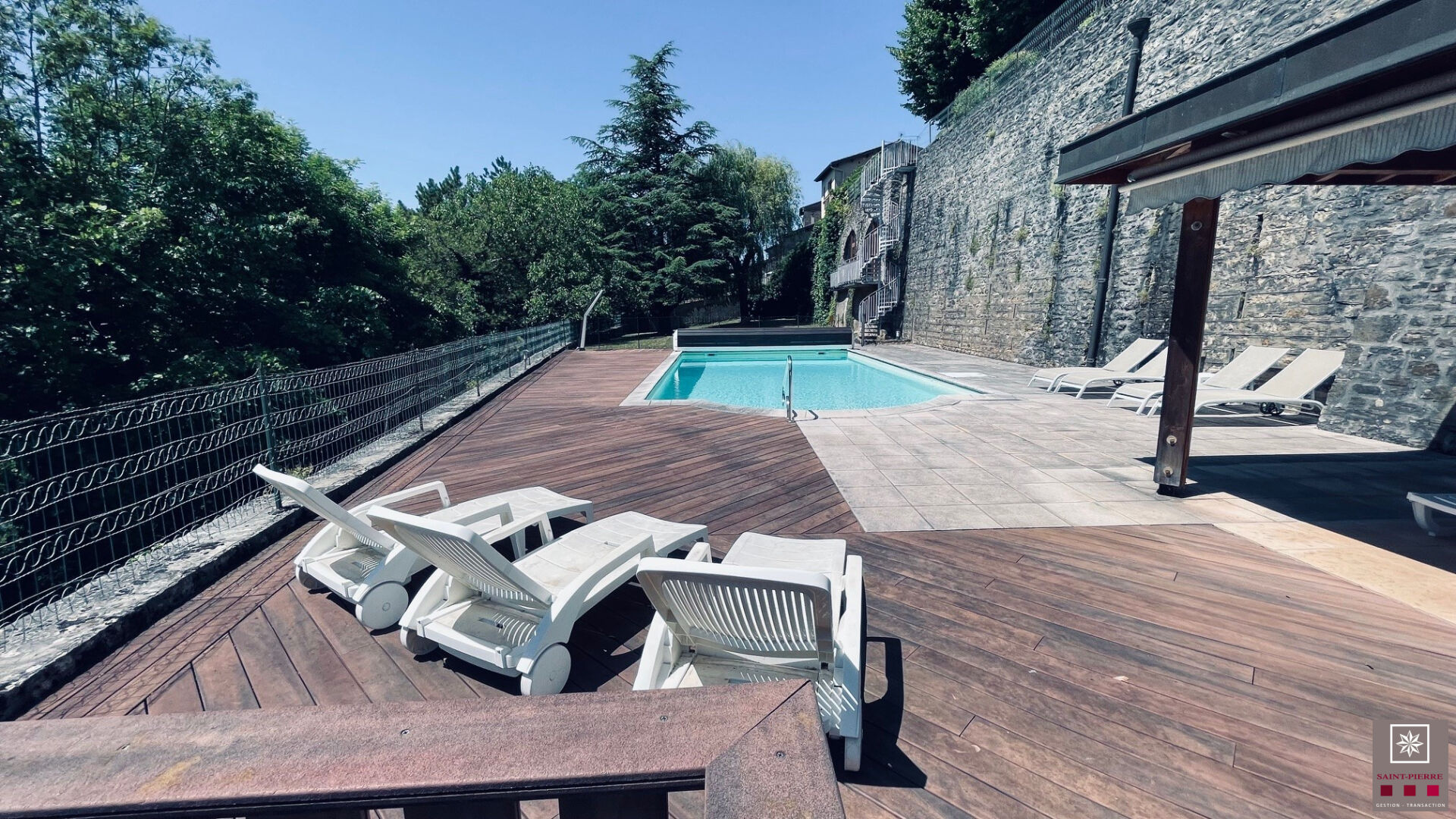 Sur les hauteurs du village de Saint-Germain à 5 minutes du centre d' Ambérieu en Bugey et à 15 minutes d' Ambronay, célèbre pour ses festivals de musique : Un ensemble immobilier rare, édifié sur un terrain de plus de 9 000 M² avec parcs et bois, composé de 2 maisons dont une bâtisse dominant les monts du Bugey et une deuxième maison à rénover, pour la famille ou la location saisonnière : en effet, la proximité avec le château de Saint-Germain, les chemins de randonnées vers le Lac Bleu et le festival de musique d' Ambronay, permettent aisément d'envisager un projet d'hébergement saisonnier, dans cette deuxième maison située à l'extrémité du parc qui bénéficie d'une entrée privative indépendante. La demeure principale, sur cave, est élevée sur un niveau et bénéficie d'une grande véranda donnant sur le jardin d'agrément. Au Sud-Ouest, deux terrasses surplombent la bâtisse : au Rez de Chaussée depuis le séjour et à l'étage depuis la chambre principale, permettant de profiter de la vue magnifique sur les monts du Bugey. Un aménagement sur deux niveaux, composés de 2 Chambres plus 1 bureau, 1 séjour cheminée, une salle à manger dans le prolongement de la cuisine, une arrière cuisine et une lingerie. La maison bénéficie de l'installation récente d'une climatisation sous pompe à chaleur réversible. La maison secondaire est composée de deux pièces principales plus cuisine, avec accès de plain-pied sur le jardin, ainsi qu'un préau permettant de garer 2 voitures plus une terrasse barbecue avec vue sur les monts du Bugey ; un grand garage double en sous-sol. Une particularité très rare complète ce bien : 2 salles voutées historiquement creusées dans la pierre surplombes le parc face aux monts du Bugey ; Un espace salle de sport est déjà aménagé et pourra évoluer vers un projet de cave à vin ou tout autre magnifique projet convivial. Sans oublier la grande piscine chauffée, avec son solarium et son pool house. 995 000 euros Honoraires inclus à la charge du vendeur. Un bien rare à visiter rapidement, contacter Christian MAILLET Régie Saint-Pierre Lyon