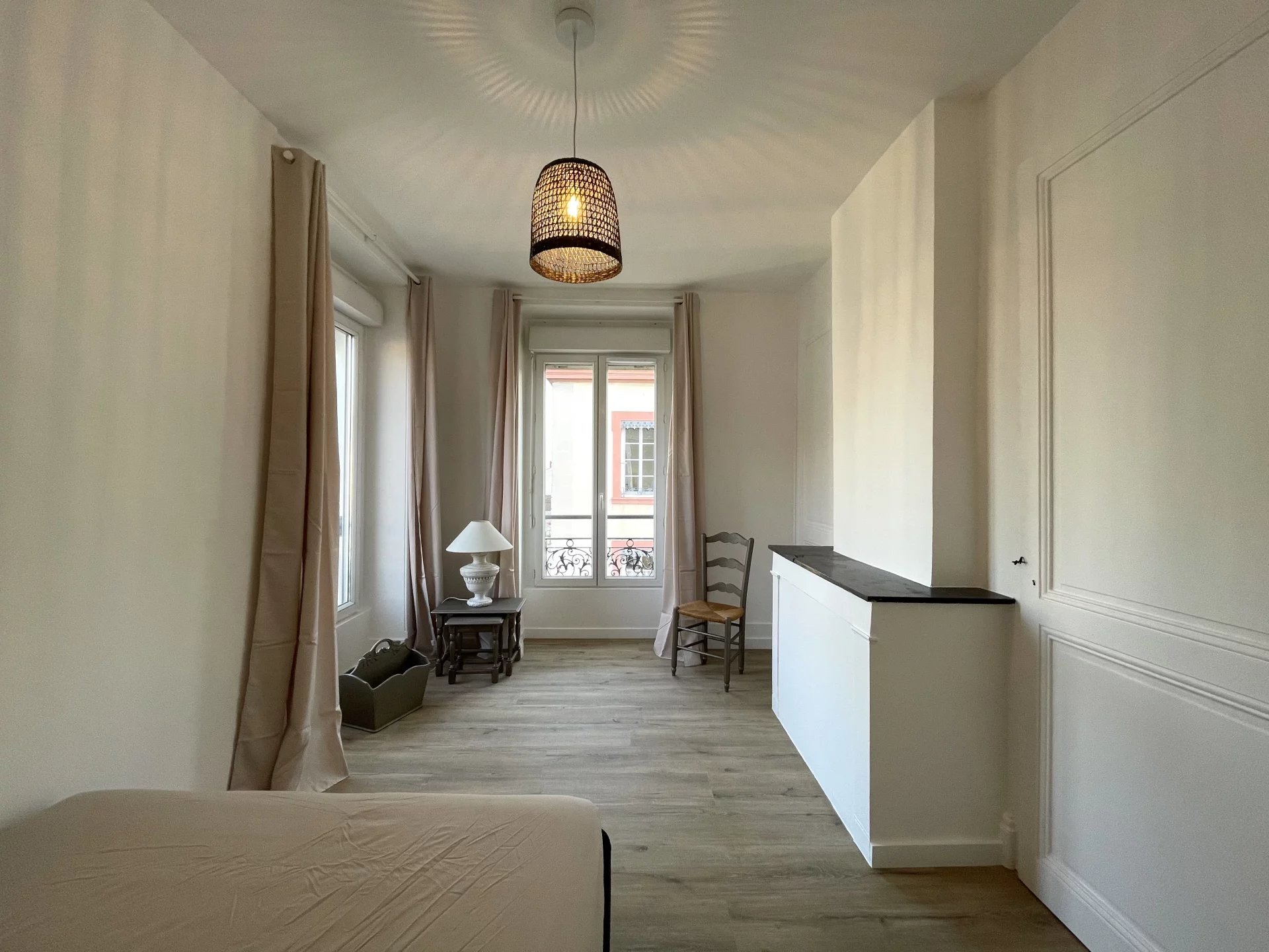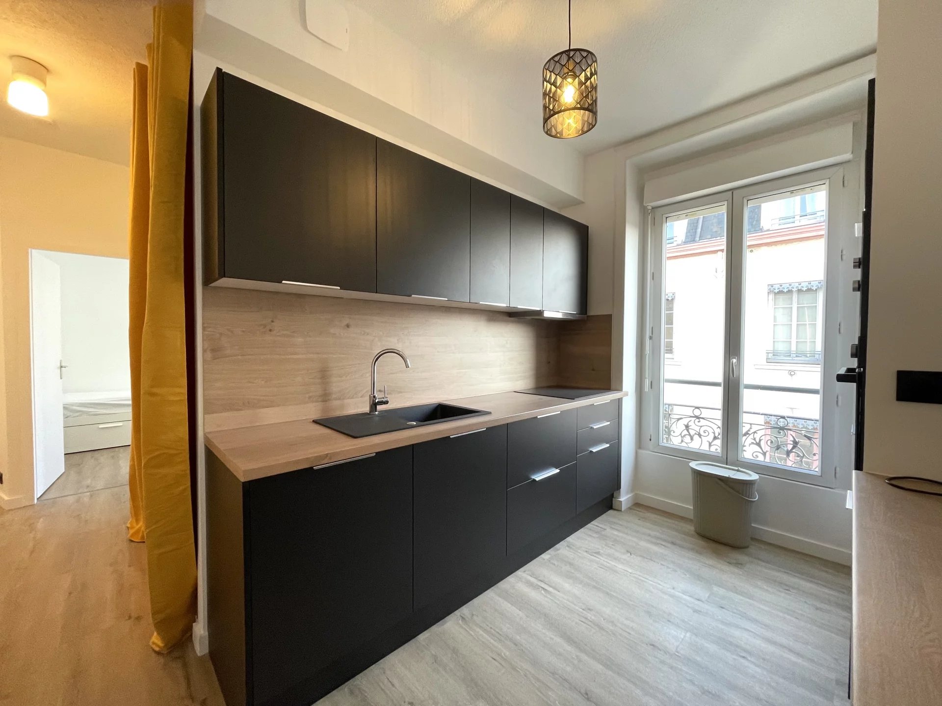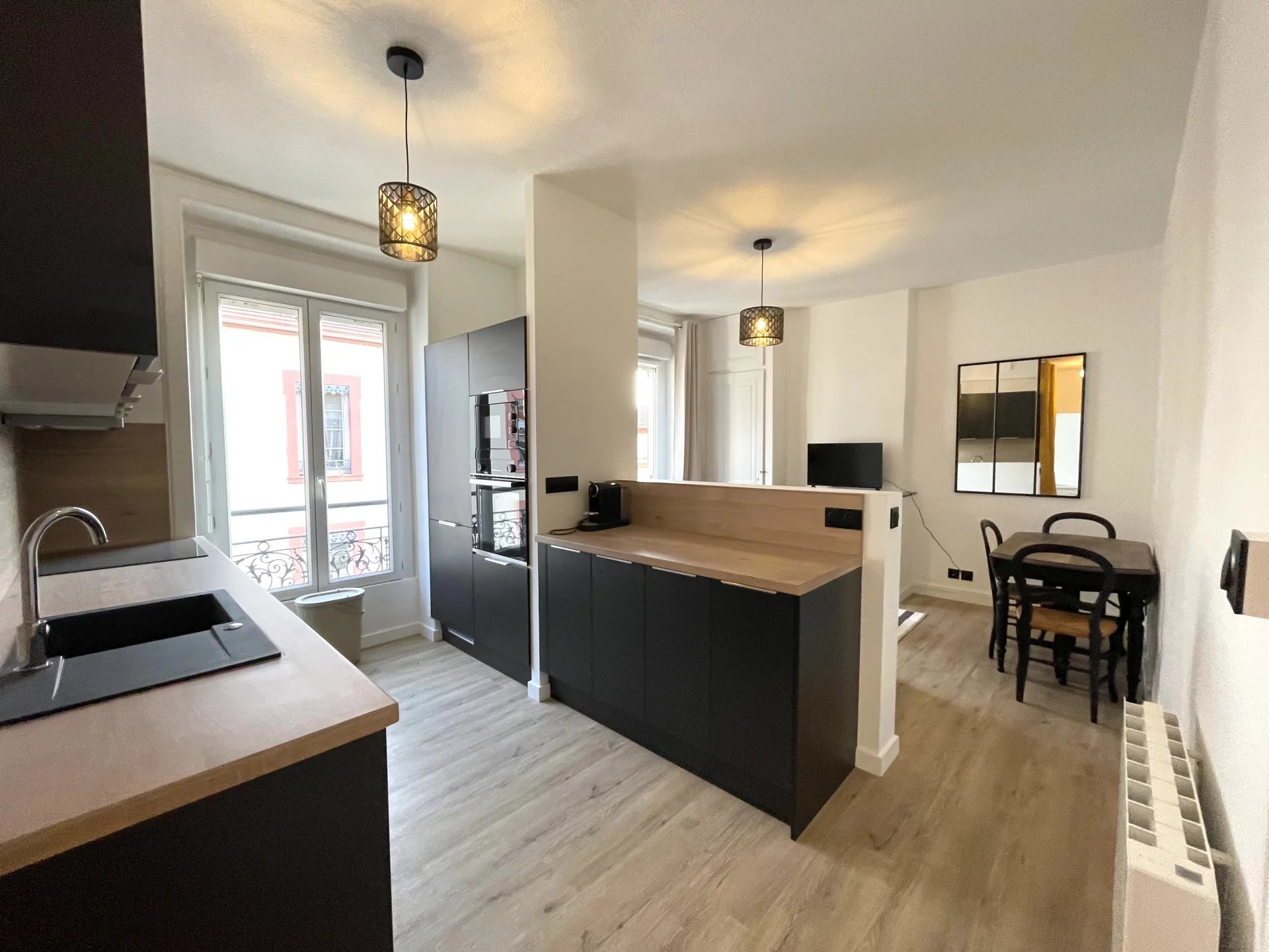 Entièrement rénové, l'appartement dispose d'une cuisine moderne haut de gamme, totalement équipée avec four, plaques de cuisson et de nombreux rangements, ouverte sur un séjour spacieux et chaleureux.