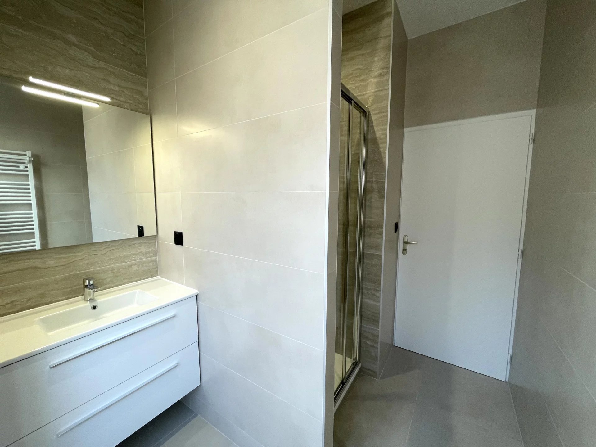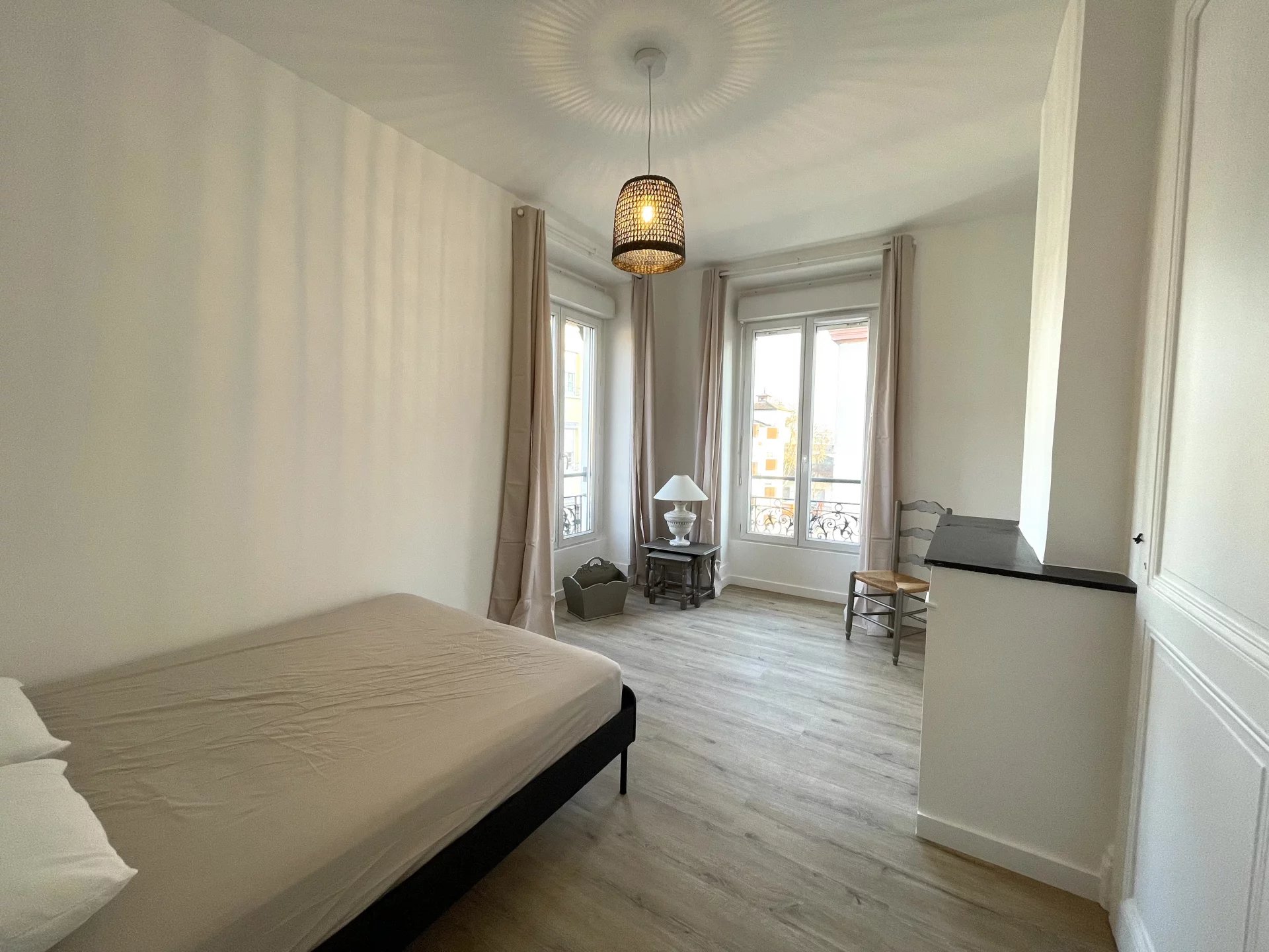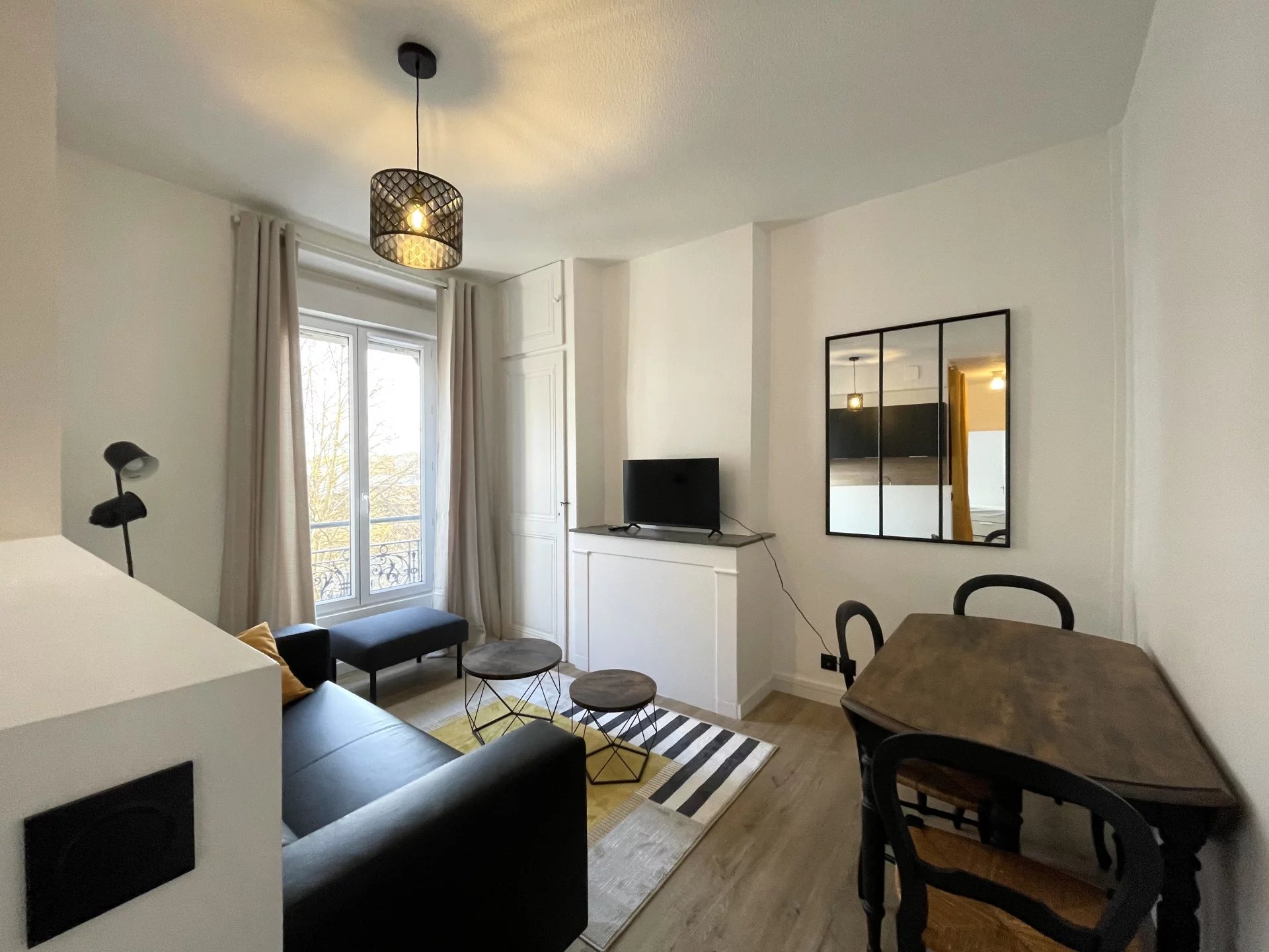 Entièrement rénové, l'appartement dispose d'une cuisine moderne haut de gamme, totalement équipée avec four, plaques de cuisson et de nombreux rangements, ouverte sur un séjour spacieux et chaleureux.