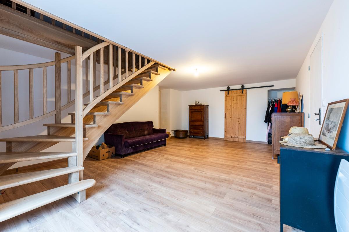 Un appartement indépendant avec un accès extérieur par escalier se compose d'un séjour cuisine ouverte de 24 m², une salle d'eau de 4,5 m², et une chambre de 10 m².