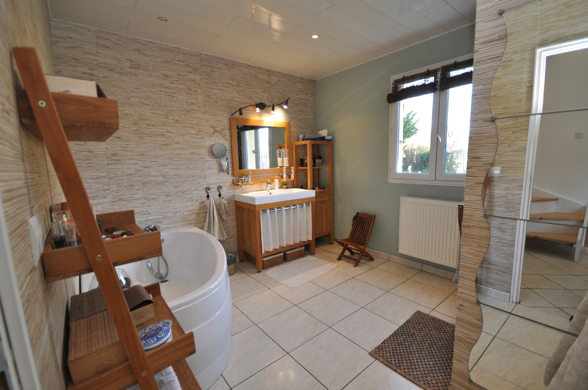 douche de 10.3 m², wc et une vaste buanderie. A l'étage on y trouve une jolie chambre confortable, un bureau (ou salle de jeux) et une dernière chambre sous les combles. La maison dispose aussi d'un garage de 24.8 m², d'un local de rangement de 13.8 m², d'une piscine enterrée de 8 m* 4 m,