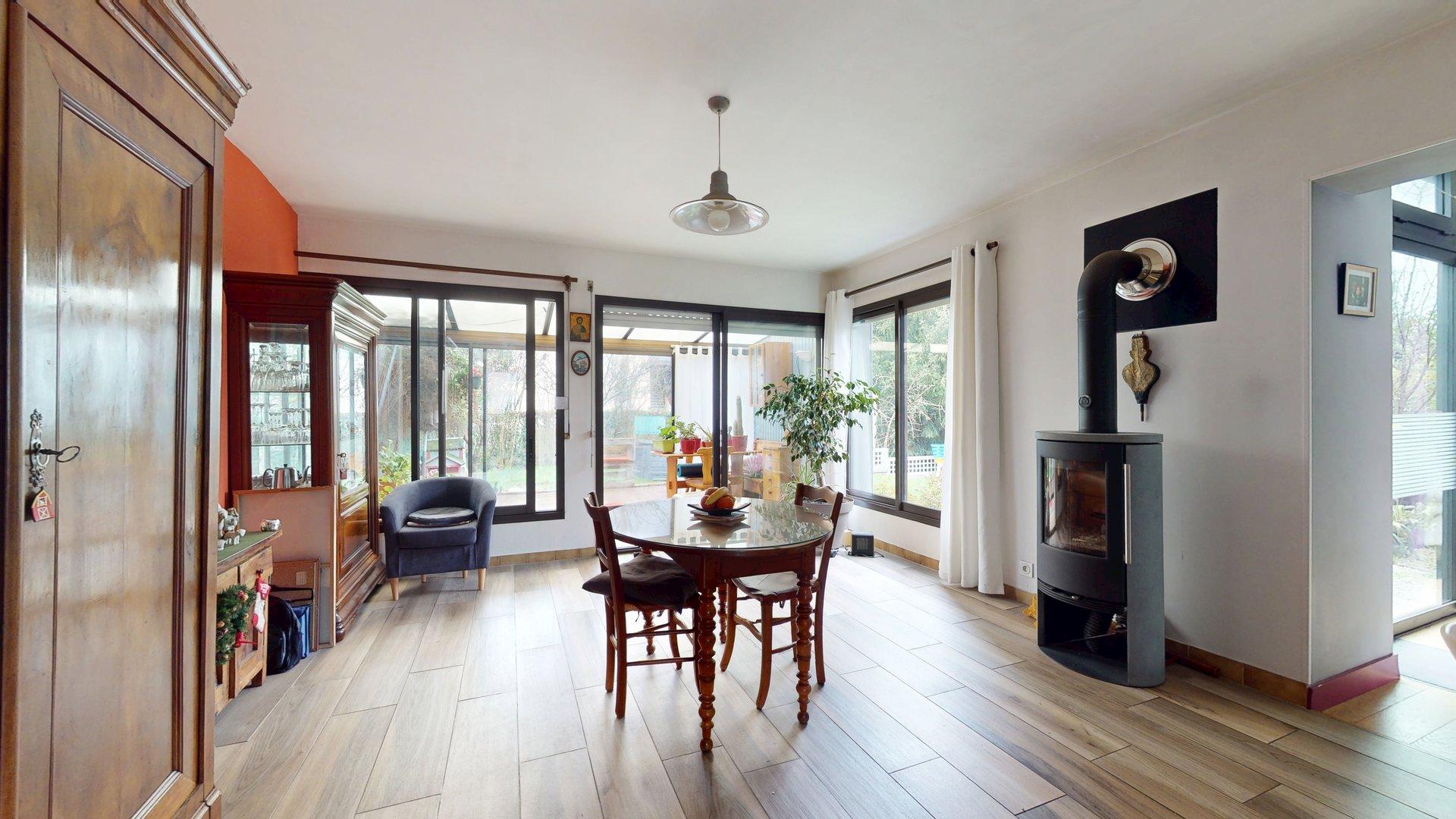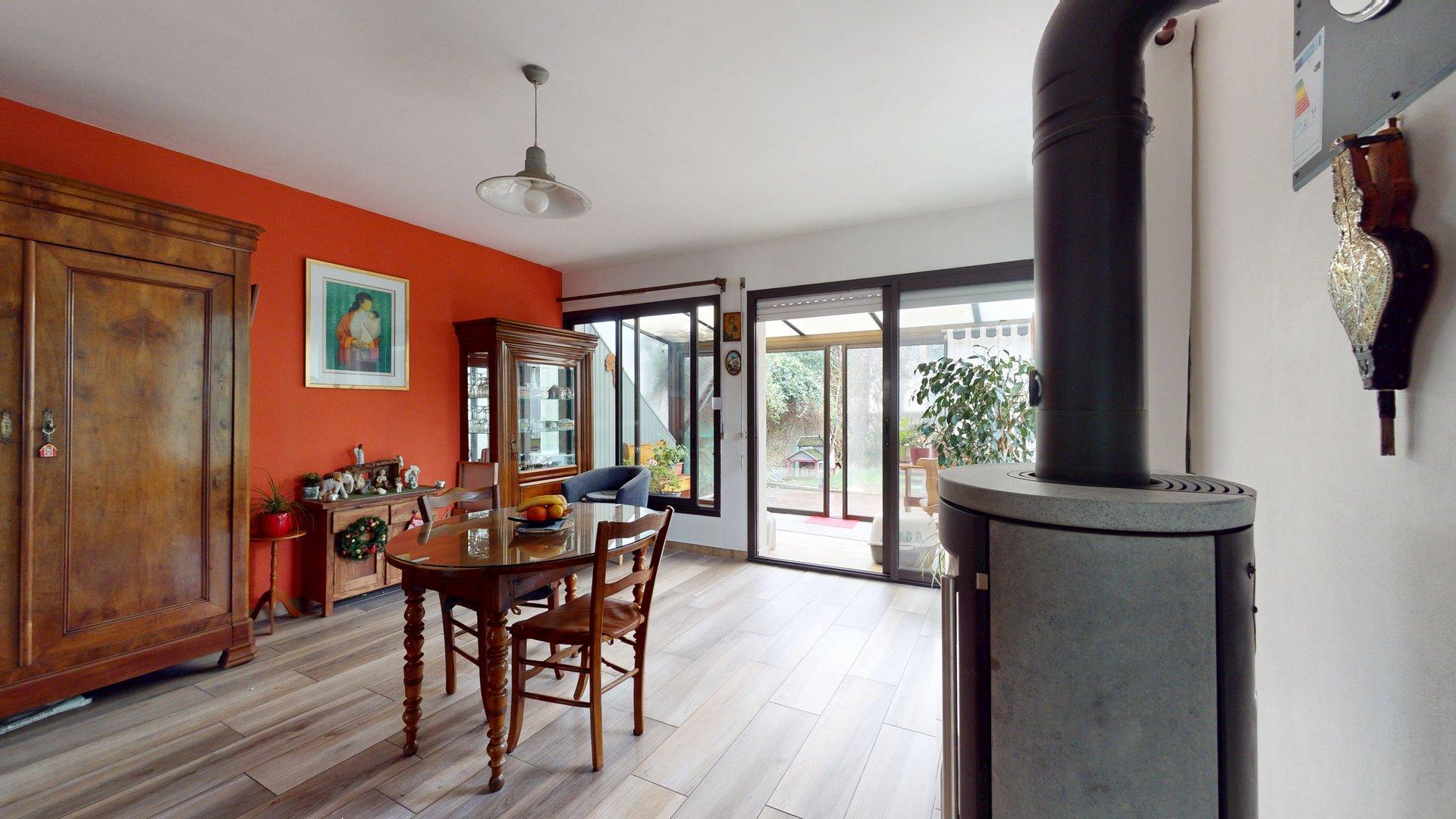 D'une salle à manger de 15m² équipée d'un poêle à bûches.