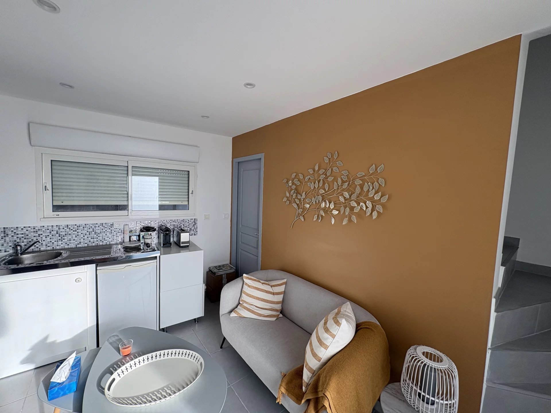 Un séjour avec espace cuisine ainsi que des WC séparés.