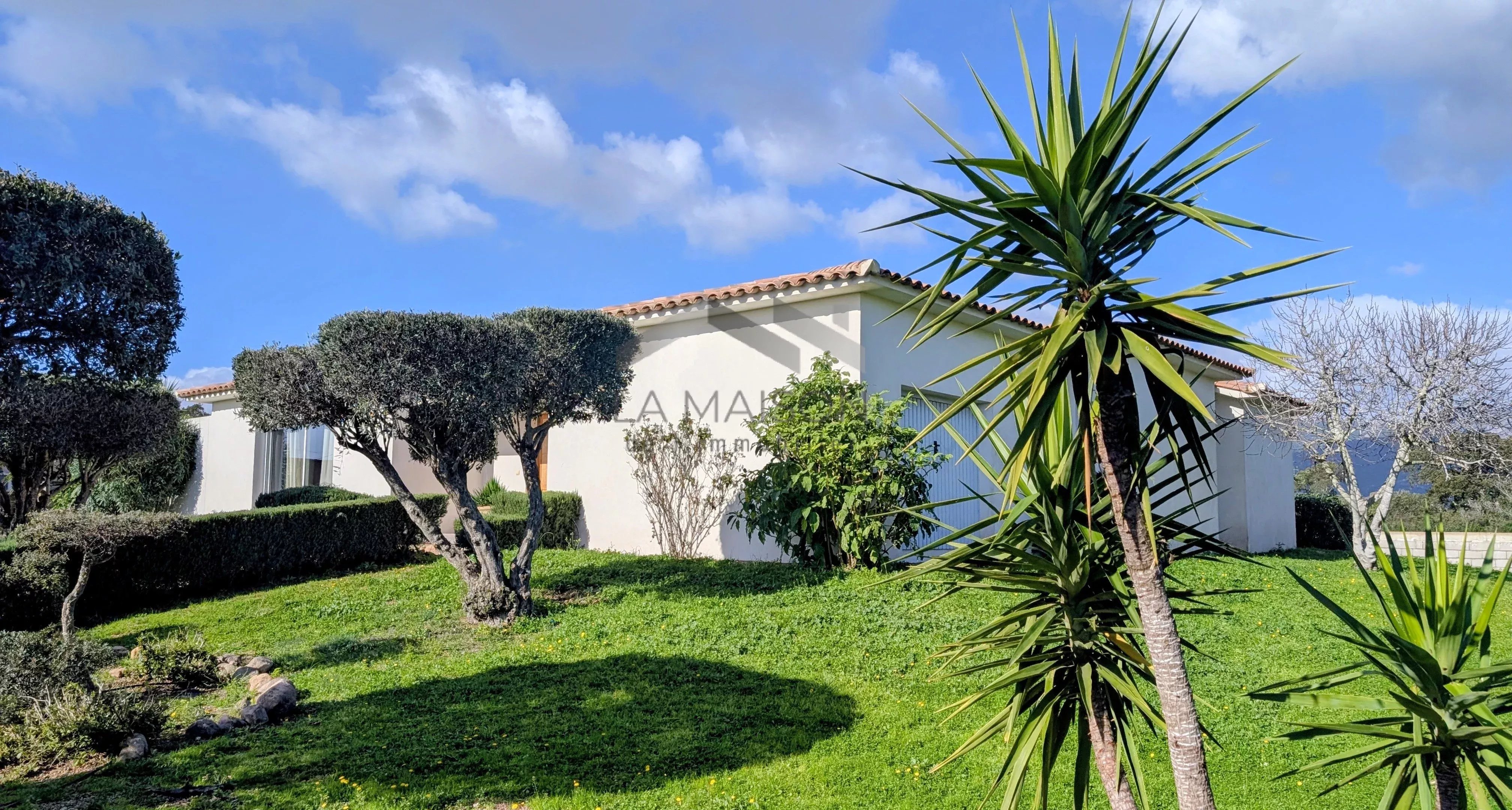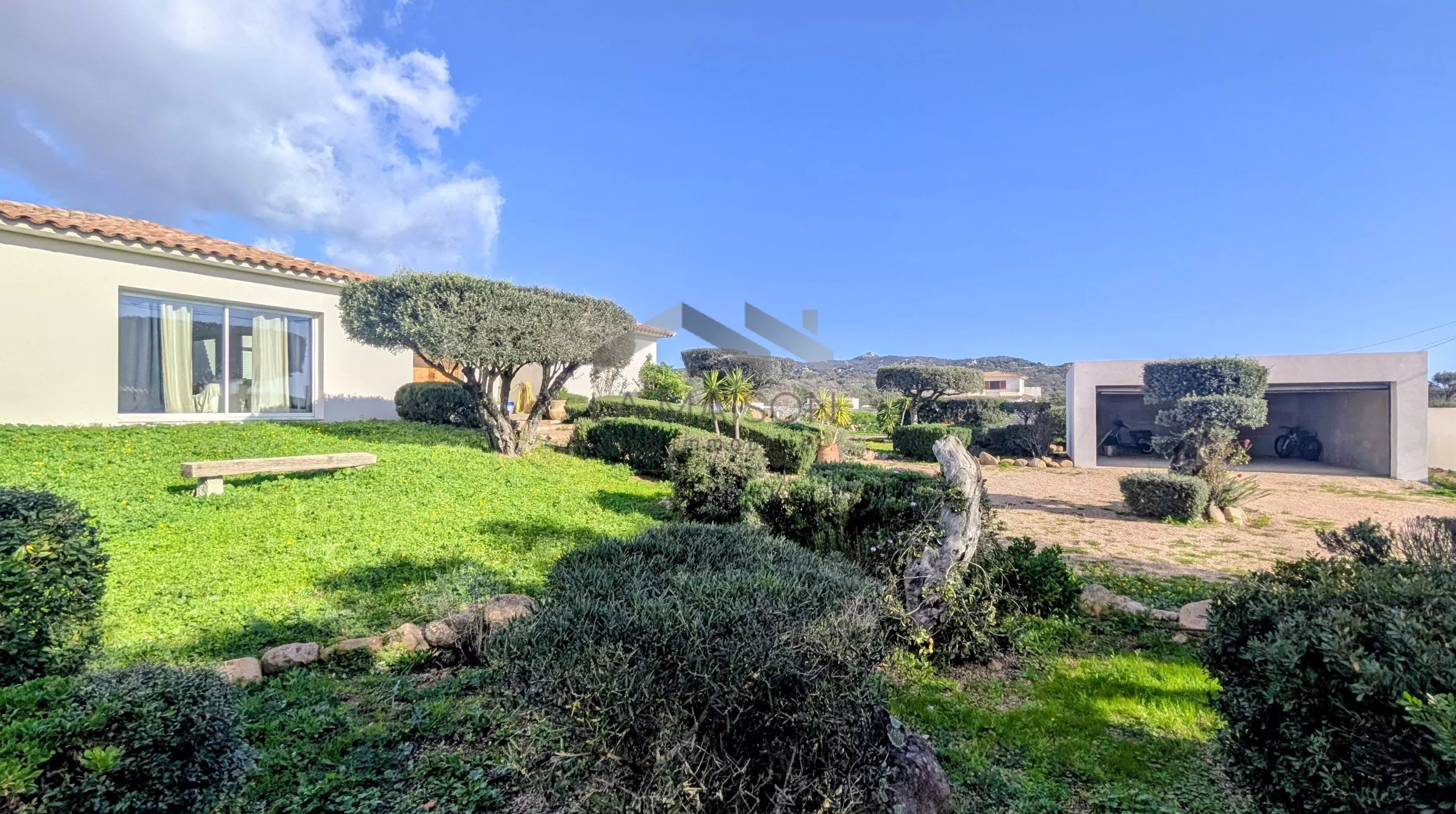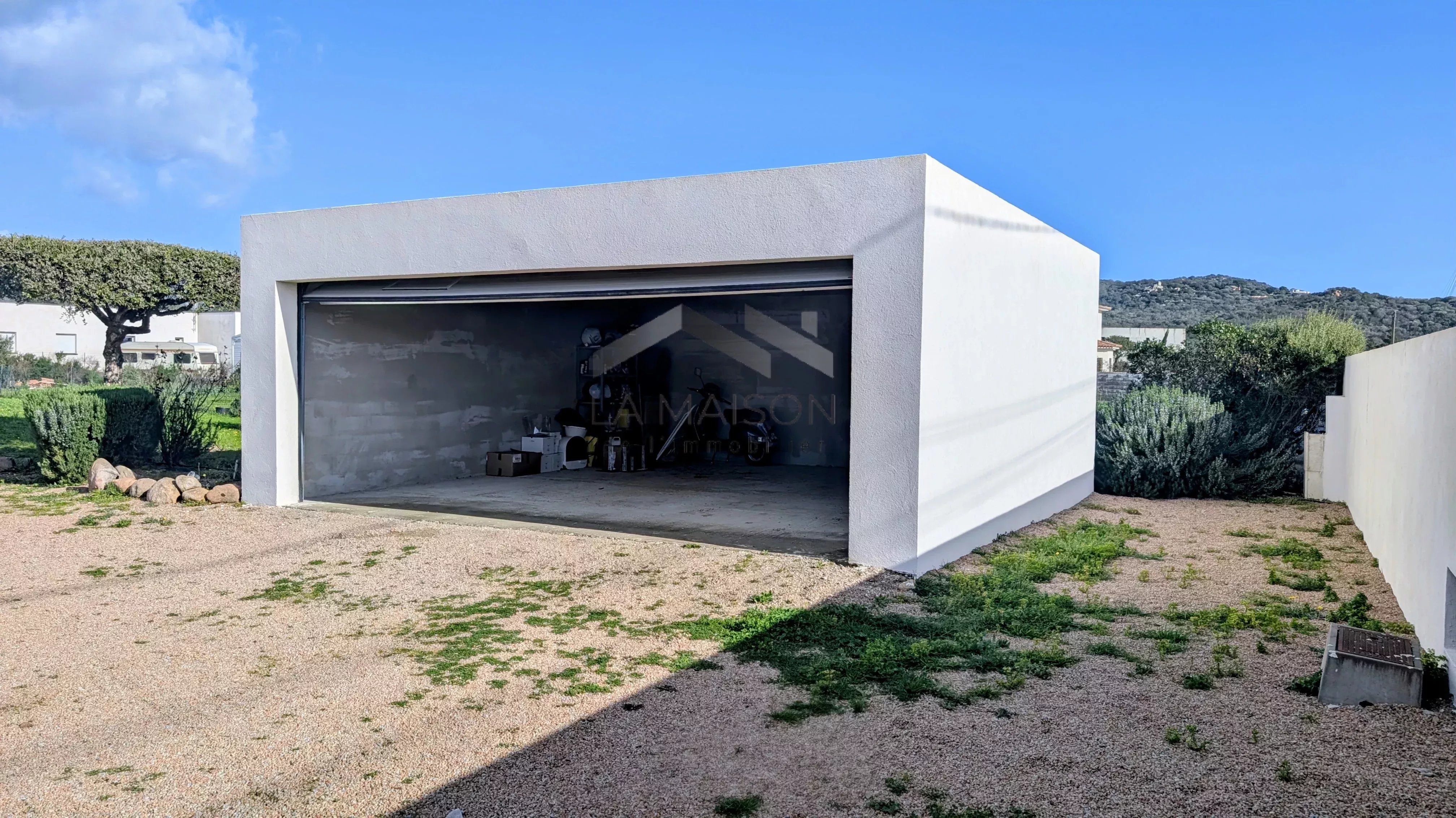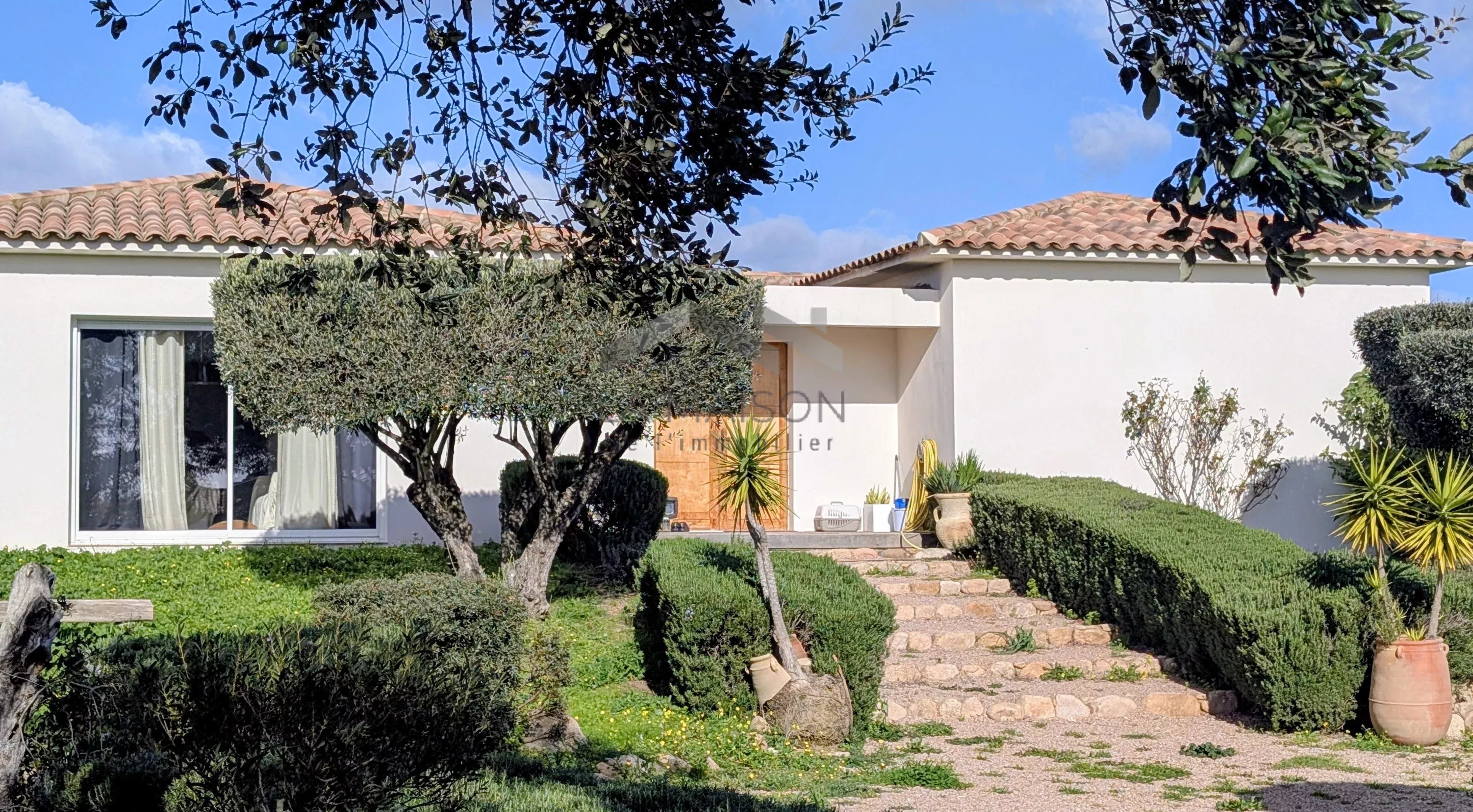 En Corse-du-Sud, sur la commune de Lecci, dans le quartier de Mora Dell'Onda, situé à 10 km au nord de Porto-Vecchio et à 5 minutes des superbes plages de Saint-Cyprien, Cala Rossa et Benedettu, au sein d’un environnement calme mais proche de toutes les commodités, une propriété d’architecture contemporaine construite en 2008 vous attend. Édifiée de plain-pied avec des matériaux et prestations de grande qualité sur un terrain de 3 661 m² entièrement clos, elle offre une surface habitable d'environ 169 m². Ce bien est composé de : - Une large entrée donnant sur un double espace de vie séjour / salle à manger / cuisine entièrement ouvert, - Un cellier, - Des toilettes invités, - Un dégagement menant à l’espace nuit comprenant 2 chambres avec dressing, - Une salle d'eau commune, - Une chambre parentale avec dressing et salle d'eau, - Un garage d’environ 18 m² attenant à la maison, - Un garage de 49 m² indépendant. Le terrain d'une superficie de 3 661 m² est entièrement constructible et permettrait la réalisation de nouvelles constructions ou un détachement parcellaire en vue d'une éventuelle vente.