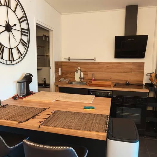 Cuisine moderne équipée (four, lave-vaisselle, hotte, plaque induction, grand réfrigérateur)