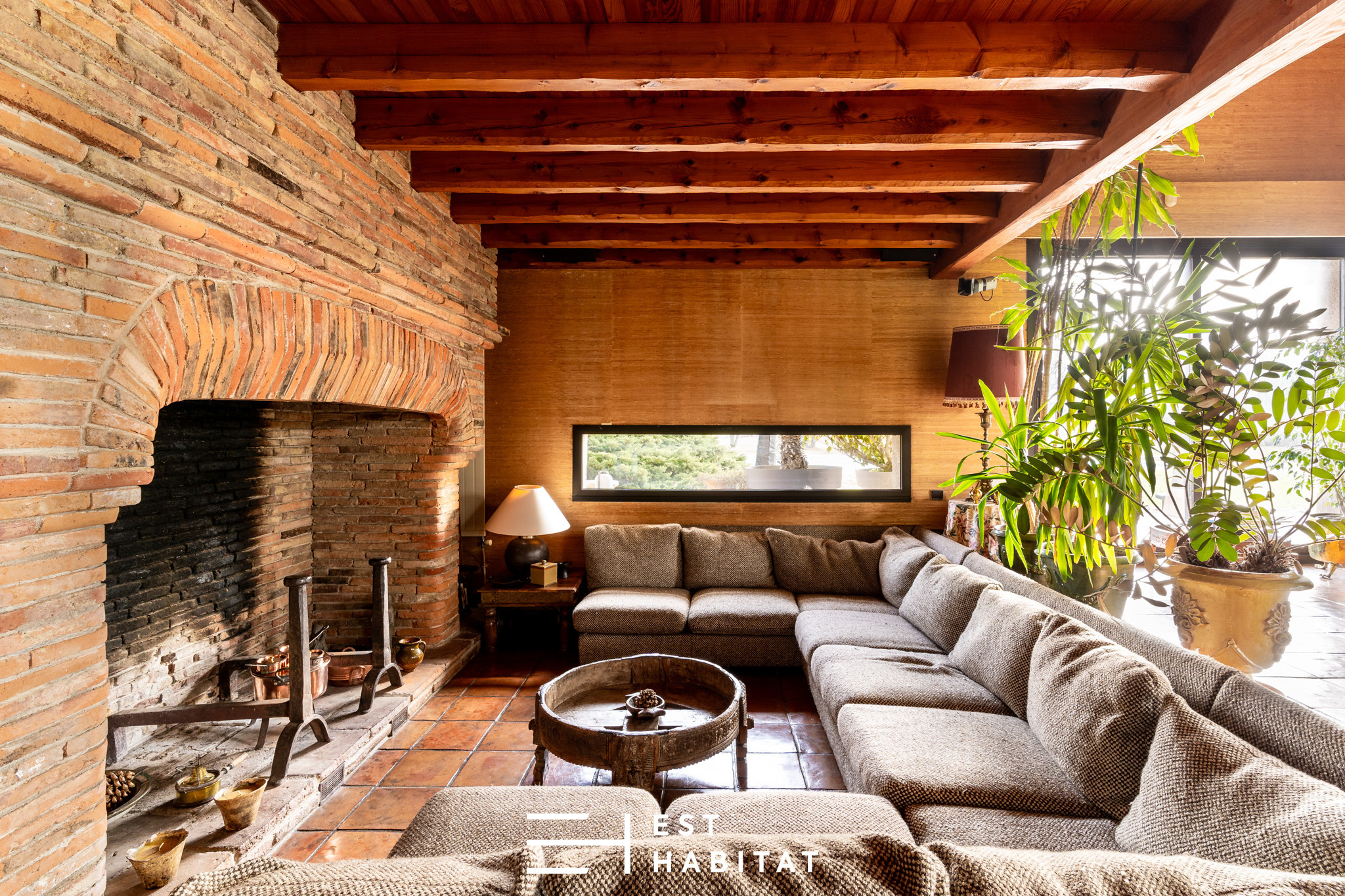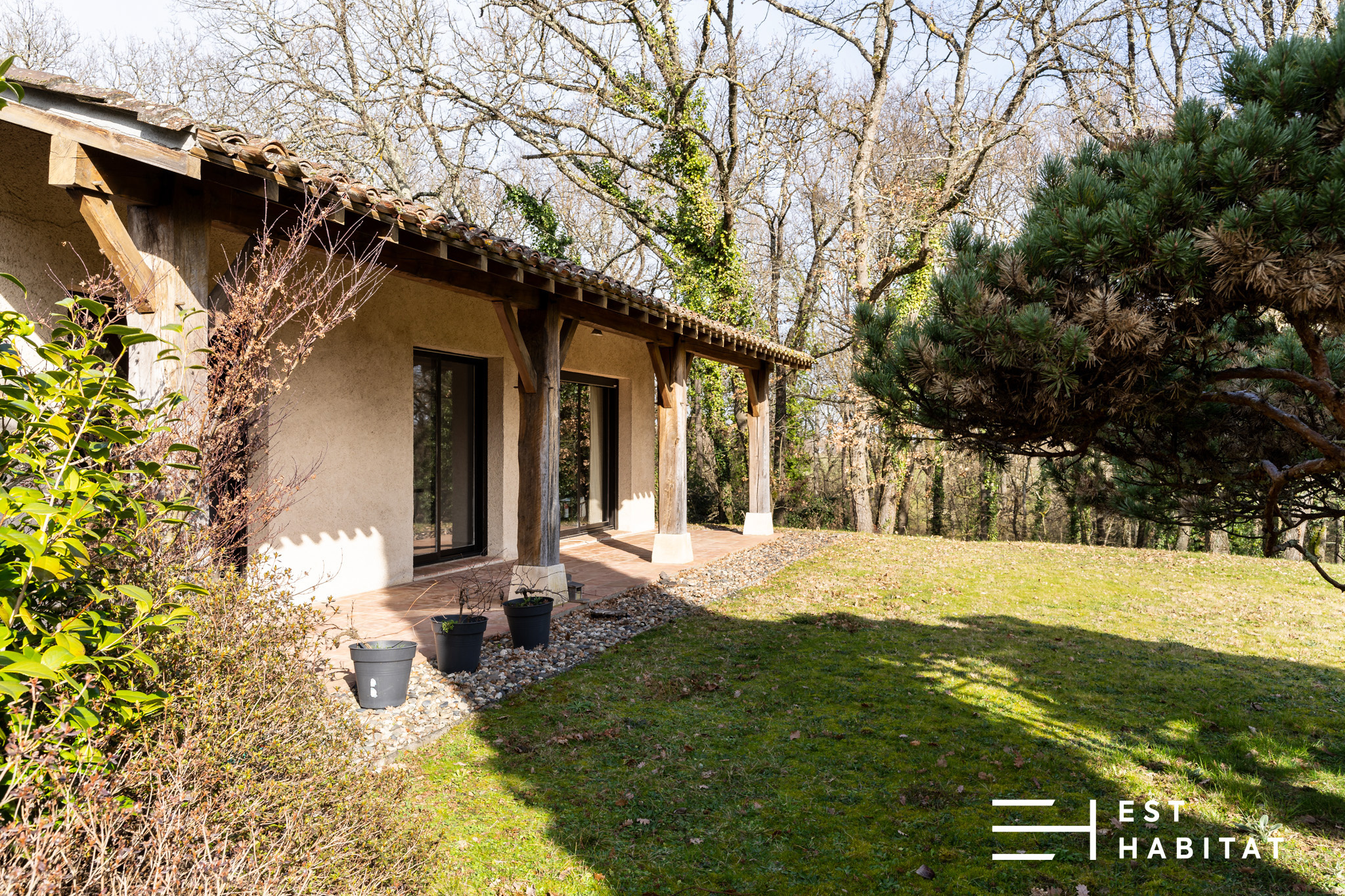 Construction de qualité avec de beaux volumes et de nombreux éléments remarquables comme la cheminée en briques toulousaines, les poutres apparentes et le sol en terre cuite moulée main.