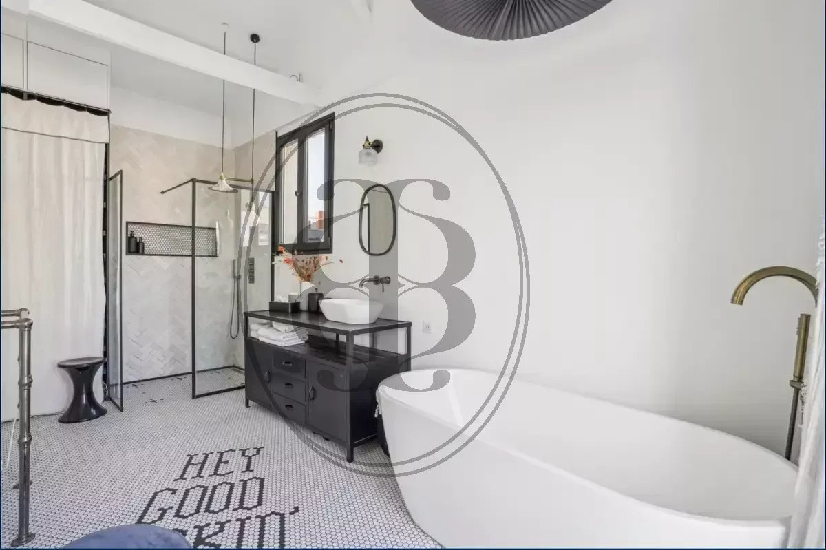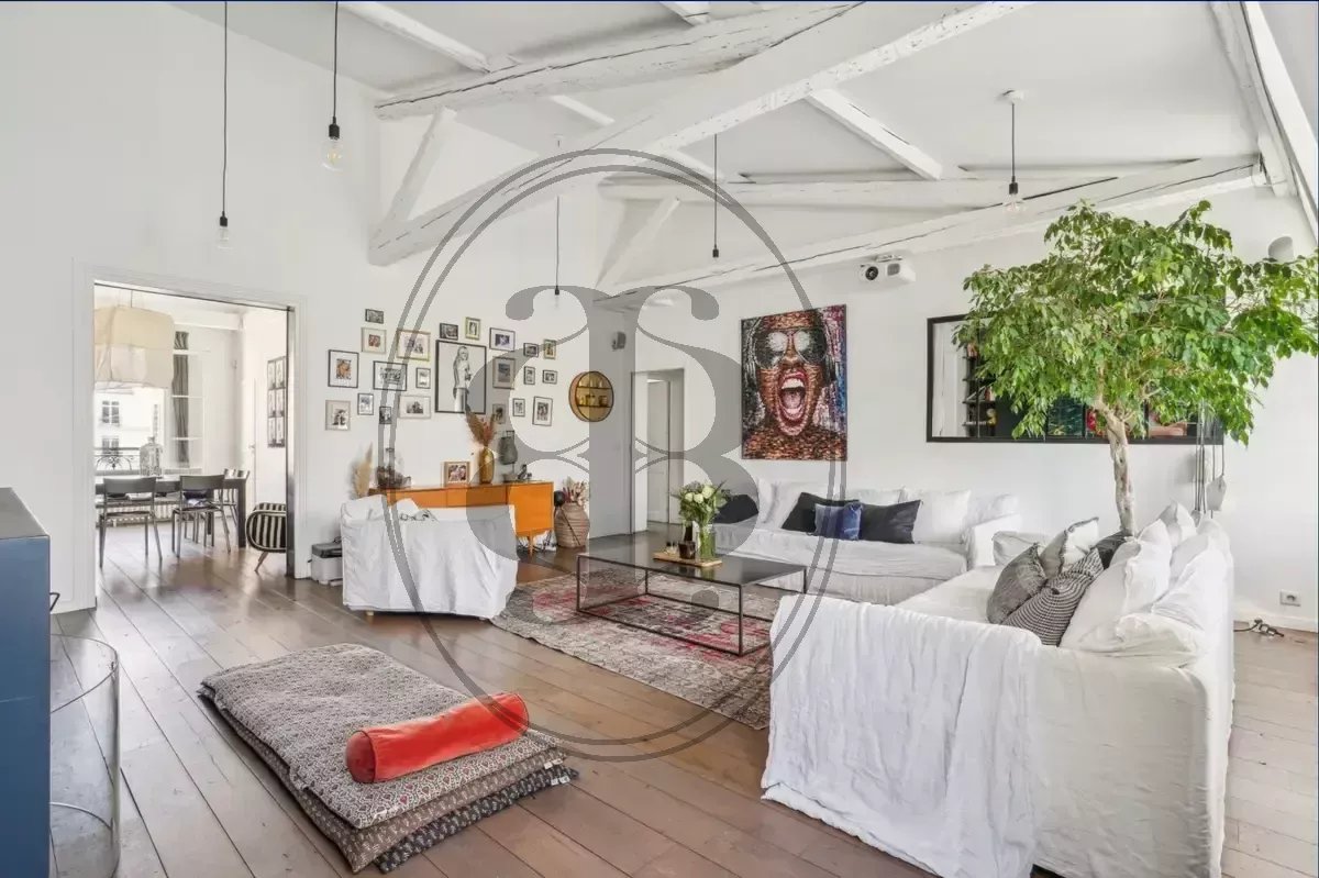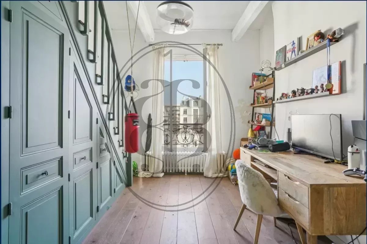 À Neuilly-sur-Seine, au dernier étage d’un élégant immeuble ancien, ce superbe appartement familial traversant et lumineux séduit par ses volumes et son authenticité. La pièce de réception s’organise autour d’un spectaculaire séjour cathédrale avec cheminée, bénéficiant d’une très belle hauteur sous plafond. La cuisine, attenante à la salle à manger, s’intègre harmonieusement à l’espace de vie tout en conservant son indépendance. Le niveau principal accueille trois chambres, dont une disposant de sa salle de douche, et deux agrémentées de mezzanines offrant de beaux espaces complémentaires. Une salle de bains indépendante complète cet étage. À l’étage supérieur, une suite parentale sous les toits constitue un véritable espace privilégié, avec dressing, salle de bains avec douche et terrasse privative sans vis-à-vis. Charme de l’ancien, volumes généreux et décoration soignée confèrent à ce bien un caractère rare sur le secteur. Une cave vient parfaire l’ensemble. Idéalement situé à proximité immédiate des commerces, des écoles et du métro Les Sablons, l’appartement dépend de la sectorisation du Collège André Maurois et du Lycée Pasteur, établissements particulièrement recherchés.