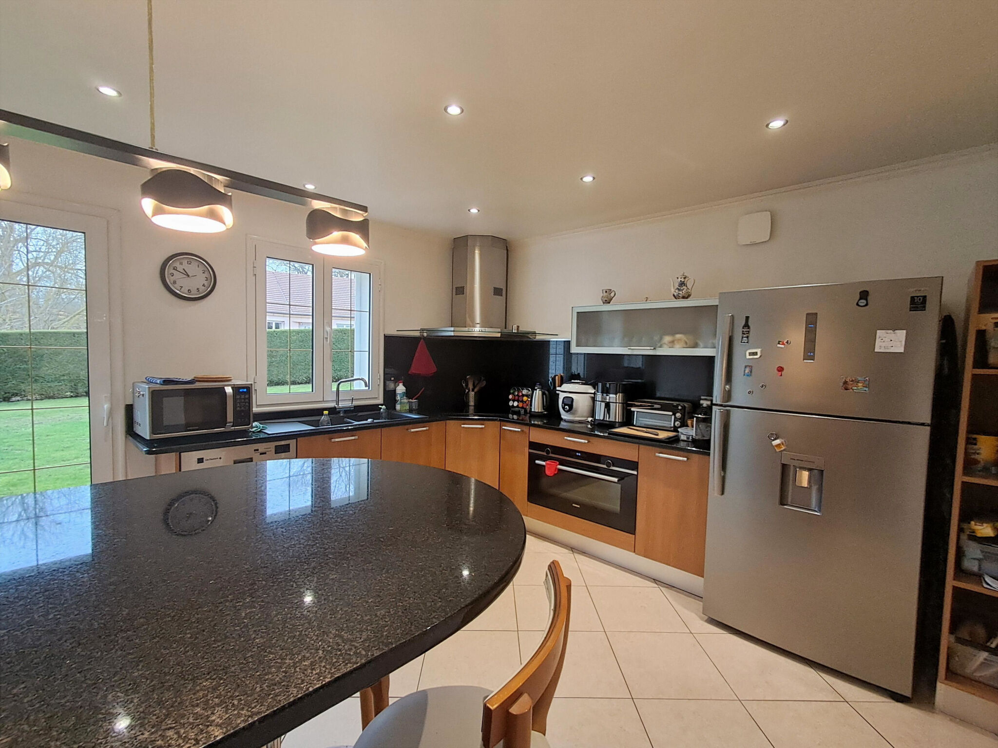 D'une surface habitable de 205 m², elle est implantée sur un terrain de 1266 m² bénéficiant d'une vue dégagée sur les champs.