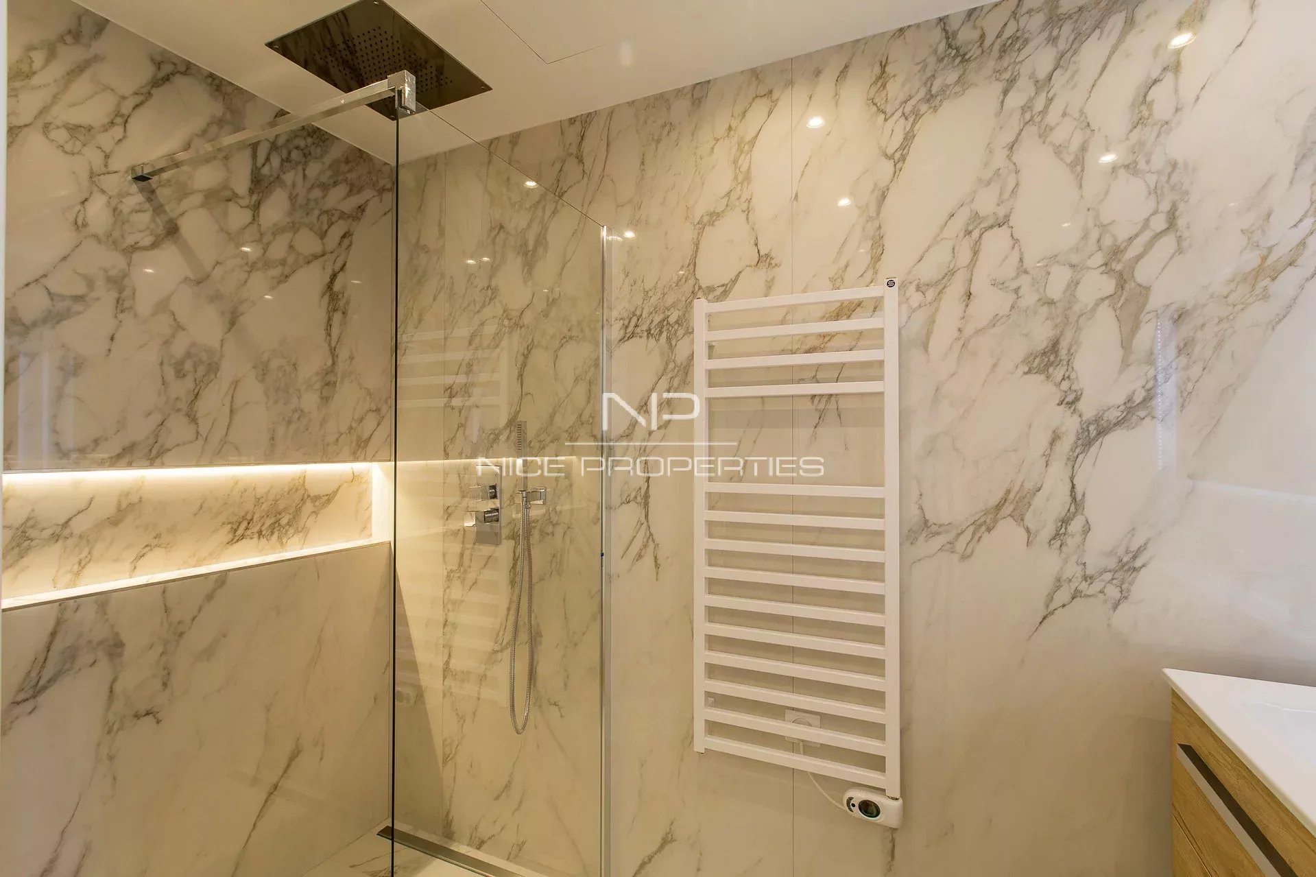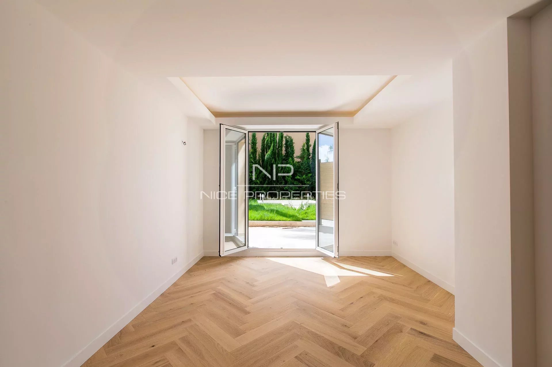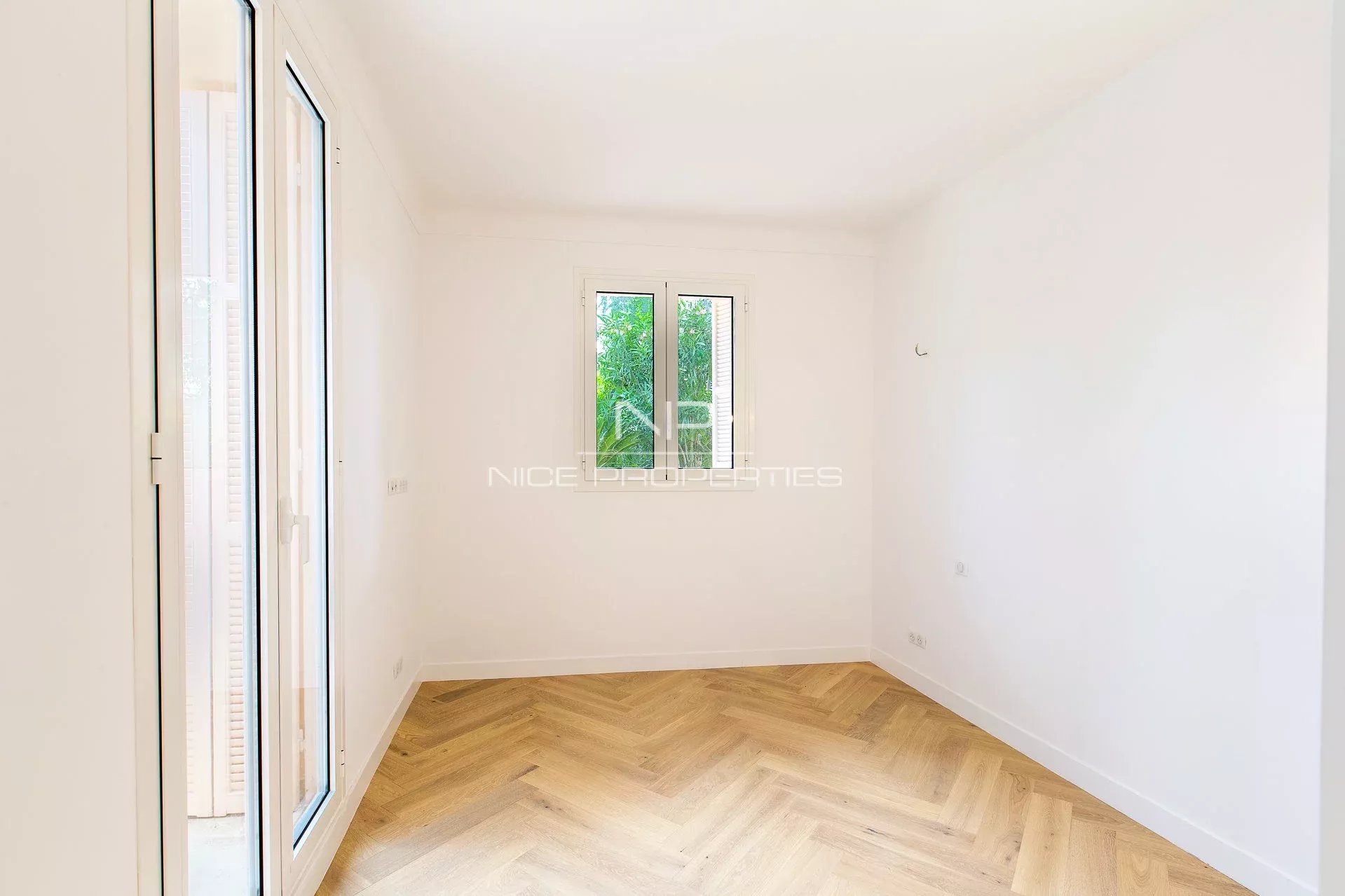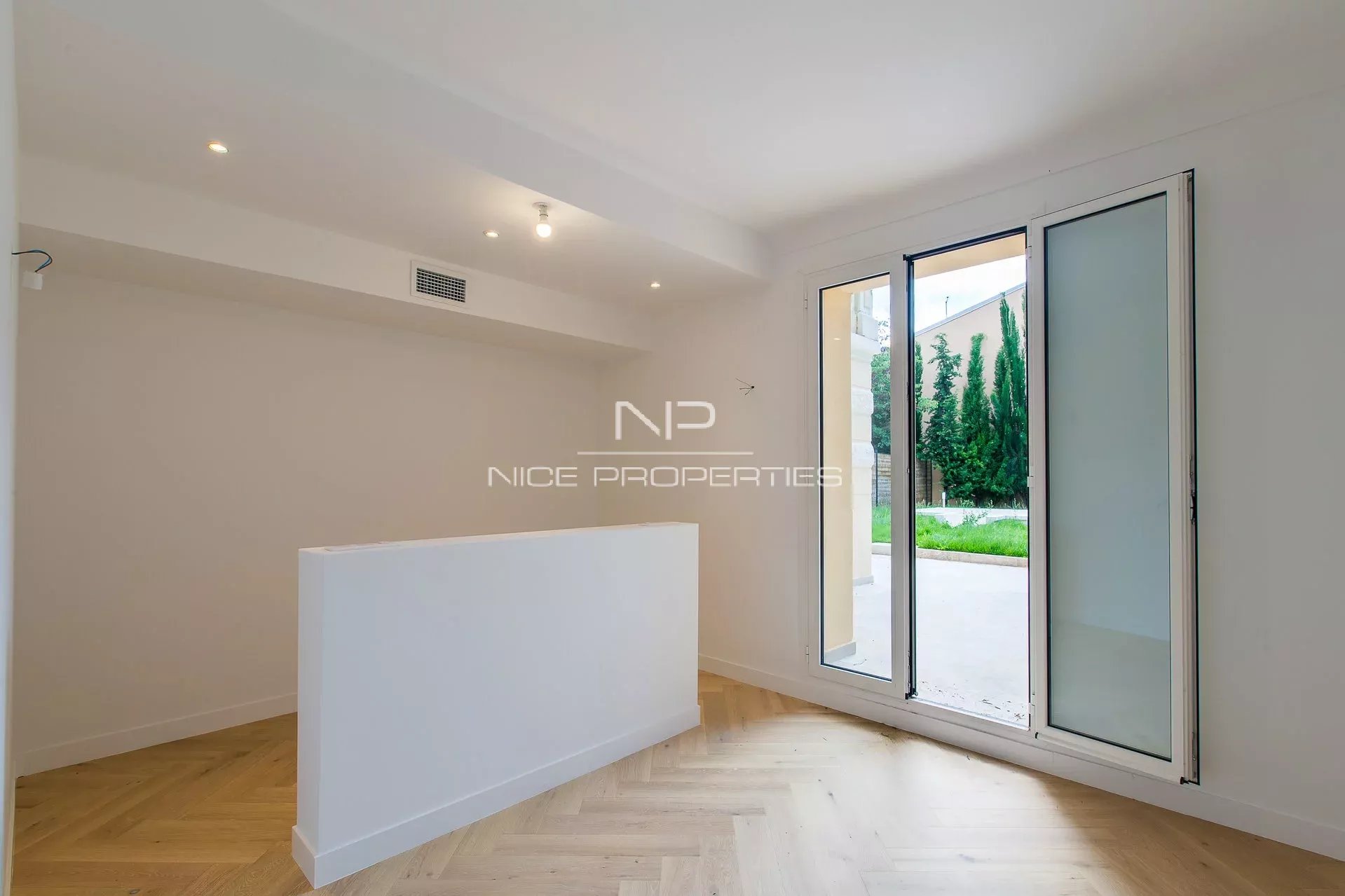 NICE COLLINES / GAIRAUT : Dans une magnifique maison bourgeoise, au calme et exposée plein sud, superbe appartement 3 pièces entièrement rénové et climatisé d'une surface de 80 m², ouvert sur un beau jardin privatif de 250 m² environ. Il se compose d'une entrée, beau séjour avec cuisine entièrement équipée, 2 chambres, salle de douche et WC indépendant. Petite cave, garage. Énormément de charme et très faibles charges.
