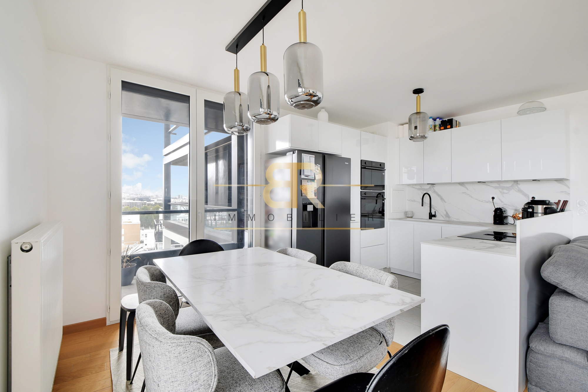 Séjour lumineux avec cuisine américaine ouverte, prolongé par une grande terrasse aux baies vitrées laissant entrer généreusement la lumière