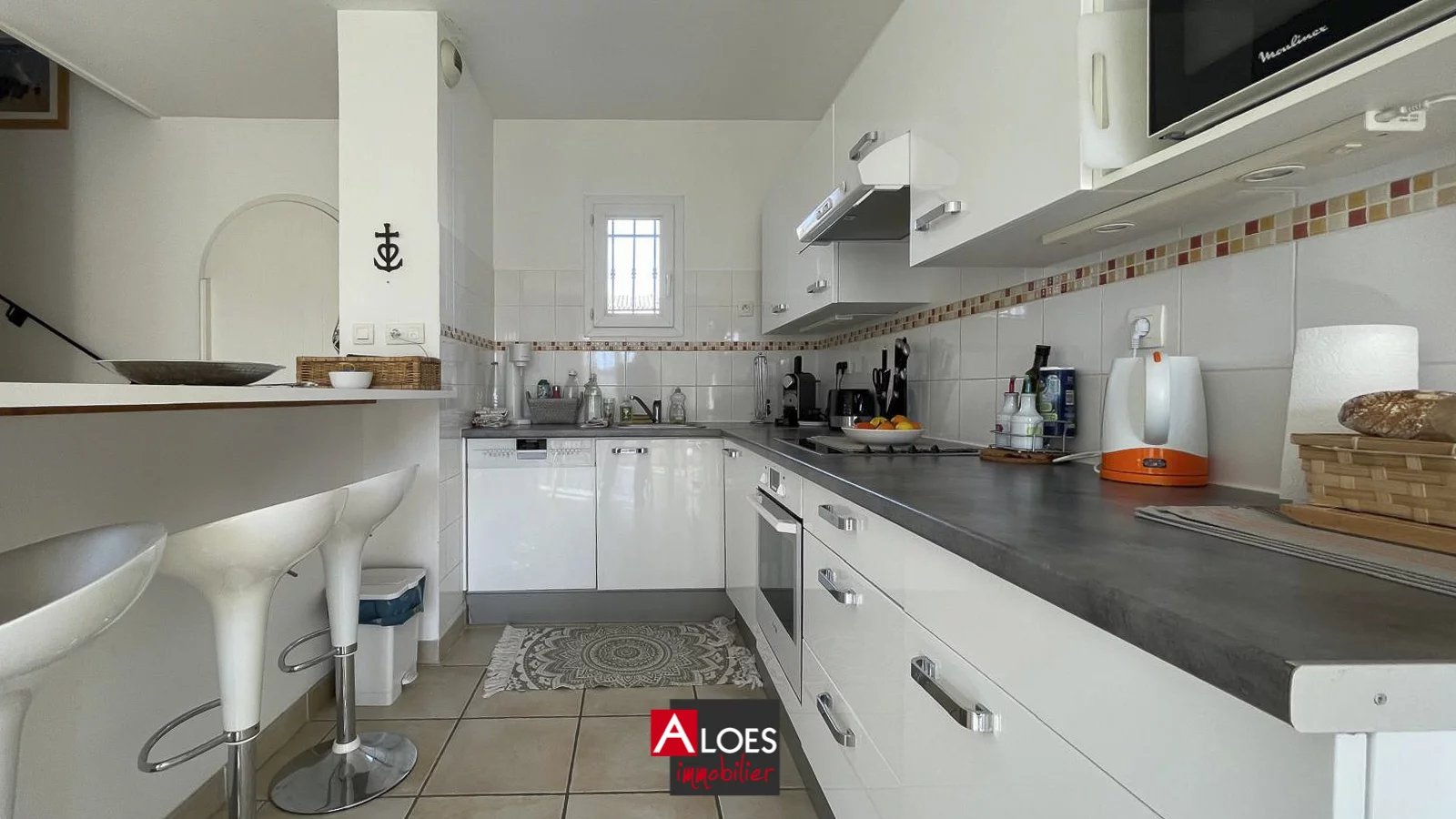Édifiée en rez-de-chaussée surélevé d’un étage, elle comprend au rez-de-chaussée une entrée, un séjour lumineux ouvrant sur la terrasse et la terrasse, ainsi qu’une cuisine fonctionnelle. L’exposition sud assure une belle luminosité tout au long de la journée.