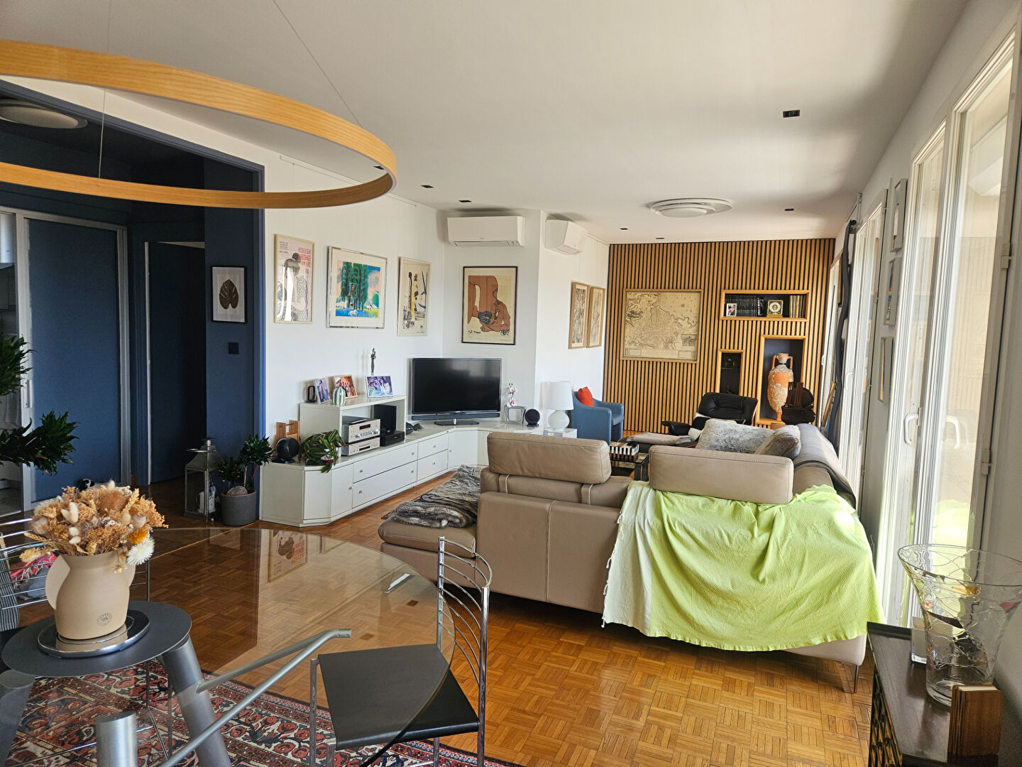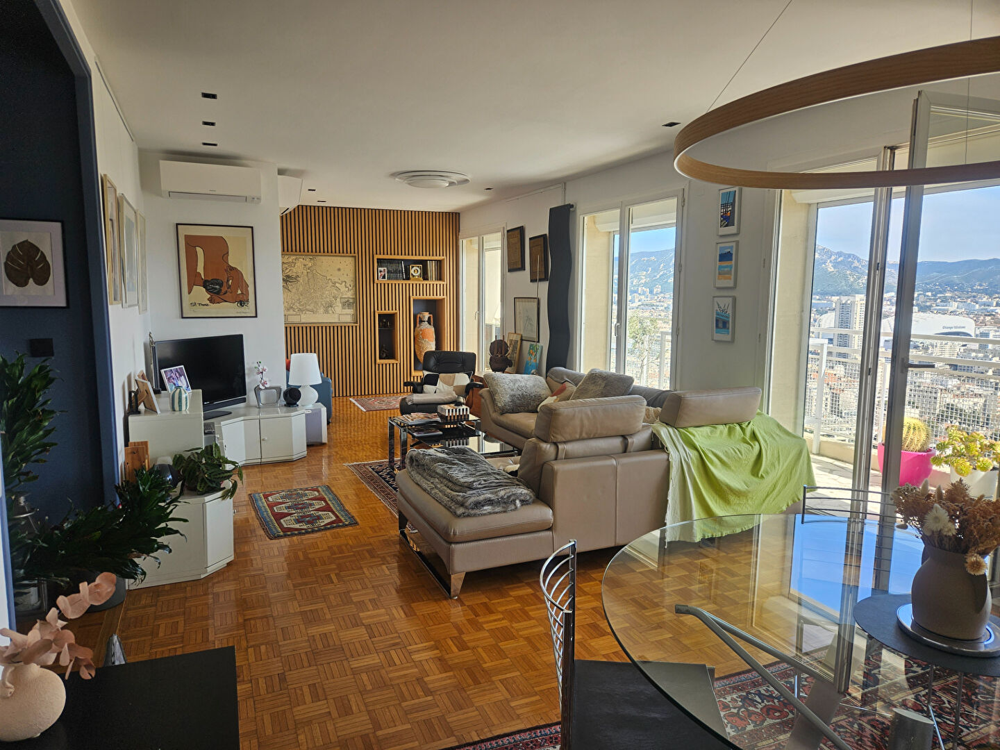 PERIER RÉSIDENCE L'OASIS - MAGNIFIQUE VUE MER ET VILLE/NOTRE DAME DE LA GARDE - Dans une résidence sécurisée avec gardien à deux pas de toutes les commerces et écoles, APPARTEMENT D'EXCEPTION contemporain EN EXCELLENT ÉTAT type 5 d'environ 110m², en TRIPLE EXPOSITION, séjour double d'env. 40 m², orienté PLEIN SUD donnant sur un profond balcon exploitable (repas à 6), sans aucun vis à vis et au CALME ABSOLU, cuisine équipée prolongée par un grand cellier/lingerie aménagé, 3 chambres (possibilité 4), une salle de bains/baignoire, une salle d'eau/douche, 2 WC. Double vitrage partout. Cave et box garage fermé avec borne de recharge. (En supplément 30 000 euros). Charges annuelles 4 700 euros comprenant le chauffage, l'eau, le gardiennage et le syndic. Taxes foncières 2771 euros Honoraires d'Agence 3.5% à la charge vendeur. Mandat 260294 Copropriété de 172 lots - dont 52 lots habitation. Charges annuelles : 4700 euros.