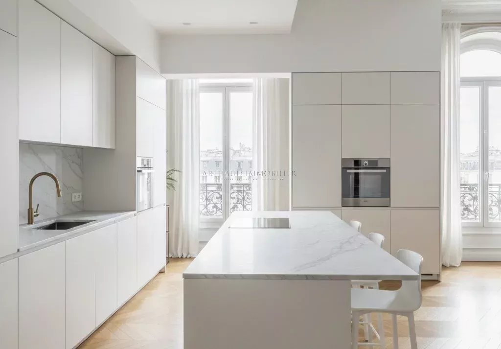 Situé au 5e étage d’un immeuble Haussmannien entièrement rénové, cet appartement traversant reflète l’élégance parisienne.