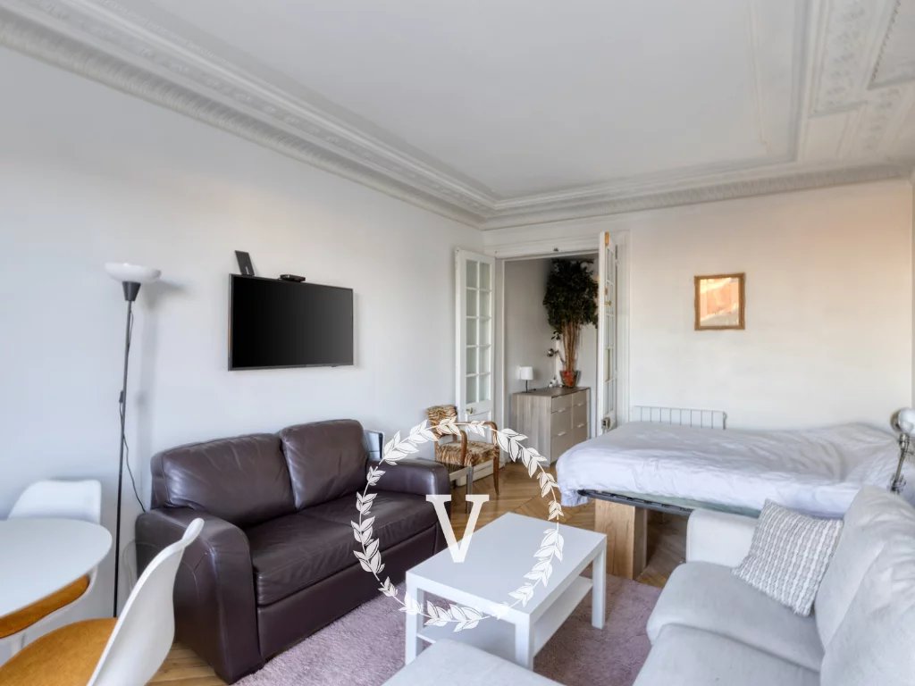 Charmant 2 pièces meublé au 5ème étage avec ascenseur, il se compose d’une entrée, d’un salon avec balcon (vue sur tout Paris), une salle à manger avec cuisine équipée et aménagée, une chambre fermée sur cour, une salle d’eau et un WC séparé.